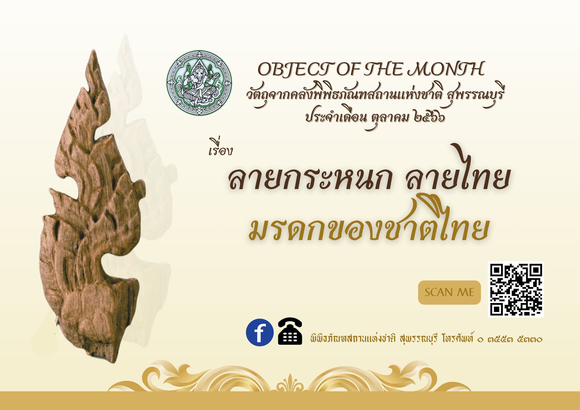 พิพิธภัณฑสถานแห่งชาติ สุพรรณบุรี เชิญชมนิทรรศการหมุนเวียน "Object of the Month" วัตถุจากคลังพิพิธภัณฑสถานแห่งชาติ สุพรรณบุรี ประจำเดือน "ตุลาคม" เชิญพบกับ "ลายกระหนก ลายไทย มรดกของชาติ" จัดแสดงให้ชมระหว่างวันที่ ๑ - ๓๑ ตุลาคม ๒๕๖๖