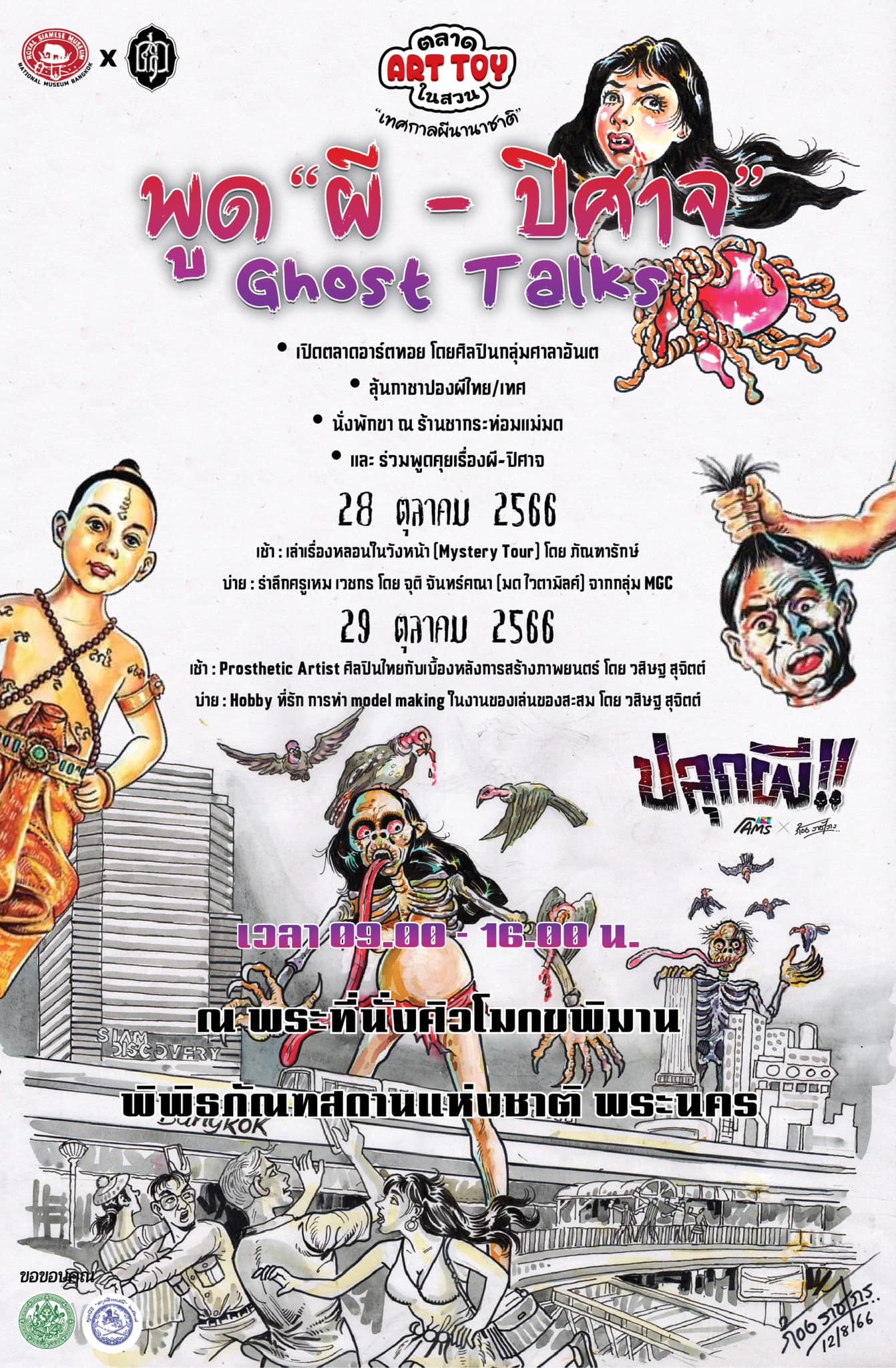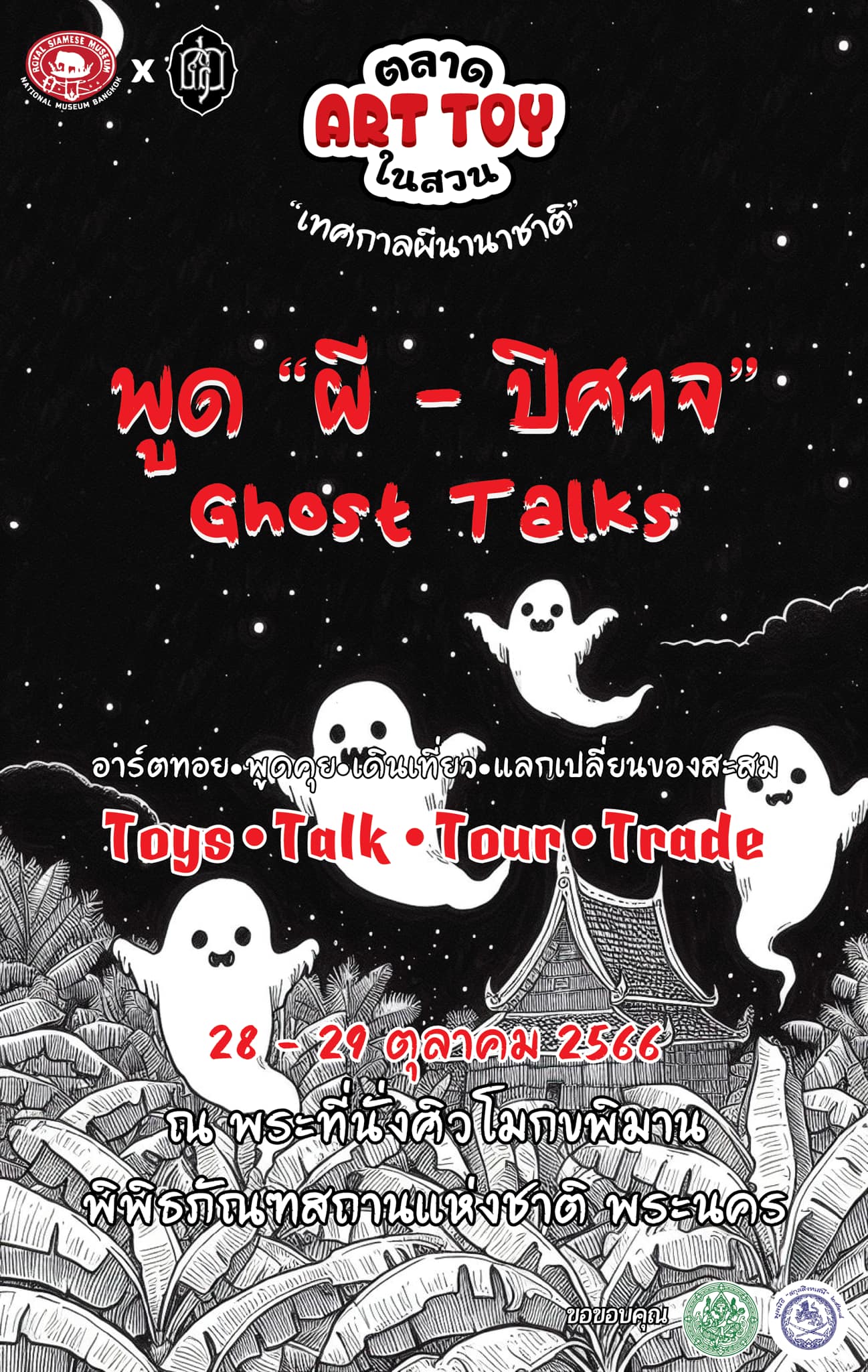 พิพิธภัณฑสถานแห่งชาติ พระนคร ขอเชิญเที่ยวชมตลาดอาร์ตทอยในสวน (Art Toys Market in the Garden) ประจำเดือนตุลาคม ๒๕๖๖ เนื่องในเทศกาลผีนานาชาติ “พูด ผี-ปีศาจ” (Ghost Talks) วันเสาร์และอาทิตย์ที่ ๒๘ - ๒๙ ตุลาคม ๒๕๖๖ ตั้งแต่เวลา ๐๙.๐๐ น. - ๑๖.๐๐ น. ณ พระที่นั่งศิวโมกขพิมาน พิพิธภัณฑสถานแห่งชาติ พระนคร พบกับกิจกรรมหลากหลาย ดังนี้