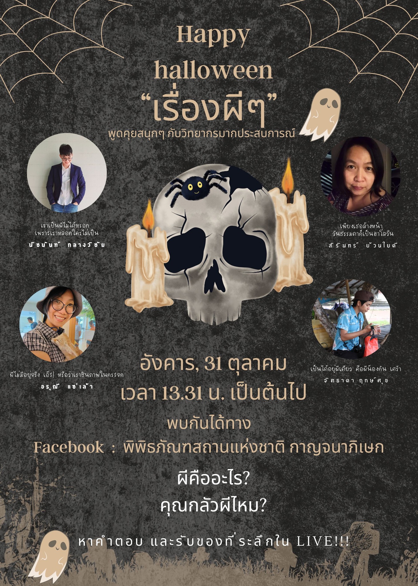 พิพิธภัณฑสถานแห่งชาติ กาญจนาภิเษก ขอเชิญรับชม museum talk Live ในโอกาสพิเศษ "วันฮัลโลวีน พิพิธภัณฑ์ชวนมานั่งคุยเรื่องผีๆ" ในวันที่ 31 ตุลาคม 2566 เวลา 13.31 น. สามารถรับชมได้ผ่านทาง Facebook Page : พิพิธภัณฑสถานแห่งชาติ กาญจนาภิเษก โดยมีวิทยากรจากพิพิธภัณฑสถานแห่งชาติ กาญจนาภิเษก และยังได้รับเกียรติจากวิทยากรรับเชิญ คุณนิชนันท์ กลางวิชัย พิพิธภัณฑ์เมืองอุดรฯ ที่ใกล้ชิดกับงานด้านชาติพันธุ์ และมีเรื่องเล่าสนุกๆ เกี่ยวกับความเชื่อเรื่องผีๆ ของคนใกล้ตัวมาแลกเปลี่ยนประสบการณ์ให้ฟังกันอีกด้วย
