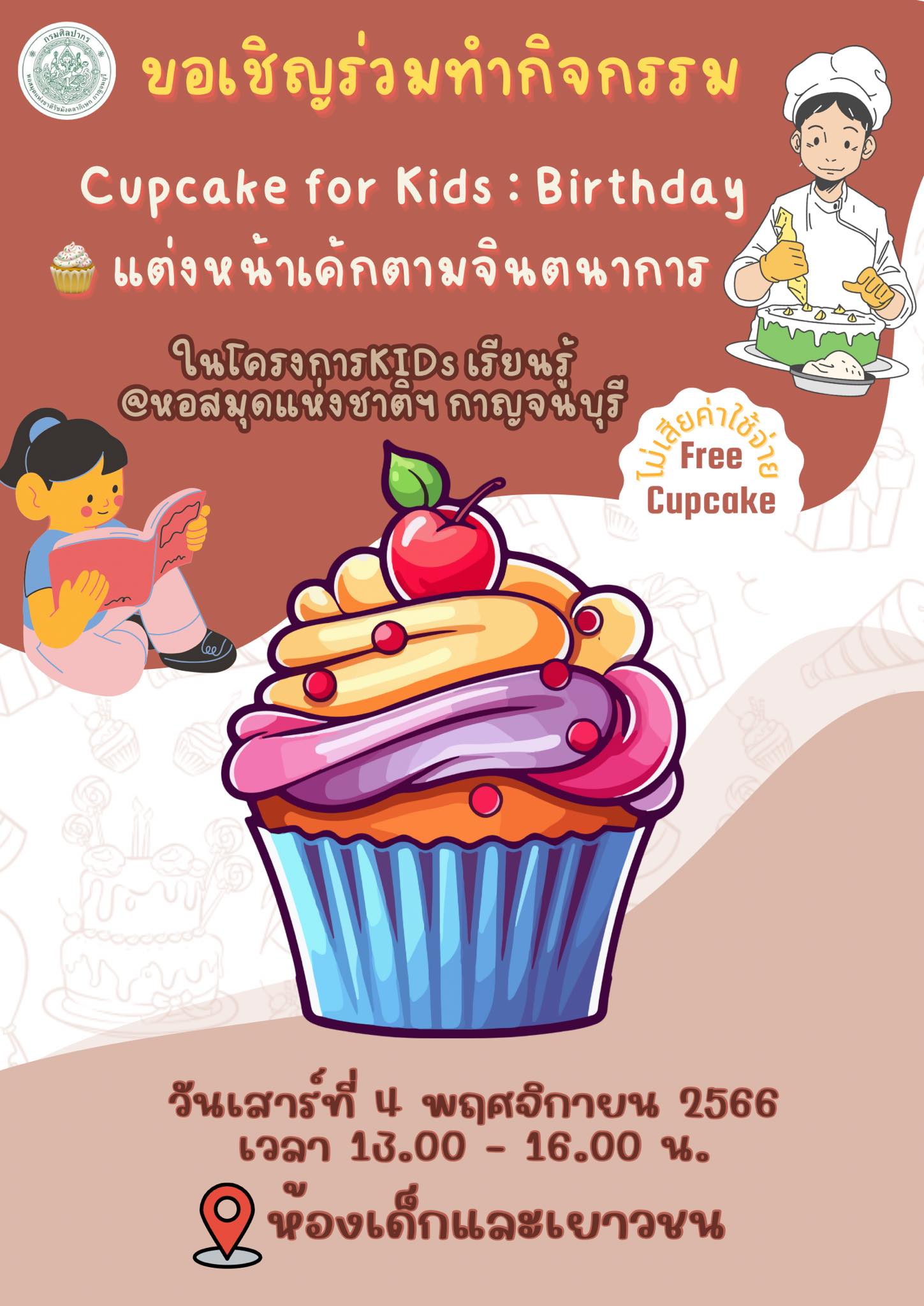 หอสมุดแห่งชาติรัชมังคลาภิเษก กาญจนบุรี ขอเชิญร่วมทำกิจกรรม "Cupcake for Kids : Birthday" ในโครงการKidsเรียนรู้@ หอสมุดแห่งชาติฯ กาญจนบุรี ในวันเสาร์ที่ 4 พฤศจิกายน 2566 เวลา 13.00 - 16.00 น. ณ ห้องเด็กและเยาวชน 102 หอสมุดแห่งชาติรัชมังคลาภิเษก กาญจนบุรี