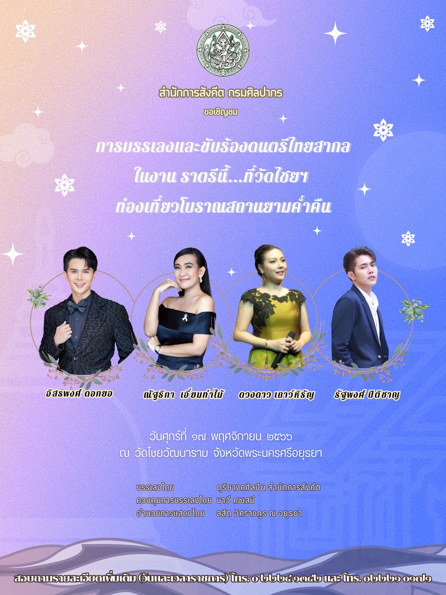 สำนักการสังคีต กรมศิลปากร ขอเชิญชมการบรรเลงและขับร้องดนตรีไทยสากล ในงาน "ราตรีนี้...ที่วัดไชยฯ" ท่องเที่ยวโบราณสถานยามค่ำคืน ในวันศุกร์ที่ 17 พฤศจิกายน 2566 ณ วัดไชยวัฒนาราม จังหวัดพระนครศรีอยุธยา พบกับศิลปินนักร้องจากสำนักการสังคีต ได้แก่ ดวงดาว เถาว์หิรัญ อิสรพงศ์ ดอกยอ รัฐพงศ์ ปิติชาญ และณัฐริกา เอี่ยมท่าไม้ บรรเลงเพลงโดย ดุริยางคศิลปิน สำนักการสังคีต ควบคุมการบรรเลงโดย นาวี คชเสนี อำนวยการแสดงโดย นายลสิต อิศรางกูร ณ อยุธยา สอบถามรายละเอียดเพิ่มเติม (วันและเวลาราชการ) โทร. 0 2224 1342 และ โทร. 0 2221 0171