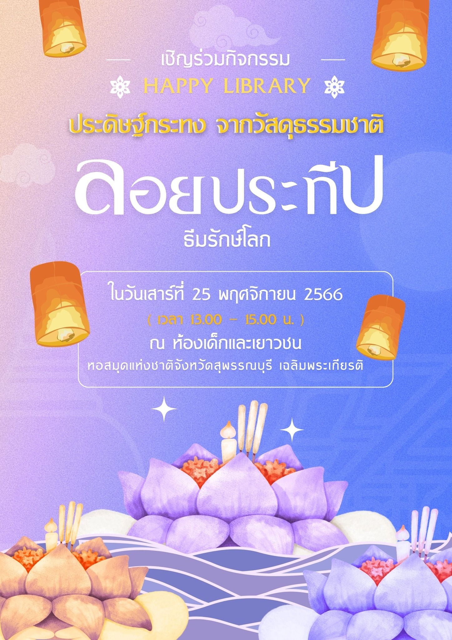 หอสมุดแห่งชาติจังหวัดสุพรรณบุรี เฉลิมพระเกียรติ ขอเชิญชวนน้องๆหนูๆ มาทำกิจกรรมประดิษฐ์กระทง จากวัสดุจากธรรมชาติ ณ ห้องเด็กและเยาวชน หอสมุดแห่งชาติจังหวัดสุพรรณบุรี เฉลิมพระเกียรติ ในวันเสาร์ ที่ 25 พฤศจิกายน 2566 เวลาตั้งแต่ 13.00-15.00 น. (หรือจนกว่าของจะหมด) สามารถร่วมกิจกรรมได้ฟรี ไม่เสียค่าใช้จ่าย สอบถามเพิ่มเติมได้ที่กล่องข้อความ Inbox : m.me/500070696815966 ทางเฟสบุ๊ก : หอสมุดแห่งชาติจังหวัดสุพรรณบุรี เฉลิมพระเกียรติ หรือทางหมายเลขโทรศัพท์ 0 3553 5343 ต่อ 17 (ในวันและเวลาราชการ)