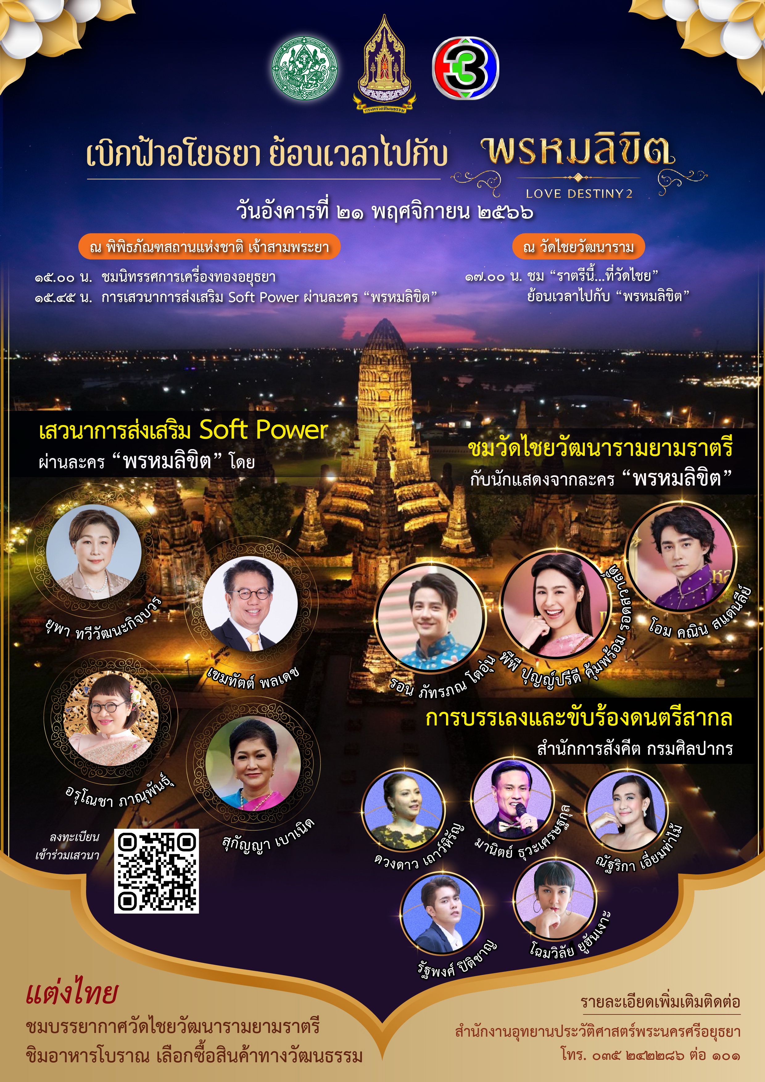 กระทรวงวัฒนธรรม โดยกรมศิลปากร ร่วมกับสถานีโทรทัศน์ไทยทีวีสีช่อง 3 ขอเชิญชวนทุกท่านร่วมกิจกรรมส่งเสริม Soft Power เบิกฟ้าอโยธยา ย้อนเวลาไปกับ “พรหมลิขิต” ในวันอังคารที่ ๒๑ พฤศจิกายน ๒๕๖๖ ในเวลา ๑๕.๐๐ น. ณ อาคารเครื่องทองอยุธยา พิพิธภัณฑสถานแห่งชาติ เจ้าสามพระยา และเยี่ยมชมวัดไชยวัฒนาราม จังหวัดพระนครศรีอยุธยายามค่ำ พบกับศิลปิน โอม-คณิน สแตนลีย์ รับบทหลวงชิดภูบาล (ยอร์จ ฟอลคอน) พีพี-ปุญญ์ปรีดี คุ้มพร้อม รอดสวาสดิ์ รับบทแม่ปราง และรอน- ภัทรภณ โตอุ่น รับบทเป็นเพิ่ม บ่าวยายกุย ฯลฯ ผู้สนใจสามารถลงทะเบียนร่วมกิจกรรม ด่วน!!! https://forms.gle/Xxt6v3rxCfnUChJq5