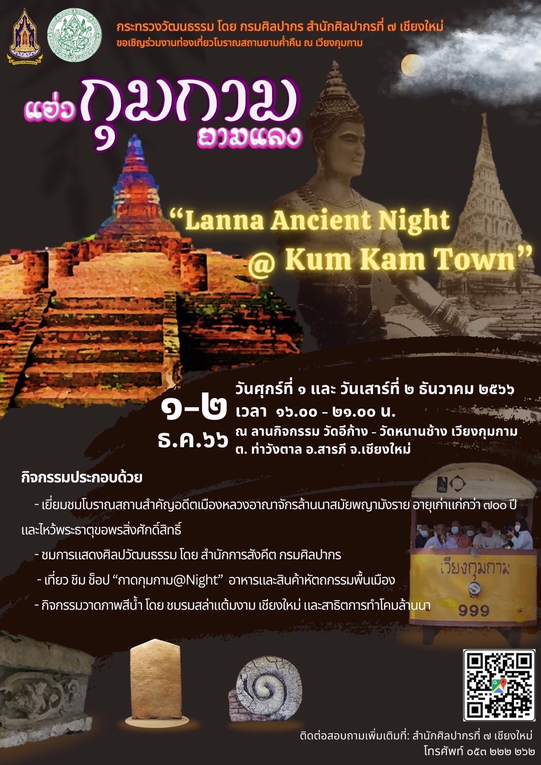 กระทรวงวัฒนธรรม โดย กรมศิลปากร สำนักศิลปากรที่ 7 เชียงใหม่ และสำนักงานวัฒนธรรมจังหวัดเชียงใหม่ ขอเชิญร่วมงานท่องเที่ยวโบราณสถานยามค่ำคืน ณ เวียงกุมกาม “แอ่วกุมกามยามแลง” “Lanna Ancient Night@Kum Kam Town” กิจกรรมภายในงาน ประกอบด้วย