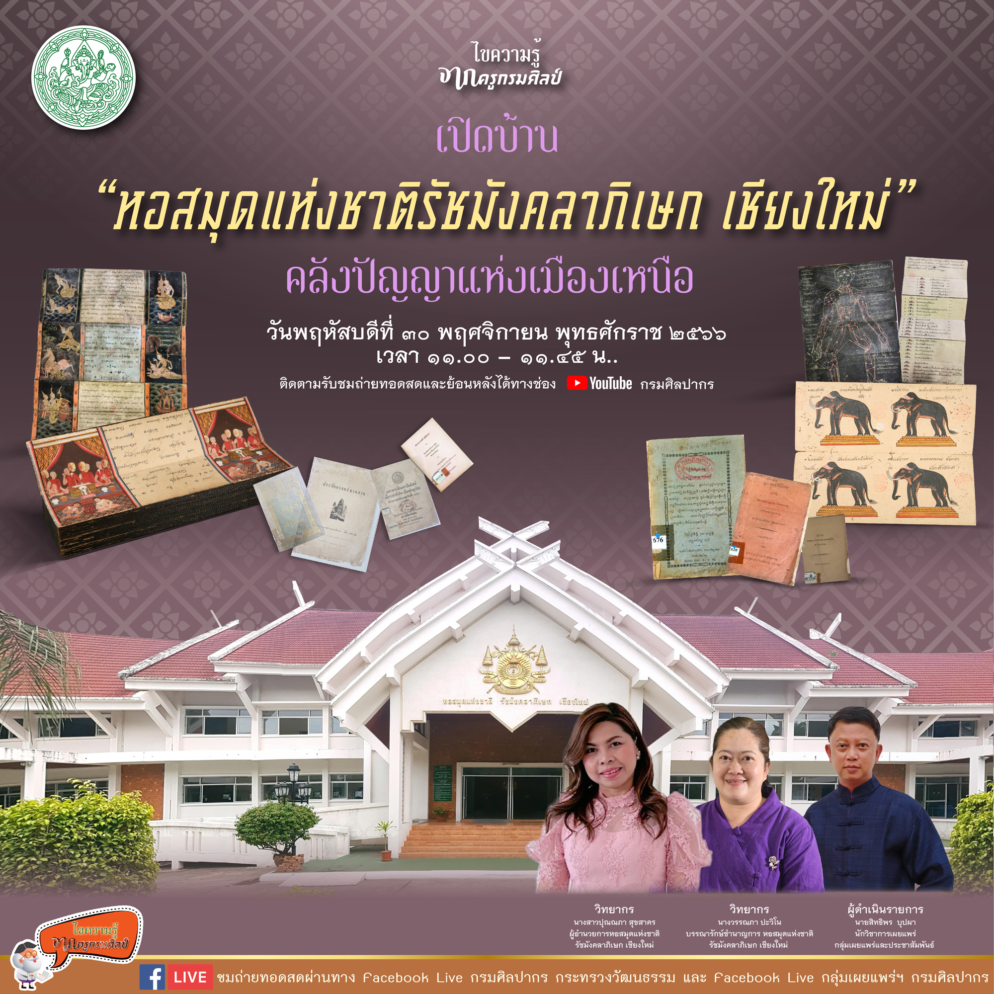 ขอเชิญรับชม Facebook Live รายการไขความรู้จากครูกรมศิลป์ ตอน เปิดบ้าน “หอสมุดแห่งชาติรัชมังคลาภิเษก เชียงใหม่”