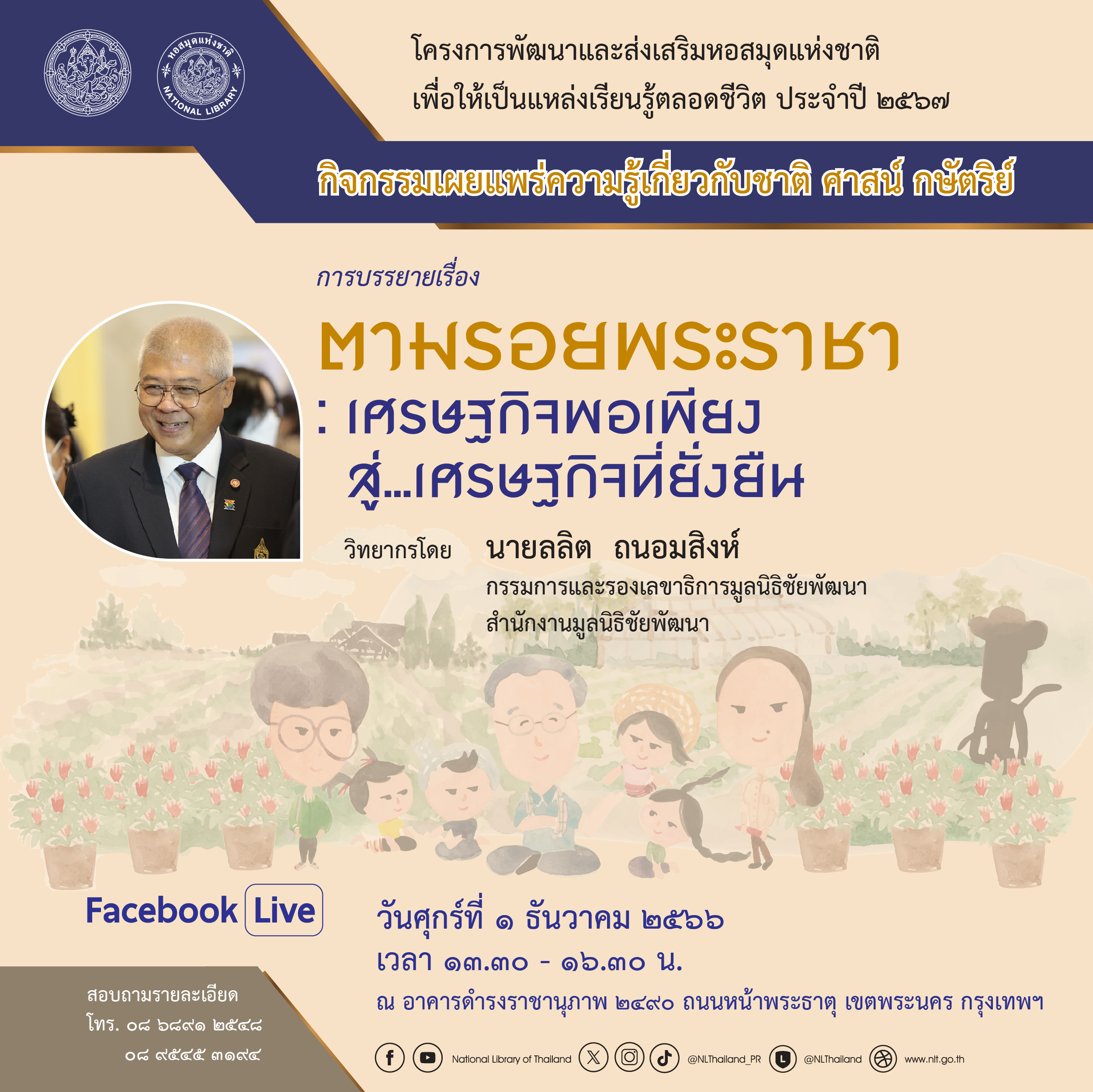 สำนักหอสมุดแห่งชาติ ขอเชิญฟังการบรรยายเรื่อง "ตามรอยพระราชา: เศรษฐกิจพอเพียง...สู่เศรษฐกิจที่ยั่งยืน" ซึ่งเป็นส่วนหนึ่งของกิจกรรมเผยแพร่ความรู้เกี่ยวกับชาติ ศาสน์ กษัตริย์ ภายใต้โครงการพัฒนาและส่งเสริมหอสมุดแห่งชาติเพื่อให้เป็นแหล่งเรียนรู้ตลอดชีวิต ประจำปี 2567 วิทยากรโดย นายลลิต ถนอมสิงห์ กรรมการและรองเลขานุการมูลนิธิชัยพัฒนา สำนักงานมูลนิธิชัยพัฒนา ในวันศุกร์ ที่ 1 ธันวาคม 2566 เวลา 13.30-16.30 น. ณ อาคารดำรงราชานุภาพ ถนนหน้าพระธาตุ เขตพระนคร กรุงเทพฯ ผู้สนใจสามารถติดตามชมการถ่ายทอดสดผ่าน Facebook Live : National Library of Thailand สอบถามรายละเอียดเพิ่มเติม โทร. 08 6891 2548, 08 9545 3194