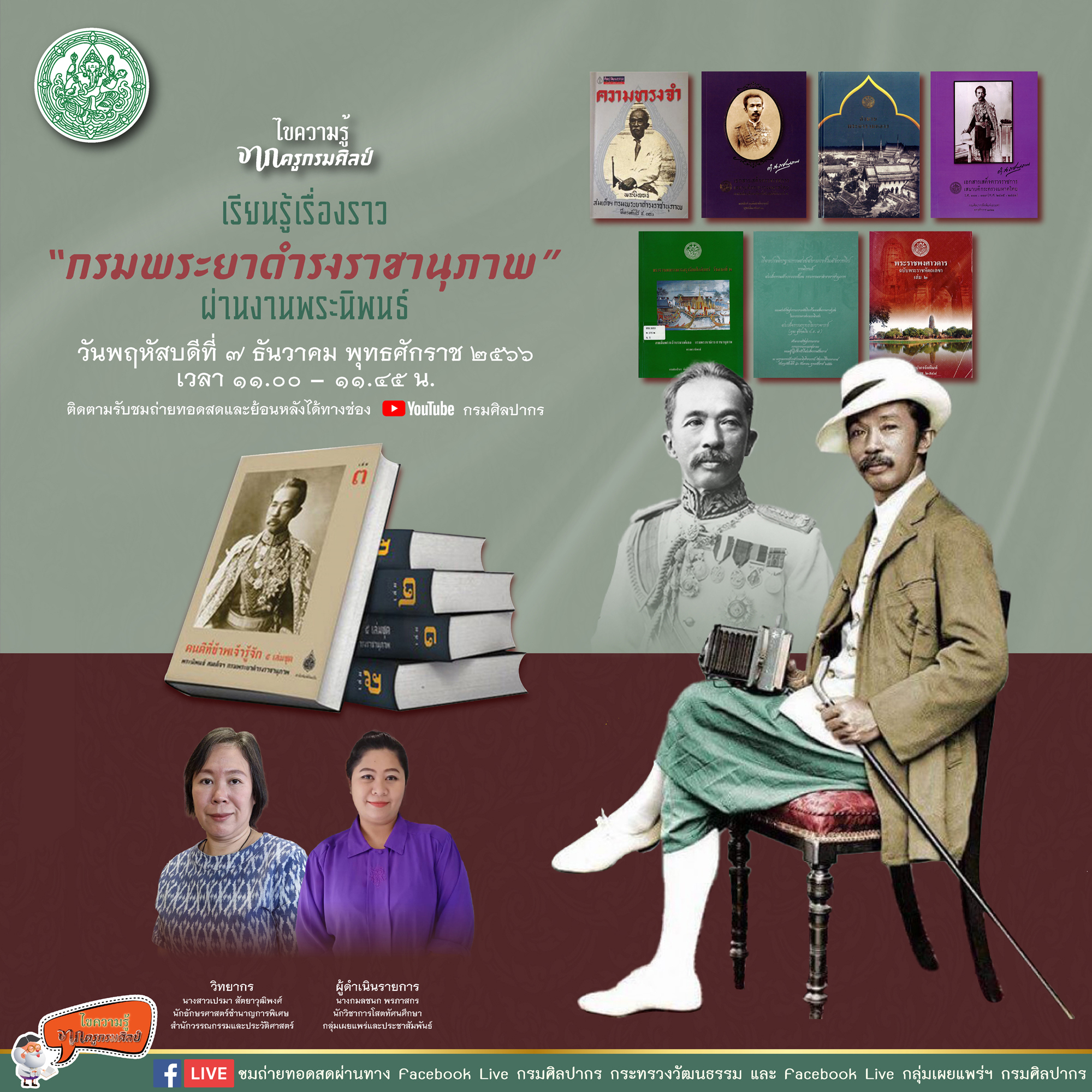 กรมศิลปากร ขอเชิญรับชมถ่ายทอดสด Facebook Live รายการไขความรู้จากครูกรมศิลป์ ตอน เรียนรู้เรื่องราว “กรมพระยาดำรงราชานุภาพ” ผ่านงานพระนิพนธ์ วิทยากร นางสาวเปรมา สัตยาวุฒิพงศ์ นักอักษรศาสตร์ชำนาญการพิเศษ สำนักวรรณกรรมและประวัติศาสตร์ ผู้ดำเนินรายการ นางกมลชนก พรภาสกร นักวิชาการโสตทัศนศึกษา กลุ่มเผยแพร่และประชาสัมพันธ์ ในวันพฤหัสบดีที่ ๗ ธันวาคม พุทธศักราช ๒๕๖๖ เวลา ๑๑.๐๐ – ๑๑.๔๕ น. ผู้สนใจสามารถติดตามชมได้ทาง Facebook Live : กรมศิลปากร กระทรวงวัฒนธรรม และ Facebook Live : กลุ่มเผยแพร่ฯ กรมศิลปากร