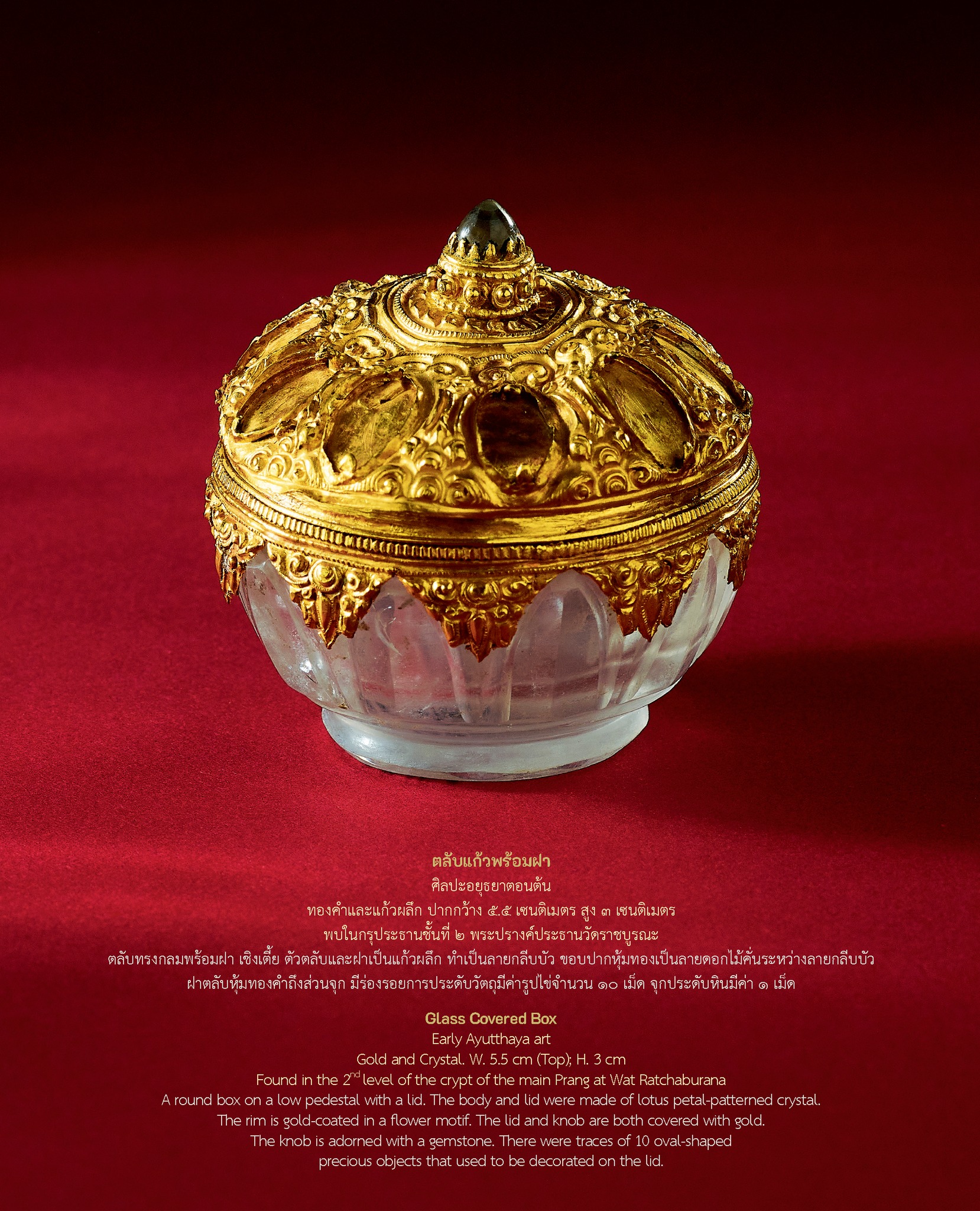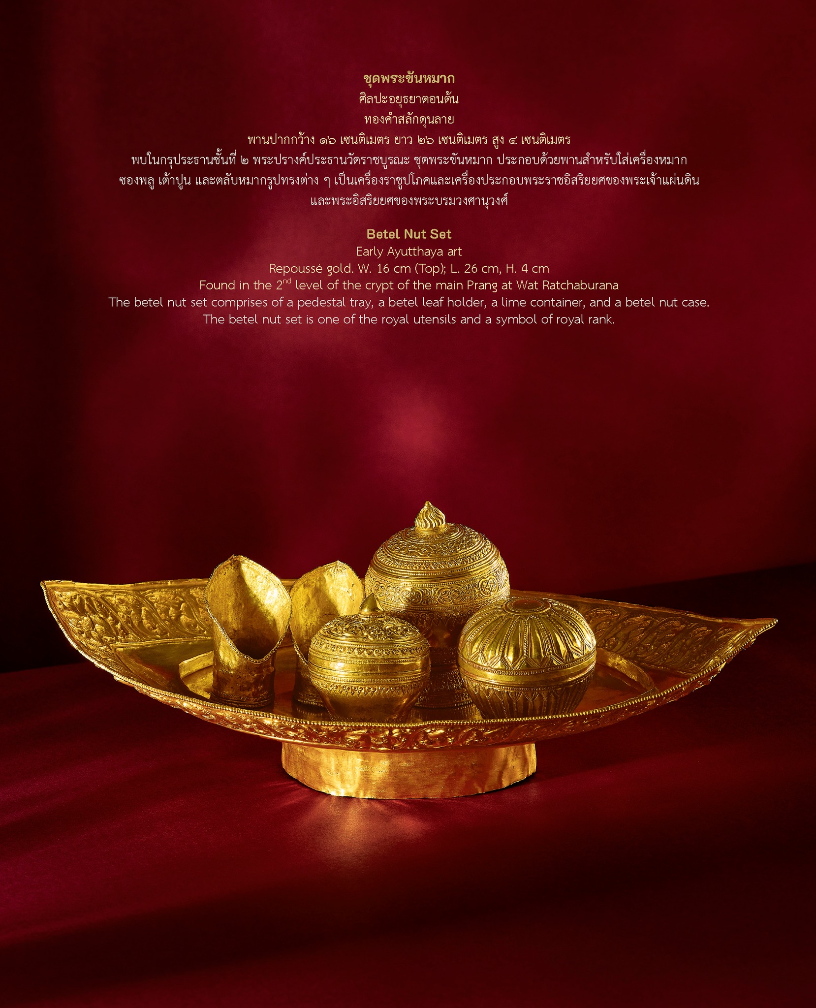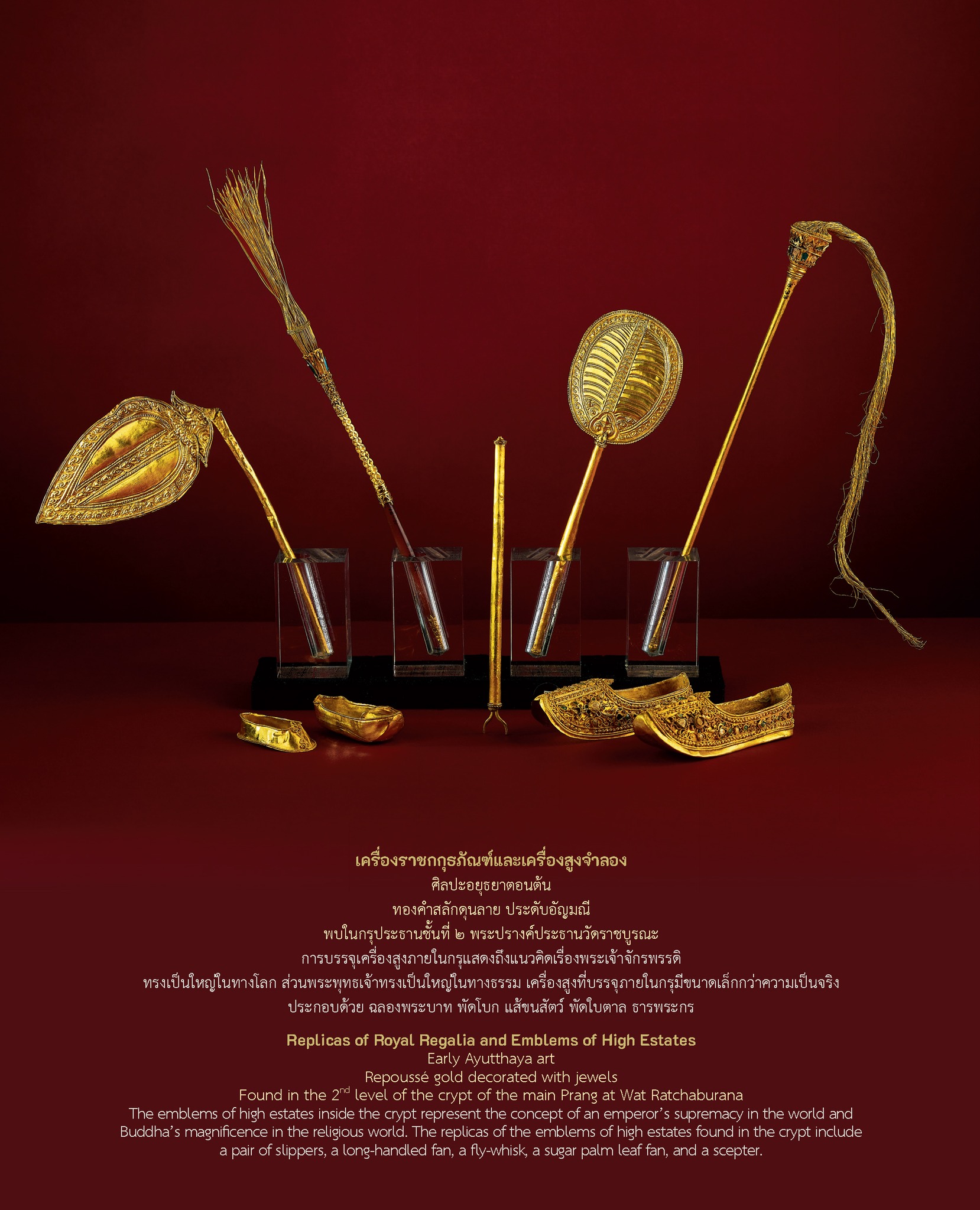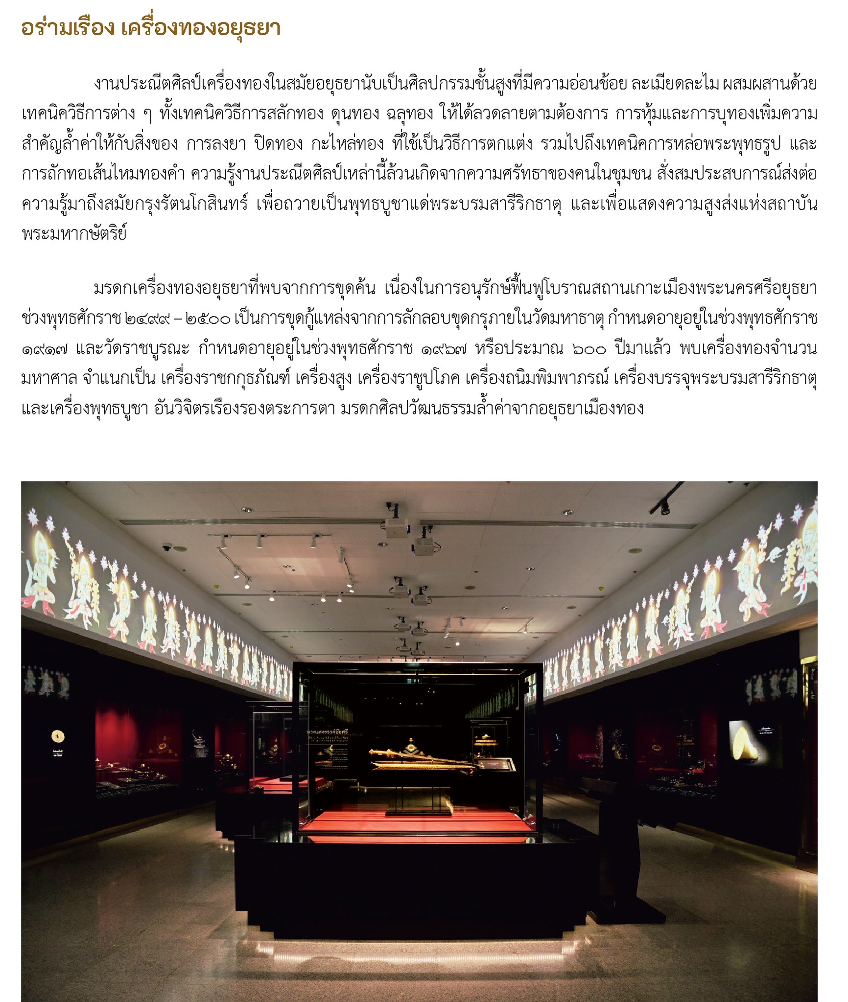 งานประณีตศิลป์เครื่องทองในสมัยอยุธยานับเป็นศิลปกรรมชั้นสูงที่มีความอ่อนช้อย ละเมียดละไม ผสมผสานด้วยเทคนิควิธีการต่าง ๆ ทั้งเทคนิควิธีการสลักทอง ดุนทอง ฉลุทอง ให้ได้ลวดลายตามต้องการ การหุ้มและการบุทองเพิ่มความสำคัญล้ำค่าให้กับสิ่งของ การลงยา ปิดทอง กะไหล่ทอง ที่ใช้เป็นวิธีการตกแต่ง รวมไปถึงเทคนิคการหล่อพระพุทธรูป และการถักทอเส้นไหมทองคำ ความรู้งานประณีตศิลป์เหล่านี้ล้วนเกิดจากความศรัทธาของคนในชุมชน สั่งสมประสบการณ์ส่งต่อความรู้มาถึงสมัยกรุงรัตนโกสินทร์ เพื่อถวายเป็นพุทธบูชาแด่พระบรมสารีริกธาตุ และเพื่อแสดงความสูงส่งแห่งสถาบันพระมหากษัตริย์