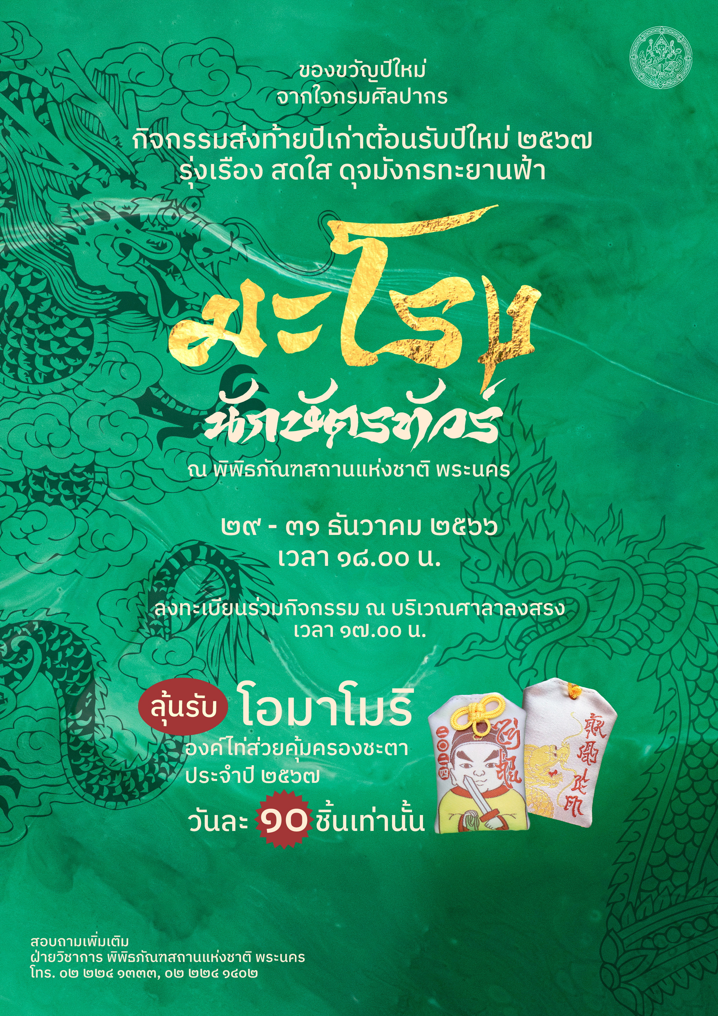 กรมศิลปากรจึงขอเชิญชวนประชาชนเข้าร่วมกิจกรรมของขวัญปีใหม่ เพื่อสร้างความสุข เสริมสิริมงคลให้กับชีวิตในวาระแห่งการเริ่มต้นศักราชใหม่ ในปีมะโรง พุทธศักราช ๒๕๖๗ ติดตามรายละเอียดเพิ่มเติมได้ที่เว็บไซต์กรมศิลปากร www.finearts.go.th