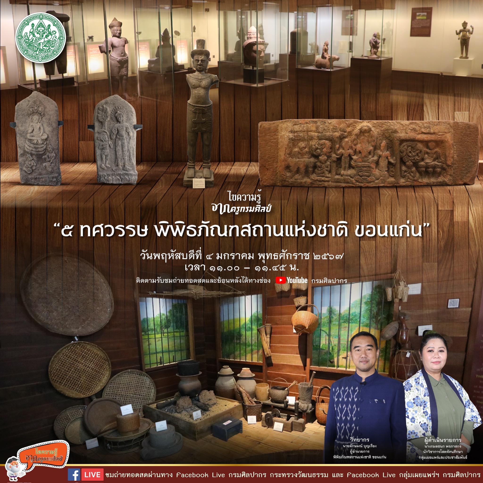 กรมศิลปากร ขอเชิญรับชมถ่ายทอดสด Facebook Live รายการไขความรู้จากครูกรมศิลป์ ตอน “๕ ทศวรรษ พิพิธภัณฑสถานแห่งชาติ ขอนแก่น” วิทยากร นายลักษมณ์ บุญเรือง ผู้อำนวยการพิพิธภัณฑสถานแห่งชาติ ขอนแก่น ผู้ดำเนินรายการ นางกมลชนก พรภาสกร นักวิชาการโสตทัศนศึกษา กลุ่มเผยแพร่และประชาสัมพันธ์ ในวันพฤหัสบดีที่ ๔ มกราคม พุทธศักราช ๒๕๖๗ เวลา ๑๑.๐๐ - ๑๑.๔๕ น.
