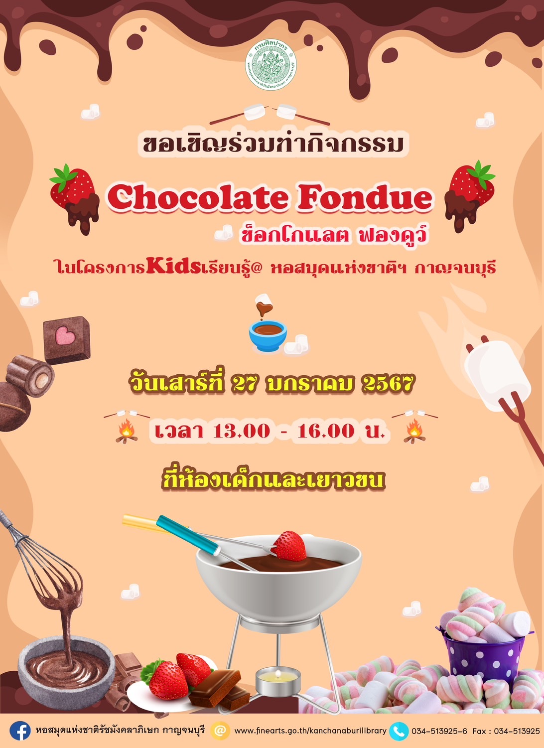 ขอเชิญชวนร่วมกิจกรรม "Chocolate Fondue ช็อกโกแลต ฟองดูว์" ในโครงการKidsเรียนรู้@หอสมุดแห่งชาติฯ กาญจนบุรี
