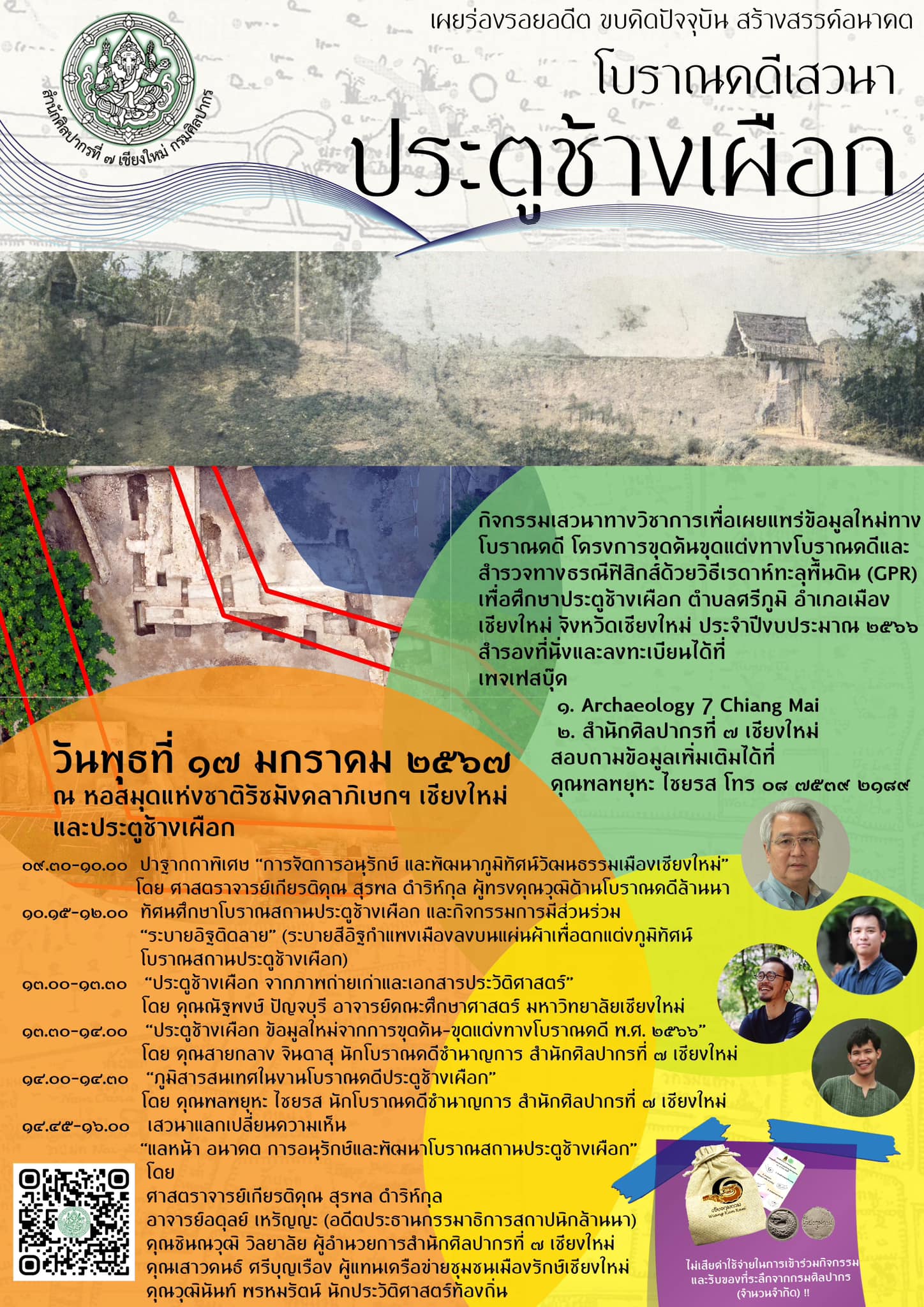 สำนักศิลปากรที่ ๗ เชียงใหม่ จัดกิจกรรมเสวนาทางวิชาการ “โบราณคดีเสวนา ประตูช้างเผือก” ร่วมรับฟังองค์ความรู้จากการดำเนินงานขุดค้น - ขุดแต่งทางโบราณคดีประตูช้างเผือก และการเสวนาแลกเปลี่ยนรับฟังความคิดเห็นต่อแนวทางการอนุรักษ์ และพัฒนาโบราณสถานประตูช้างเผือก ในวันพุธที่ ๑๗ มกราคม ๒๕๖๗ เวลา ๐๘.๓๐ - ๑๖.๓๐ น. ขอเชิญชวนผู้สนใจติดตามรับชมผ่านทาง Facebook Live สำนักศิลปากรที่ ๗ เชียงใหม่ และ Archaeology 7 Chiang Mai