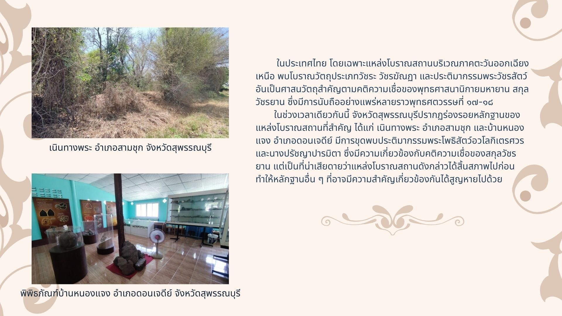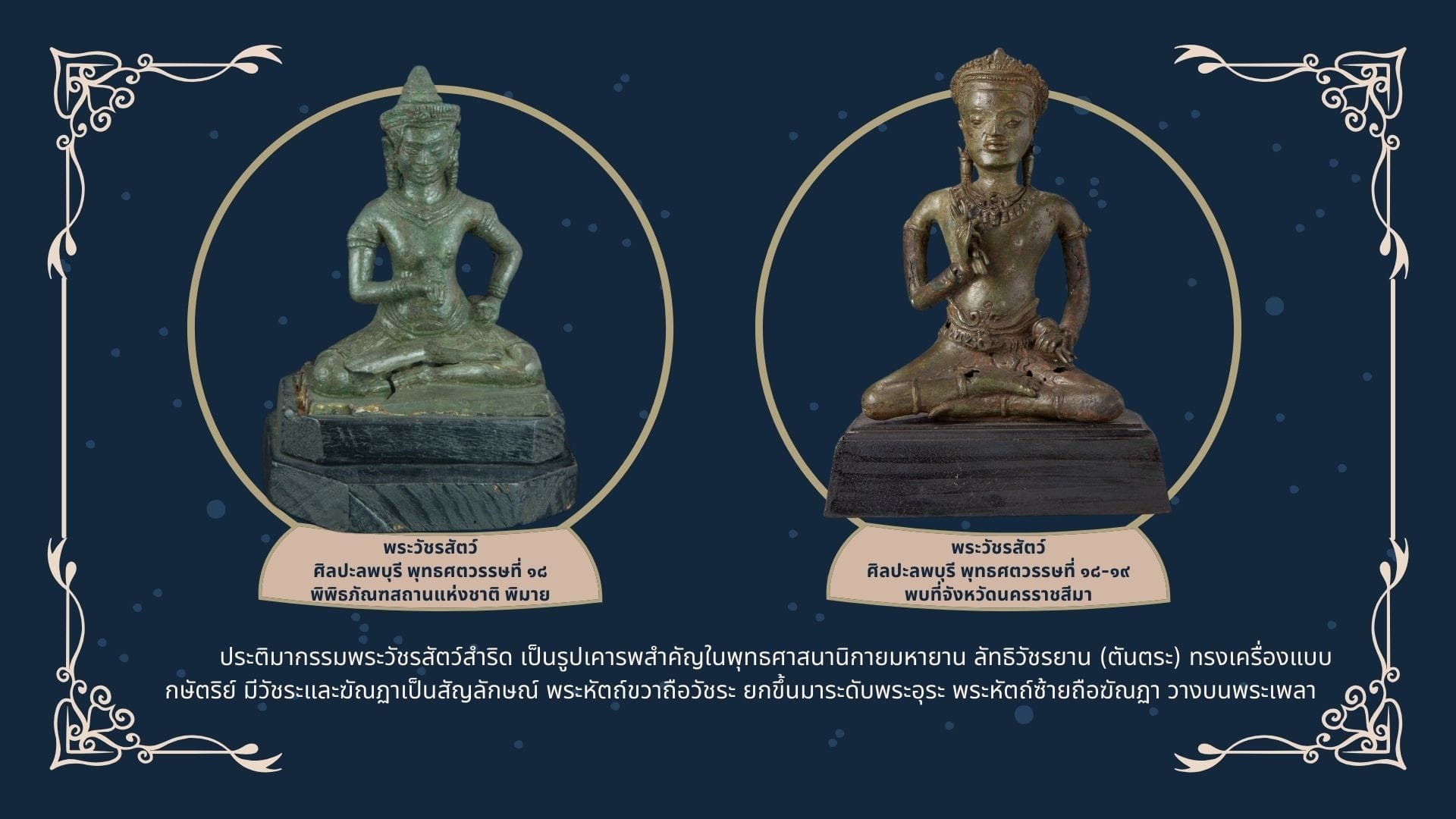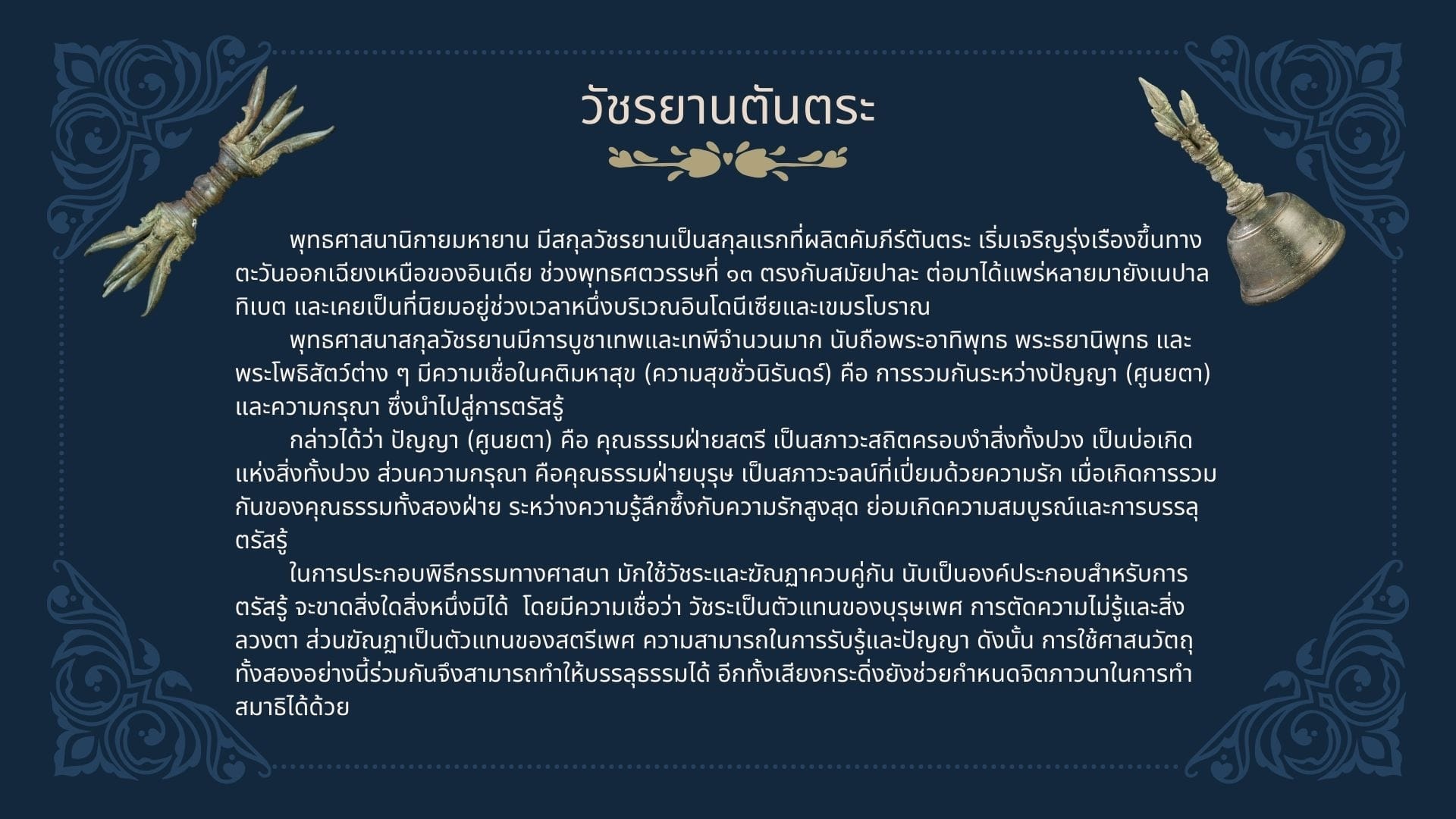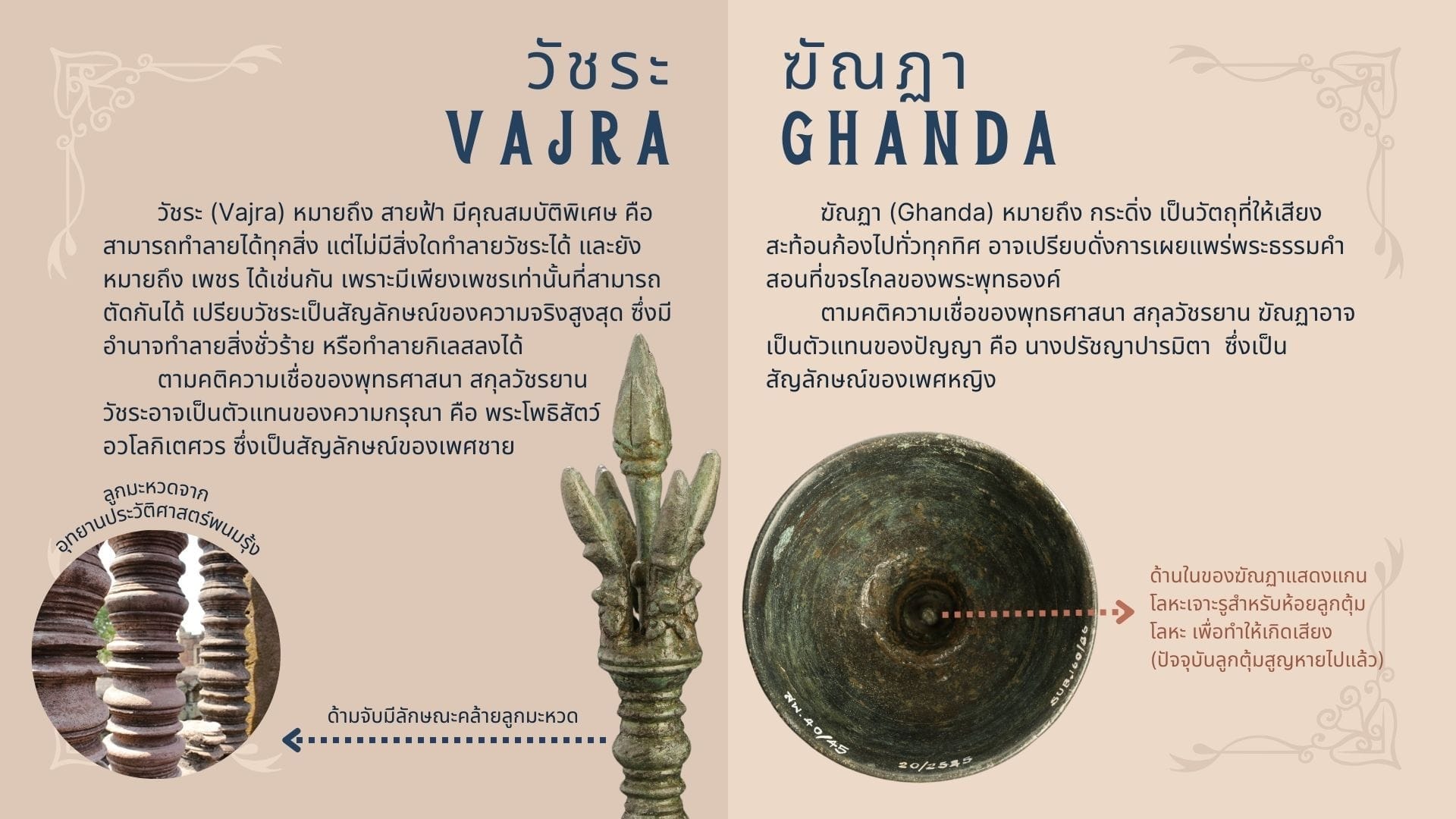 โบราณวัตถุที่นำมาจัดแสดงในนิทรรศการครั้งนี้ ได้แก่ กับ "วัชรฆัณฏา" กระดิ่งยอดวัชระ ขนาดสูง ๑๑.๕ ซม. กว้าง ๕.๗ ซม. ศิลปะลพบุรี พุทธศตวรรษที่ ๑๗ - ๑๘ รูปทรงระฆัง มีด้ามจับเป็นปล้องคล้ายลูกมะหวด ยอดเป็นรูปวัชระ ๕ แฉก ตกแต่งเส้นขีดรอบปาก ลูกตุ้มด้านในหายไป พบในจังหวัดสุพรรณบุรี นิทรรศการให้ความรู้เกี่ยวกับ “วัชระ Vajra” หมายถึง สายฟ้า มีคุณสมบัติพิเศษ คือสามารถทำลายได้ทุกสิ่ง แต่ไม่มีสิ่งใดทำลายวัชระได้ และยังหมายถึง เพชร ได้เช่นกัน ตามคติความเชื่อของพุทธศาสนา สกุลวัชรยานวัชระอาจเป็นตัวแทนของความกรุณา คือ พระโพธิสัตว์อวโลกิเตศวร ซึ่งเป็นสัญลักษณ์ของเพศชาย และความรู้เกี่ยวกับ “ฆัณฎา Ghanda หมายถึง กระดิ่ง เป็นวัตถุที่ให้เสียงสะท้อนก้องไปทั่วทุกทิศ ตามคติความเชื่อของพุทธศาสนา สกุลวัชรยาน ฆัณฏาอาจเป็นตัวแทนของปัญญา คือ นางปรัชญาปารมิตา ซึ่งเป็นสัญลักษณ์ของเพศหญิง