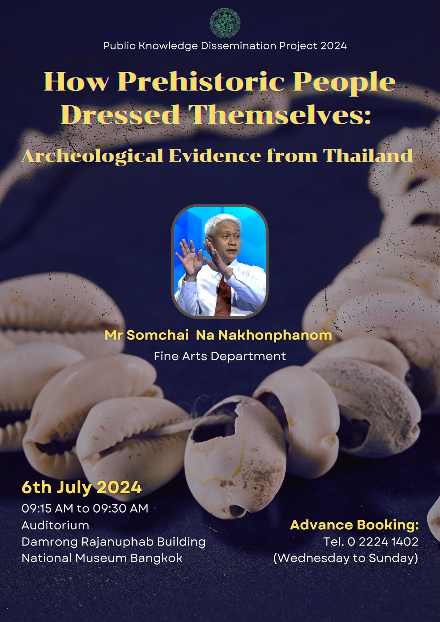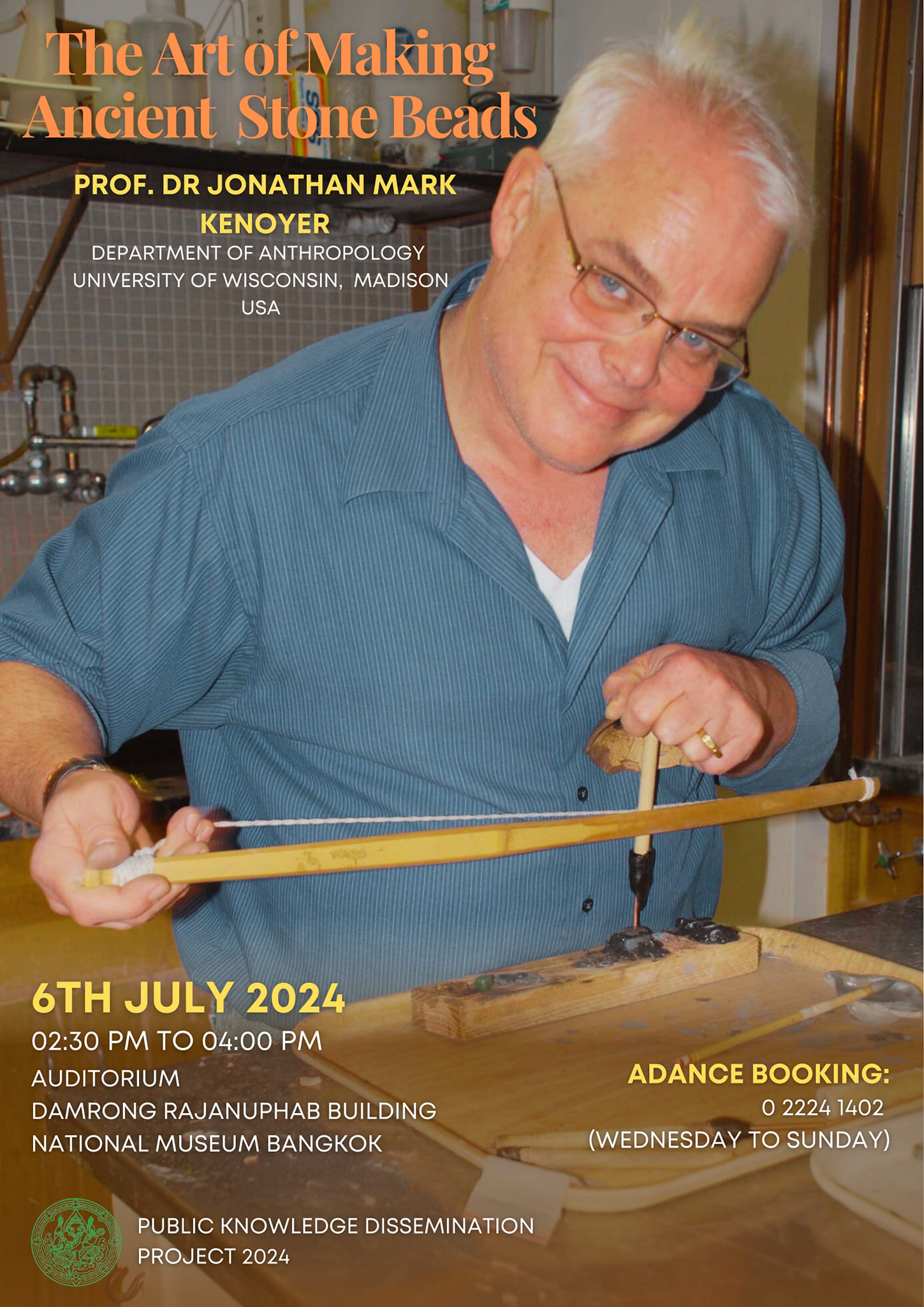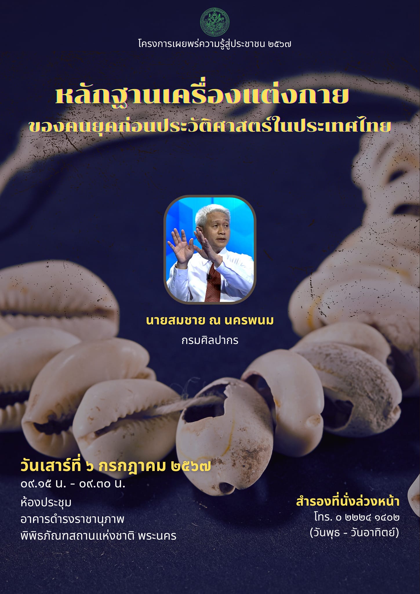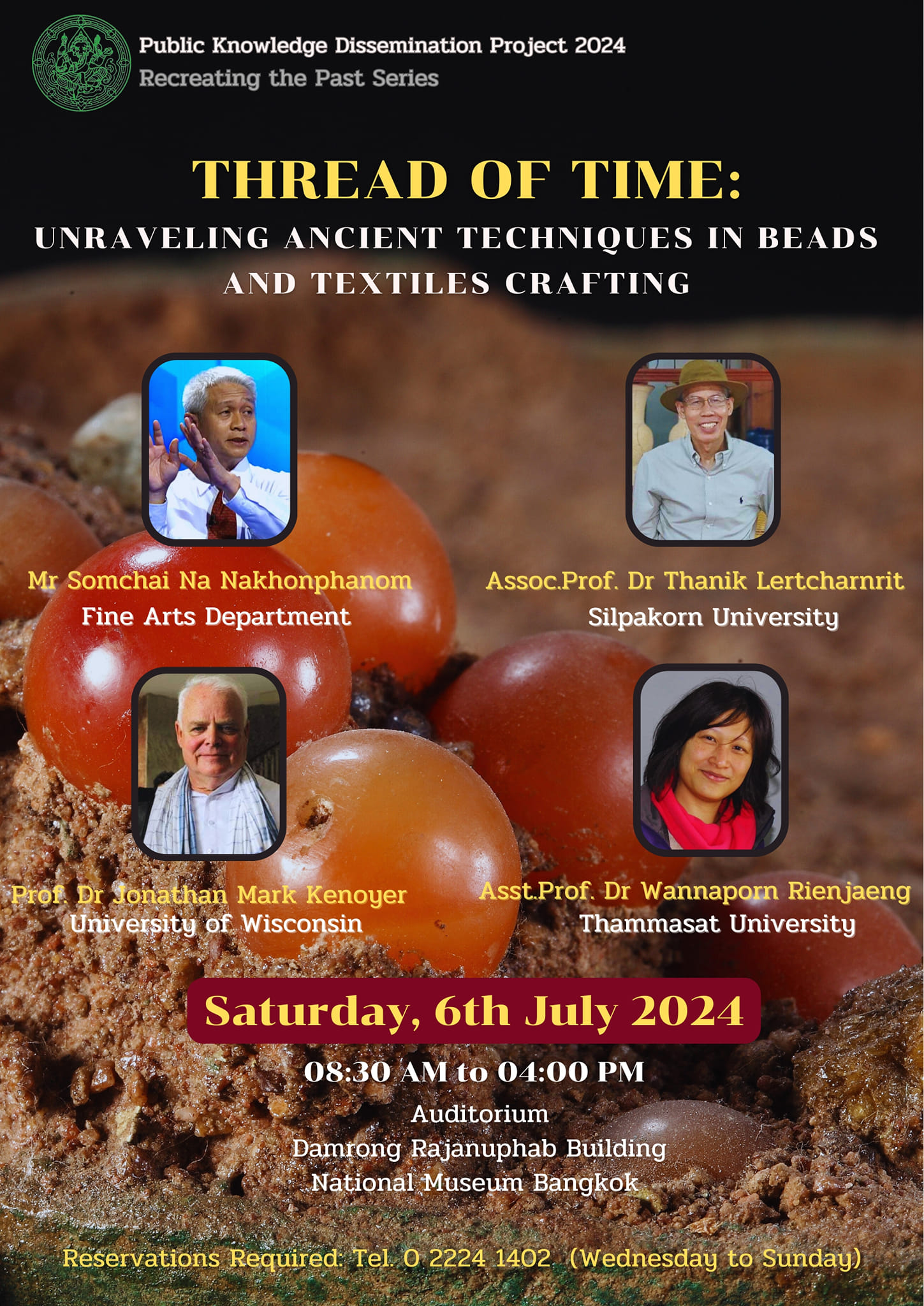 กรมศิลปากร โดยสำนักพิพิธภัณฑสถานแห่งชาติ ขอเชิญผู้สนใจเข้าร่วมกิจกรรมโครงการเผยแพร่ความรู้สู่ประชาชน ประจำปี ๒๕๖๗ เรื่อง "ย้อนอดีต : เทคนิคการทำลูกปัดหินและสิ่งทอสมัยโบราณ" Threads of Time: Unraveling Ancient Techniques in Beads and Textiles Crafting วันเสาร์ที่ ๖ กรกฎาคม ๒๕๖๗ ณ พิพิธภัณฑสถานแห่งชาติ พระนคร