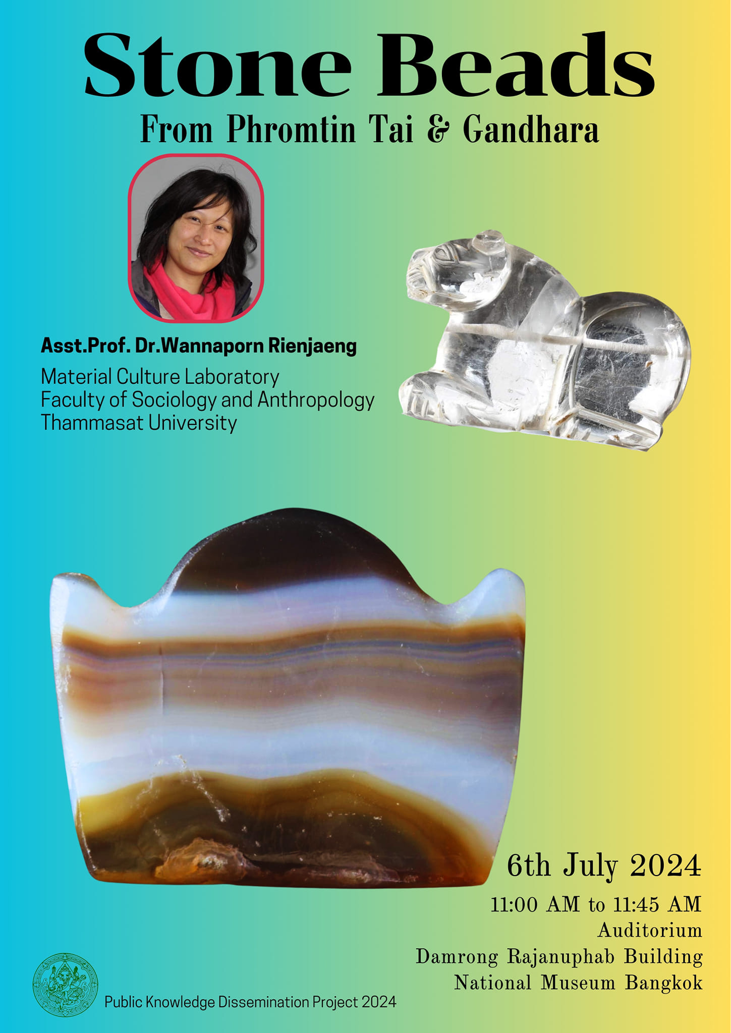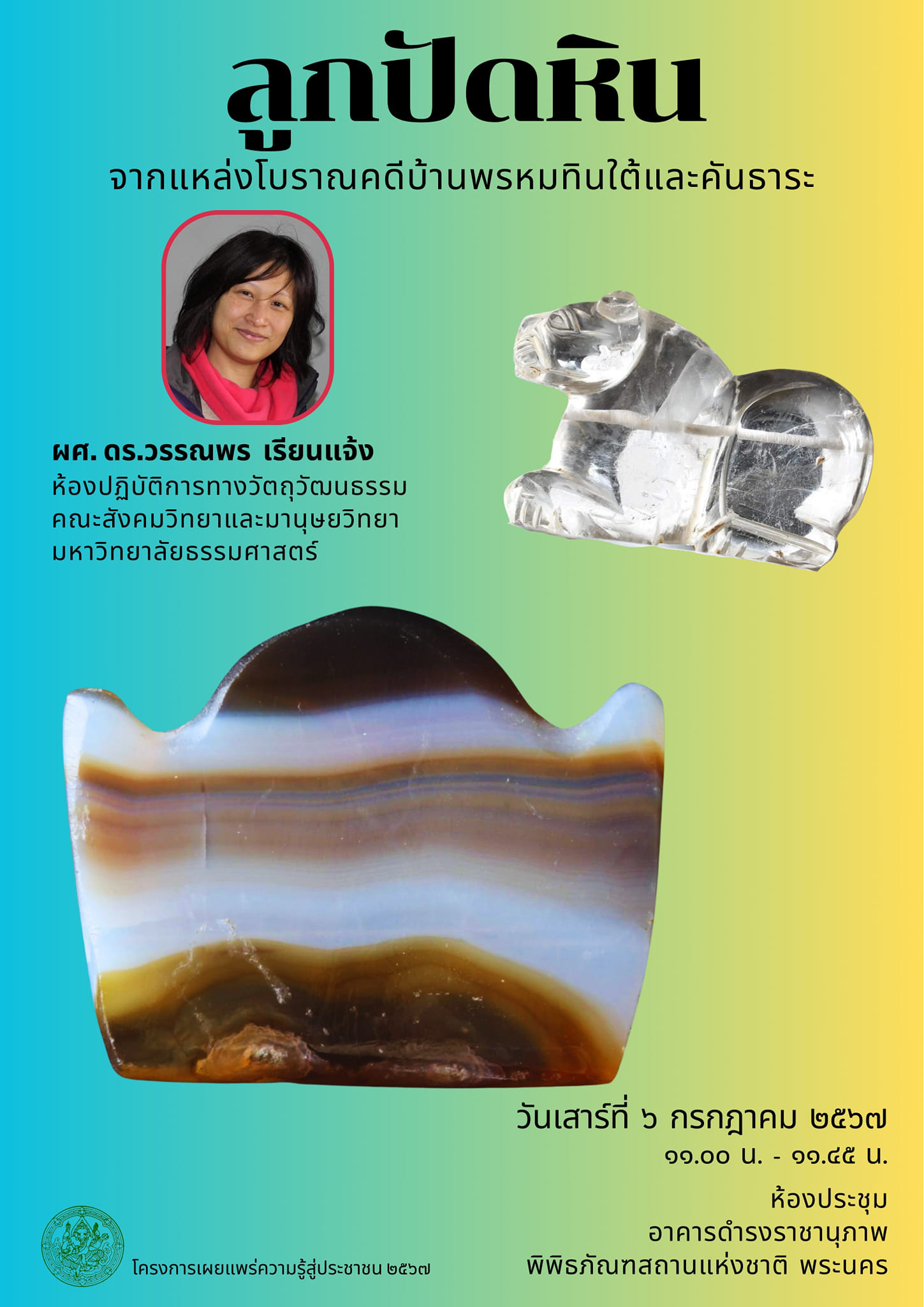 - การบรรยายทางวิชาการ เรื่อง “ลูกปัดหินจากแหล่งโบราณคดีบ้านพรหมทินใต้และคันธาระ“วิทยากรโดย ผศ. ดร.วรรณพร เรียนแจ้ง คณะสังคมวิทยาและมานุษยวิทยา มหาวิทยาลัยธรรมศาสตร์