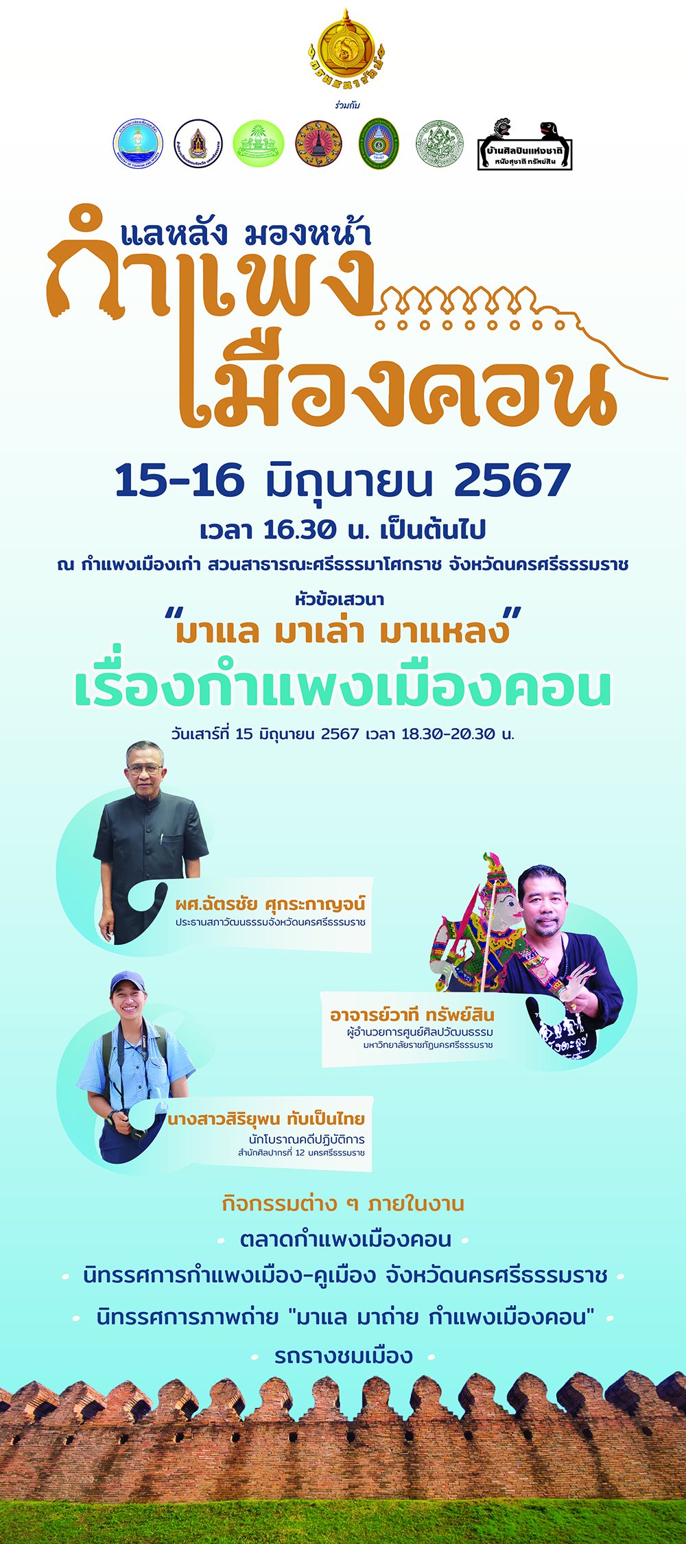 กรมธนารักษ์ กรมศิลปากร ร่วมกับหน่วยงานเครือข่ายในจังหวัดนครศรีธรรมราช ขอเชิญเข้าร่วมงาน “แลหลัง มองหน้า กำแพงเมืองคอน” ระหว่างวันที่ 15-16 มิถุนายน 2567 ตั้งแต่เวลา 16.30 น. ณ กำแพงเมืองเก่า สวนสาธารณะศรีธรรมาโศกราช จังหวัดนครศรีธรรมราช และขอเชิญรับฟังการเสวนา หัวข้อ “มาแล มาเล่า มาแหลง เรื่องกำแพงเมืองคอน” วิทยากรโดย ผศ.ฉ้ตรชัย ศุกระกาญจน์ ประธานสภาวัฒนธรรมจังหวัดนครศรีธรรมราช อาจารย์วาที ทรัพย์สิน ผู้อำนวยการศูนย์ศิลปวัฒนธรรม มหาวิทยาลัยราชภัฎนครศรีธรรมราช และนางสาวสิริยุพน ทับเป็นไทย นักโบราณคดีปฏิบัติการ สำนักศิลปากรที่ 12 นครศรีธรรมราช วันเสาร์ที่ 15 มิถุนายน 2567 เวลา 18.30-20.30 น. ณ กำแพงเมืองเก่า สวนสาธารณะศรีธรรมาโศกราช จังหวัดนครศรีธรรมราช