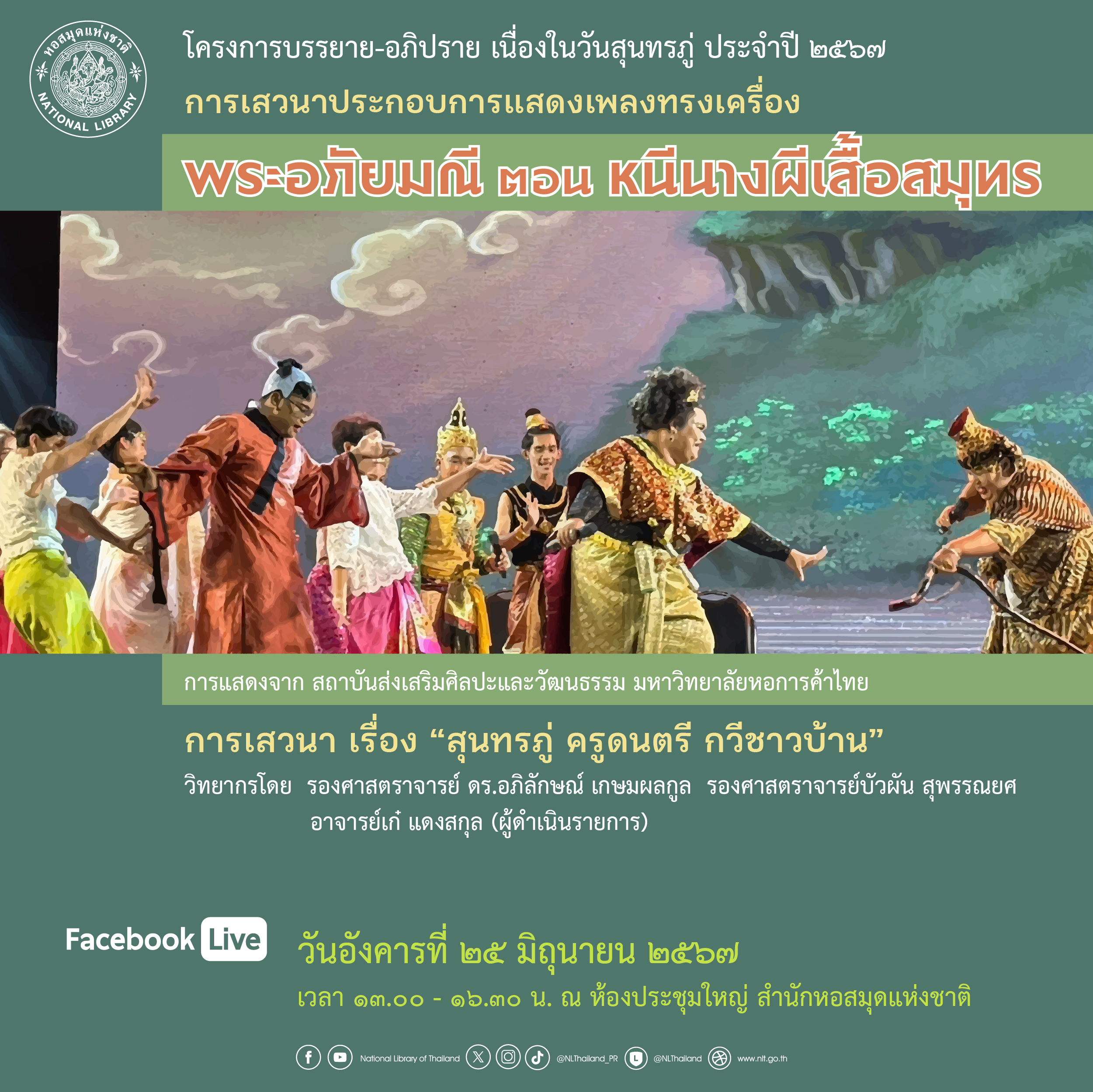 ขอเชิญฟังการเสวนาประกอบการแสดงเพลงทรงเครื่อง เรื่อง “พระอภัยมณี ตอน หนีนางผีเสื้อสมุทร” เนื่องในวันสุนทรภู่