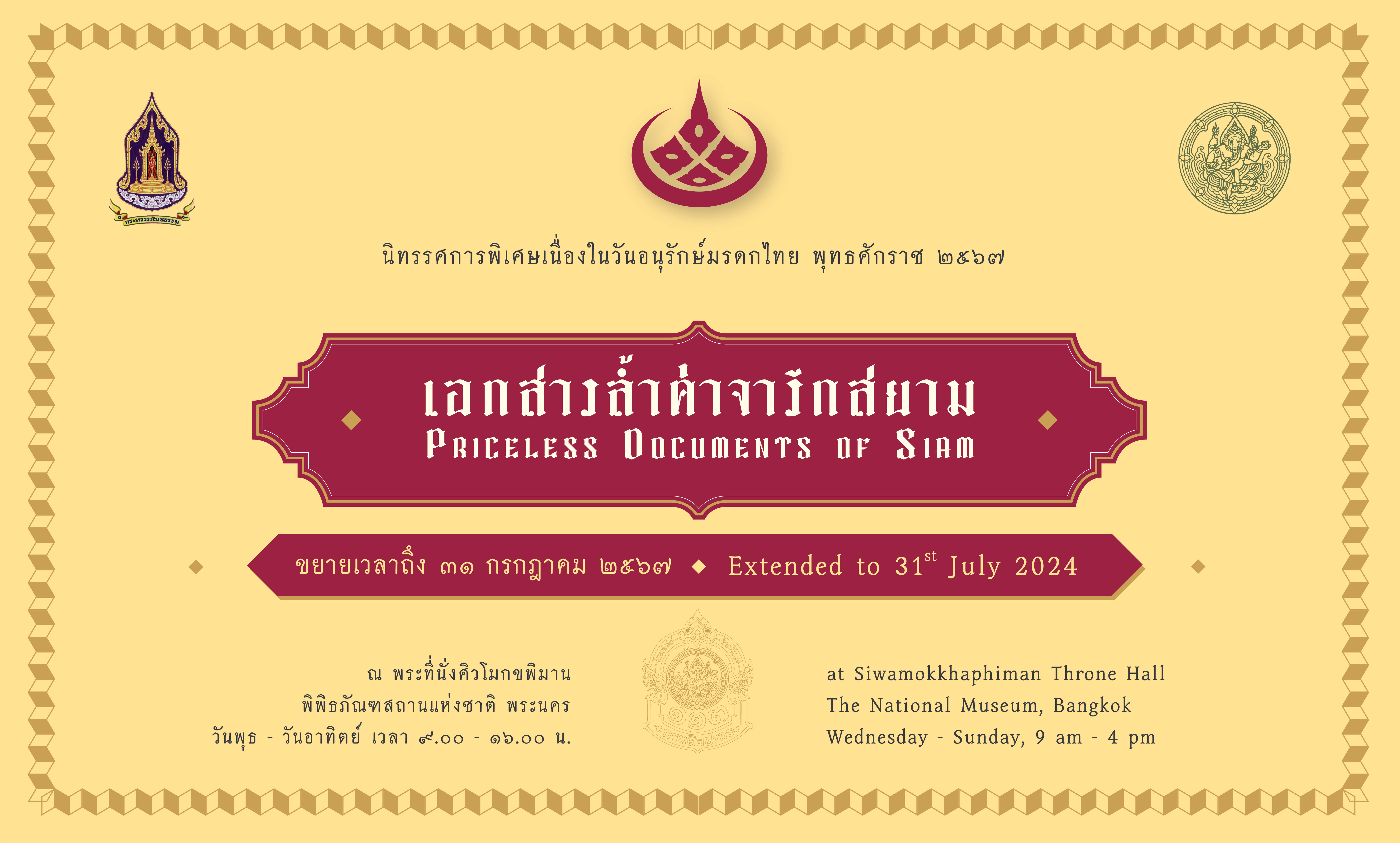 ขยายเวลาจัดแสดงนิทรรศการพิเศษเนื่องในวันอนุรักษ์มรดกไทย “เอกสารล้ำค่าจารึกสยาม” ถึงวันที่ ๓๑ กรกฎาคม ๒๕๖๗