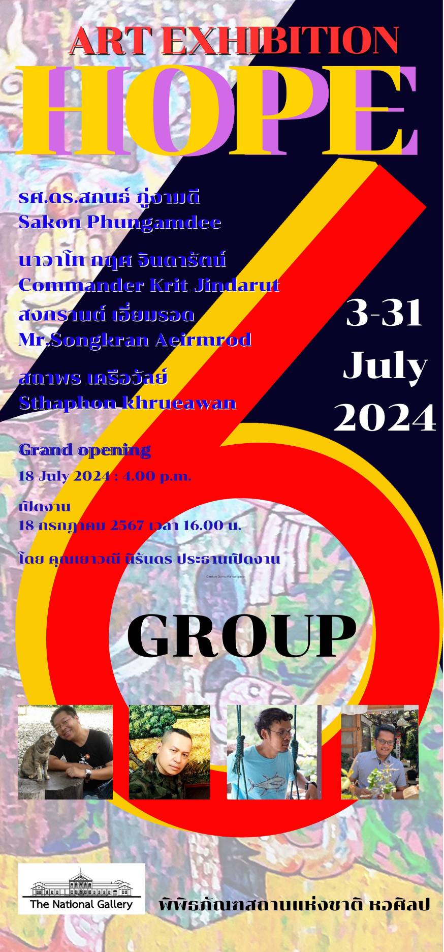 พิพิธภัณฑสถานแห่งชาติ หอศิลป ขอเชิญชมนิทรรศการ "ศิลปะความหวัง" โดยกลุ่ม Hope 6 ซี่งประกอบไปด้วยสมาชิกกลุ่ม 4 ท่าน ได้แก่ รศ.ดร.สกนธ์ ภู่งามดี, นาวาโท กฤศ จินดารัตน์, สงกรานต์ เอี่ยมรอด และสถาพร เครือวัลย์ เปิดให้เข้าชมระหว่างวันที่ 3 – 31 กรกฎาคม 2567 ณ อาคารนิทรรศการ 6