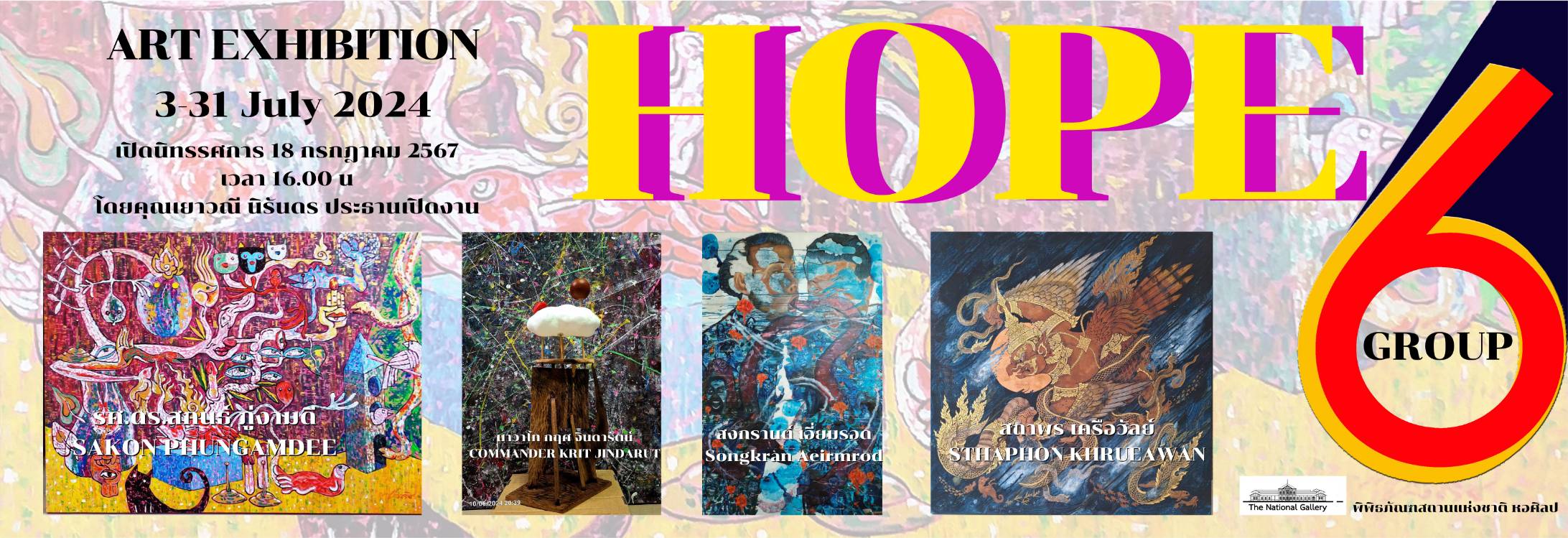 นิทรรศการ "ศิลปะความหวัง" โดย กลุ่ม Hope 6 จะทำให้ผู้เข้าชมผลงานได้สัมผัสถึงความหมายของการมีความหวัง โดยประกอบไปด้วยผลงานประเภทจิตรกรรมและประติมากรรมกว่า 50 ชิ้น ที่แตกต่างกันทั้งในด้านเทคนิค และกระบวนการสร้างสรรค์งาน ทว่าโดดเด่นและสะท้อนเอกลักษณ์ของศิลปินเจ้าของผลงานได้เป็นอย่างดี นิทรรศการ "ศิลปะความหวัง" ถ่ายทอดความคิด จินตนาการ และประสบการณ์ ผ่านผลงานศิลปะในรูปแบบเฉพาะตนของศิลปินทั้ง 4 ท่าน (รศ.ดร.สกนธ์ ภู่งามดี, นาวาโท กฤศ จินดารัตน์, สงกรานต์ เอี่ยมรอด และสถาพร เครือวัลย์) ทั้งนี้ มีพิธีเปิดนิทรรศการวันพฤหัสบดีที่ 18 กรกฎาคม 2567 เวลา 16.00 น. โดยได้รับเกียรติจากคุณเยาวณี นิรันดร เป็นประธานในพิธี