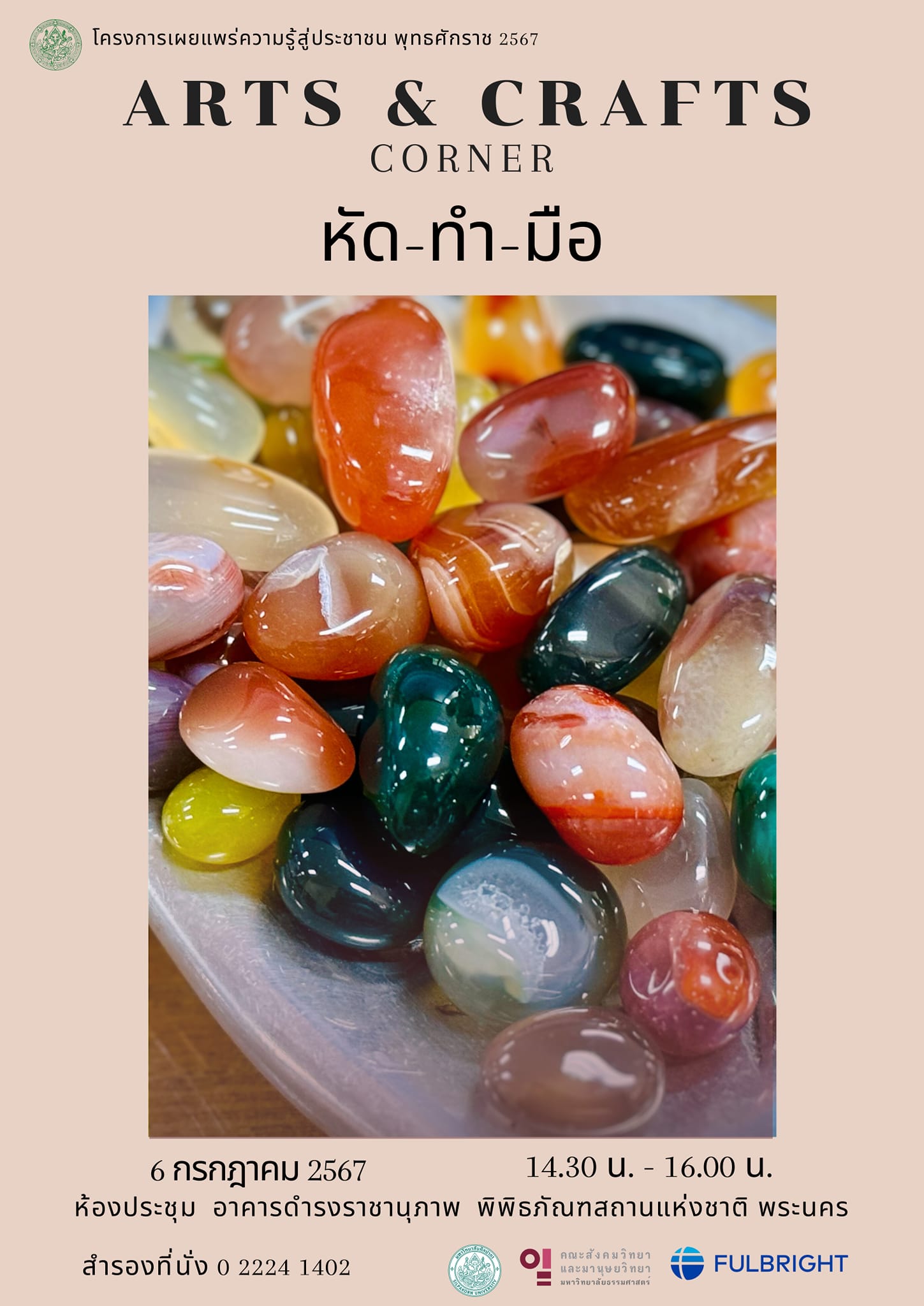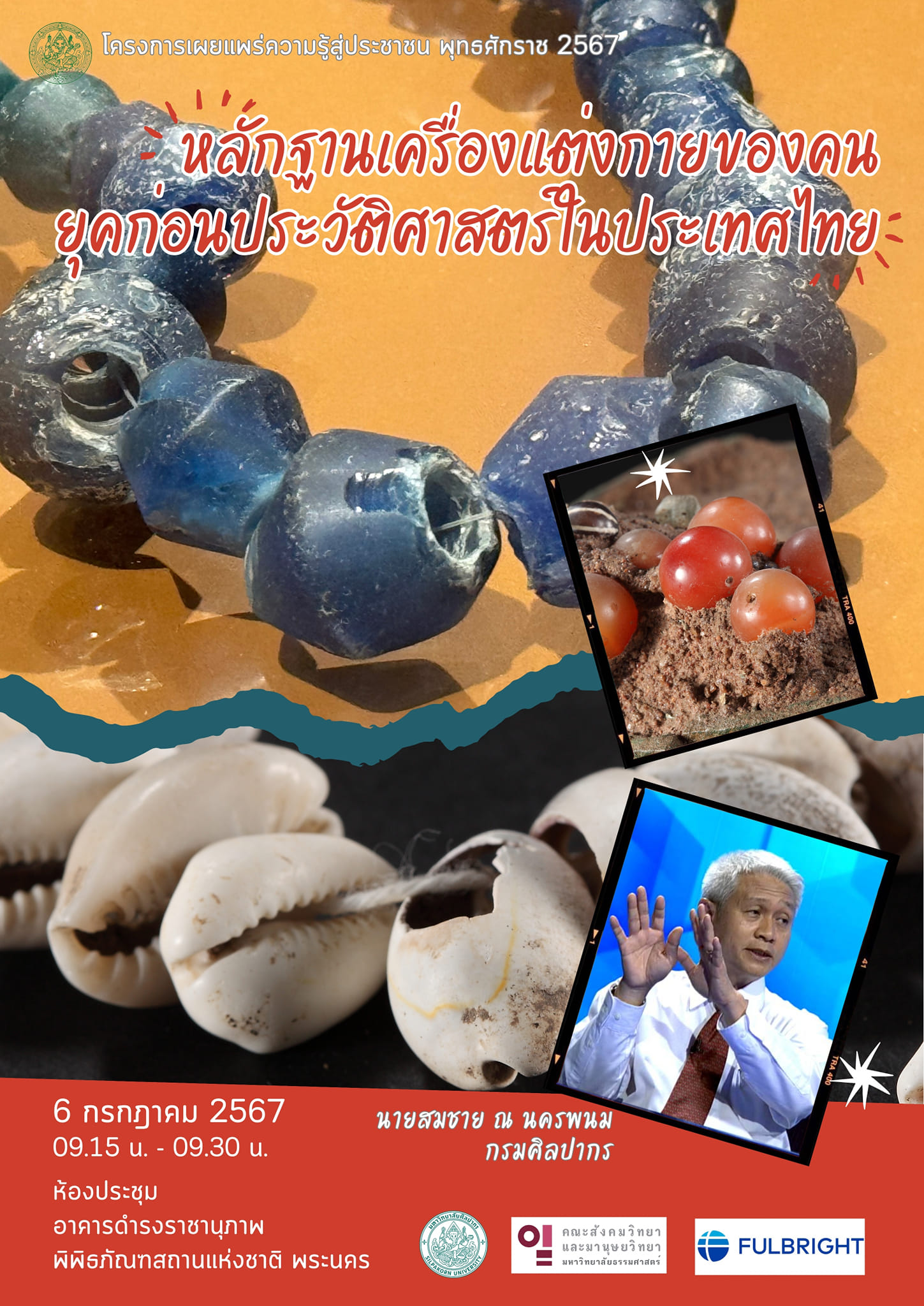 กรมศิลปากร โดยสำนักพิพิธภัณฑสถานแห่งชาติ ขอเชิญร่วมกิจกรรมโครงการเผยแพร่ความรู้สู่ประชาชน ประจำปี ๒๕๖๗ " วันเสาร์ที่ ๖ กรกฎาคม ๒๕๖๗ ณ พิพิธภัณฑสถานแห่งชาติ พระนคร พบกับกิจกรรมบรรยายทางวิชาการและการสาธิต ในหัวข้อ "ย้อนอดีต : เทคนิคการทำลูกปัดหินและสิ่งทอสมัยโบราณ" มีรายการที่สนใจดังนี้