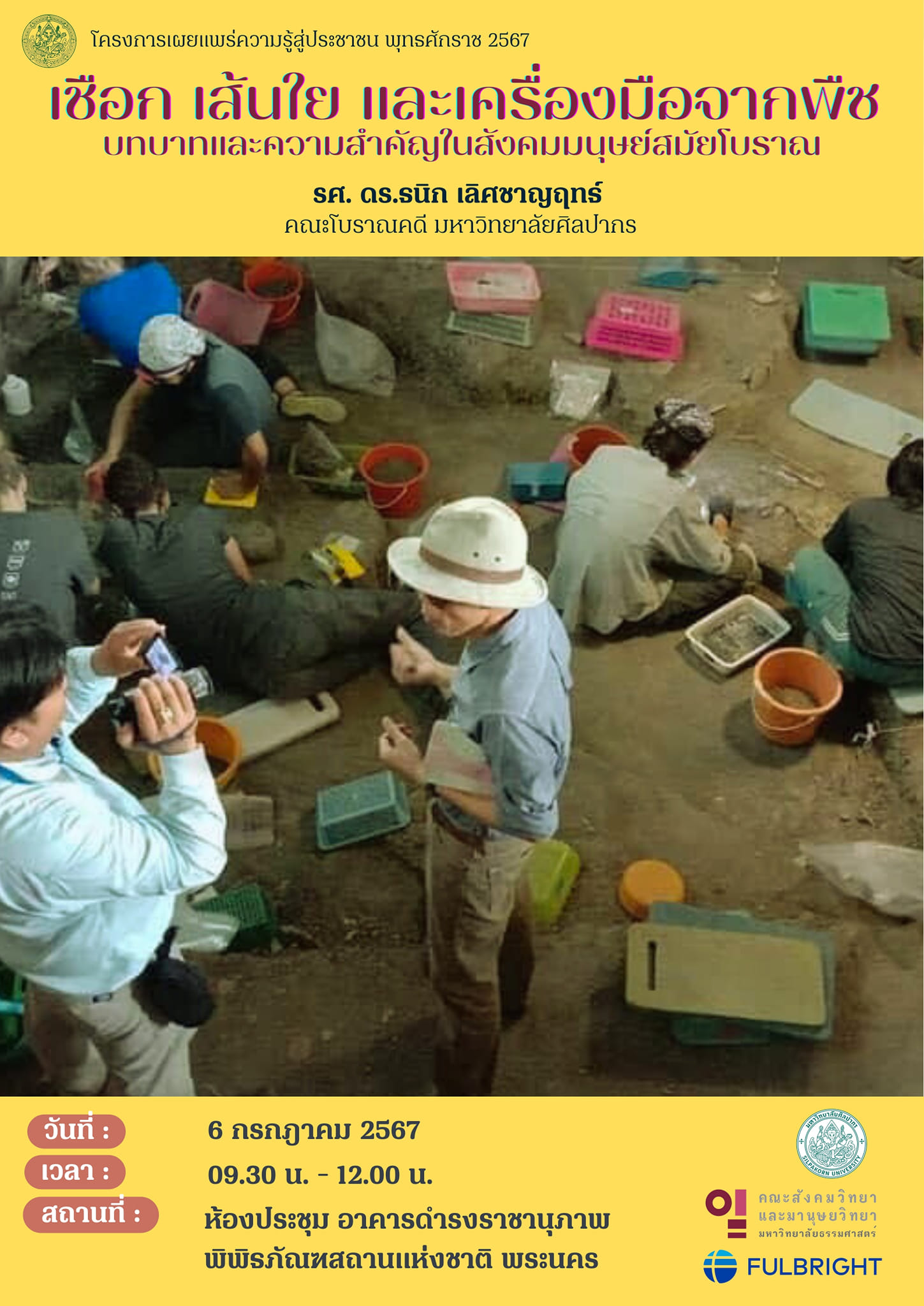 ๑. เรื่อง "เชือก เส้นใย และเครื่องมือจากพืช บทบาทและความสำคัญในสังคมมนุษย์สมัยโบราณ" โดย รศ. ดร.ธนิก เลิศชาญฤทธ์ คณะโบราณคดี มหาวิทยาลัยศิลปากร