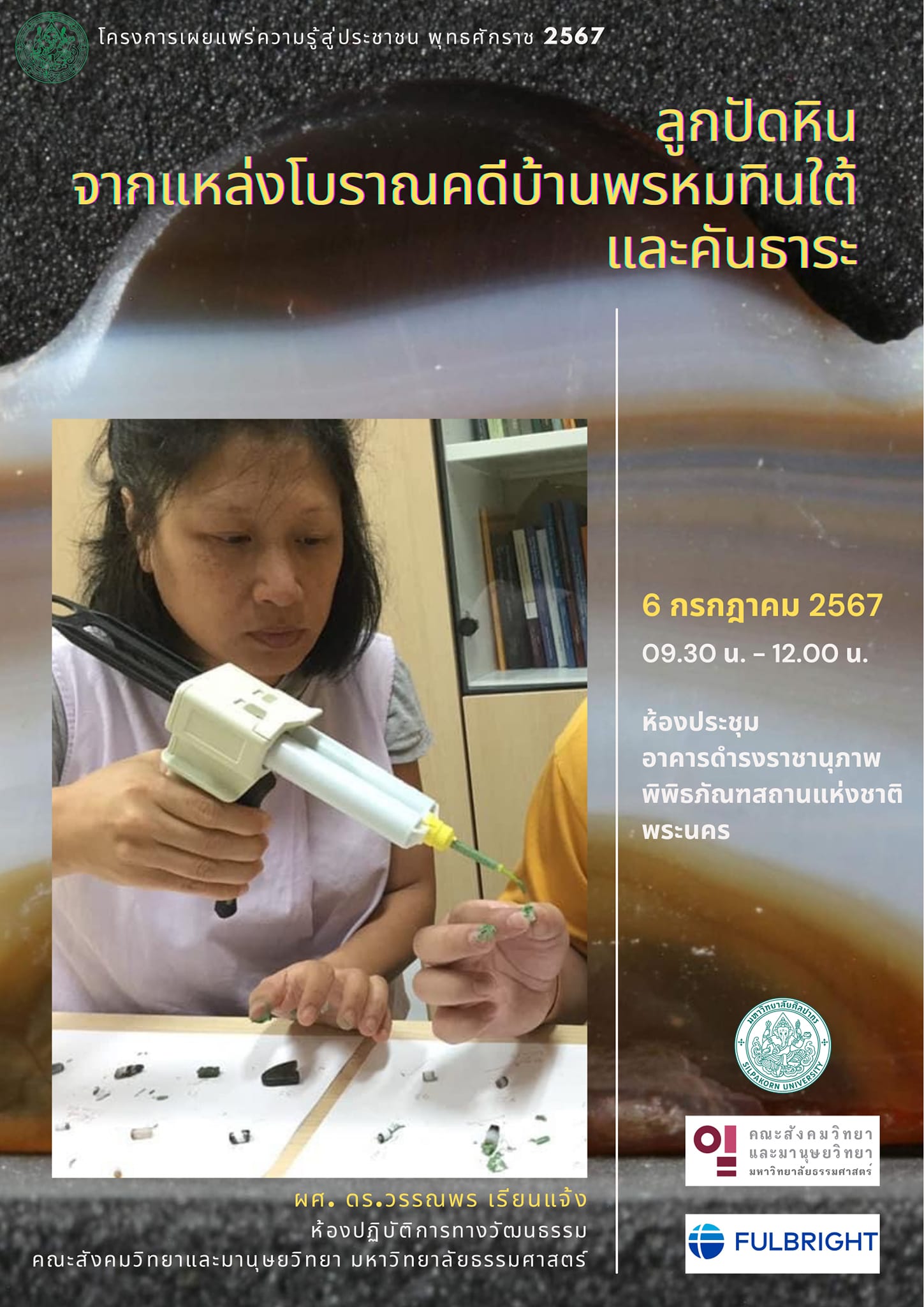 ๓. เรื่อง "ลูกปัดหินจากแหล่งโบราณคดีบ้านพรหมทินใต้และคันธาระ" โดย ผศ. ดร.วรรณพร เรียนแจ้งห้องปฏิบัติการทางวัตถุวัฒนธรรม คณะสังคมวิทยาและมานุษยวิทยา มหาวิทยาลัยธรรมศาสตร์