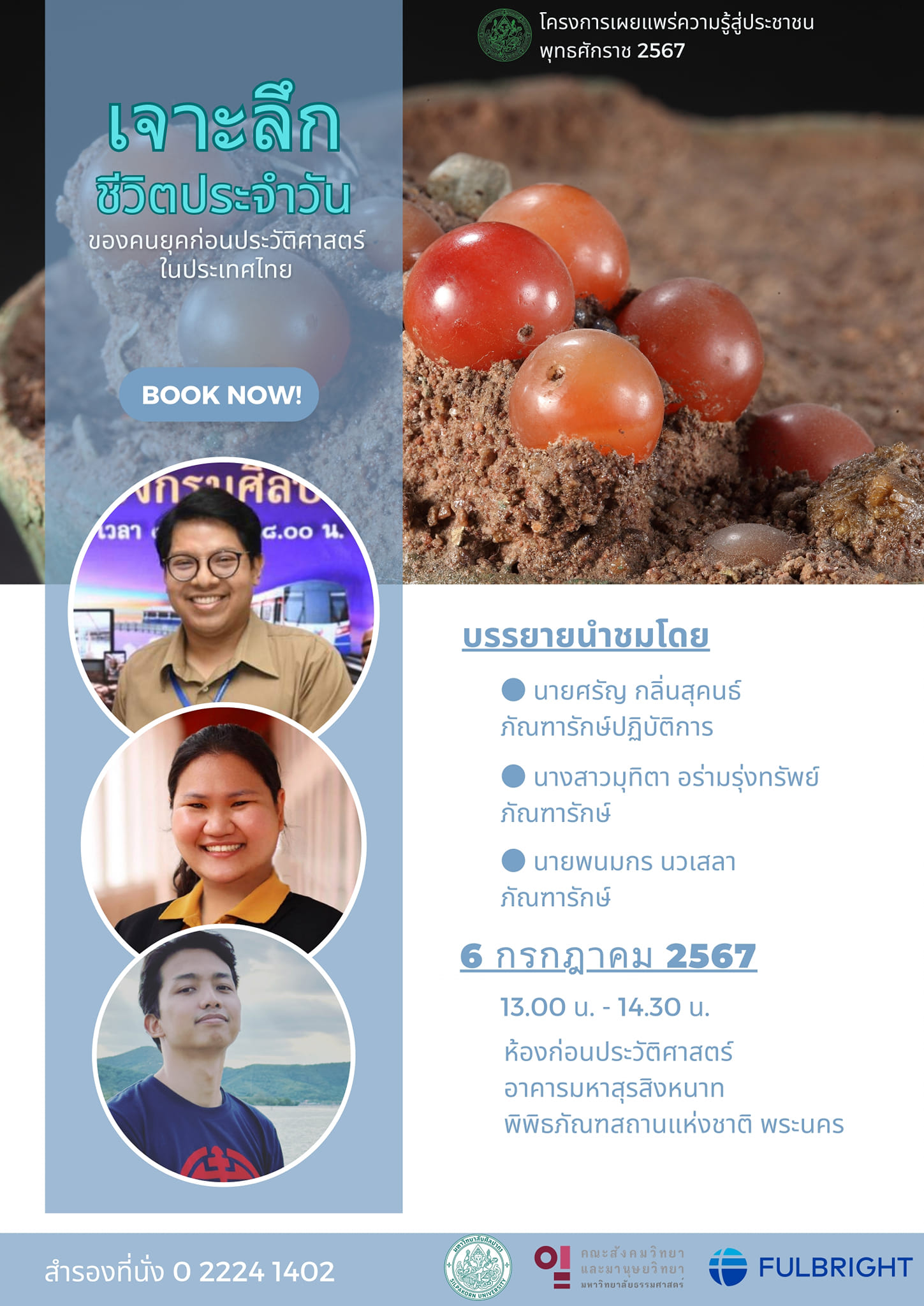 เวลา ๑๓.๓๐ น. การบรรยายนำชม เรื่อง "เจาะลึกชีวิตประจำวันของคนยุคก่อนประวัติศาสตร์ ในประเทศไทย" ณ ห้องจัดแสดงก่อนประวัติศาสตร์ อาคารมหาสุรสิงหนาท โดย นายศรัญ กลิ่นสุคนธ์ ภัณฑารักษ์ปฏิบัติการ กรมศิลปากร, นางสาวมุทิตา อร่ามรุ่งทรัพย์ ภัณฑารักษ์ กรมศิลปากร, นายพนมกร นวเสลา ภัณฑารักษ์ กรมศิลปากร