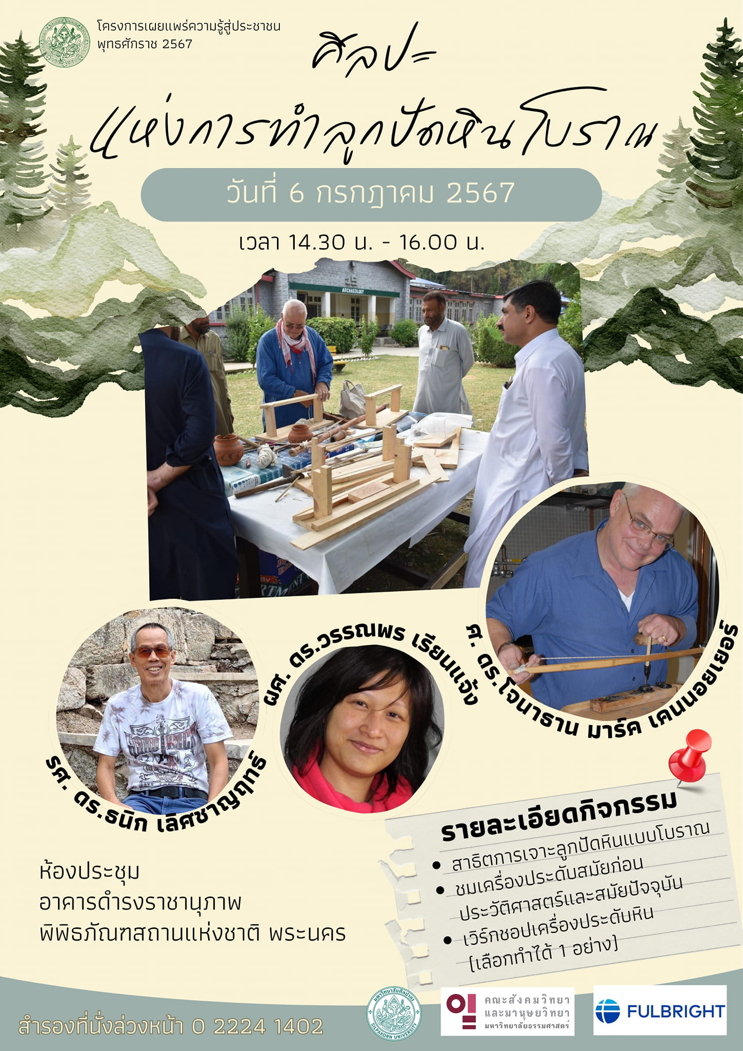 ขอเชิญร่วมกิจกรรมโครงการเผยแพร่ความรู้สู่ประชาชน "ย้อนอดีต : เทคนิคการทำลูกปัดหินและสิ่งทอสมัยโบราณ