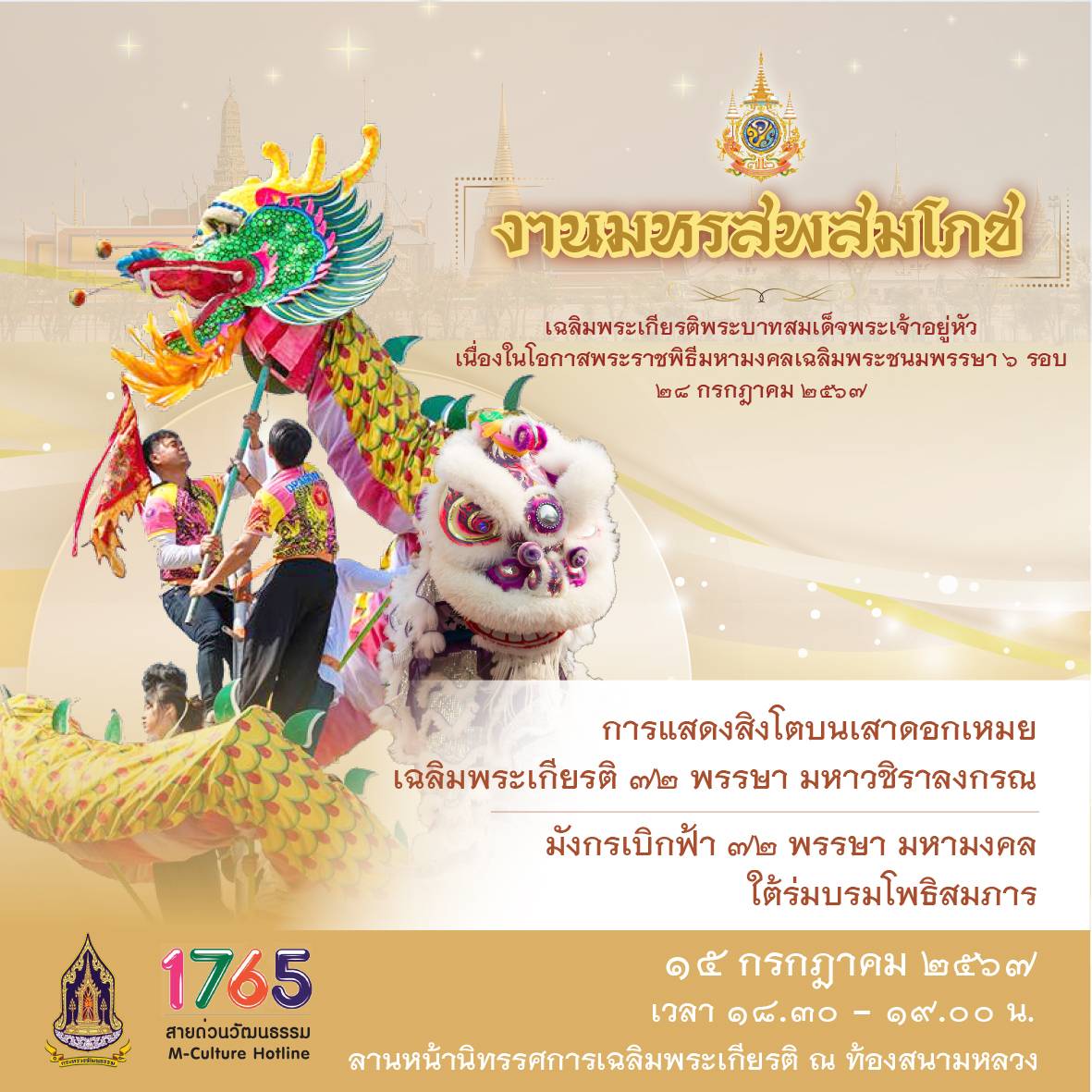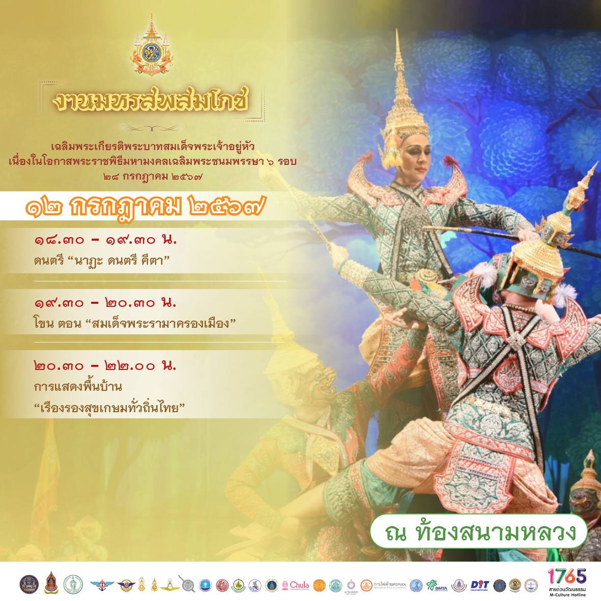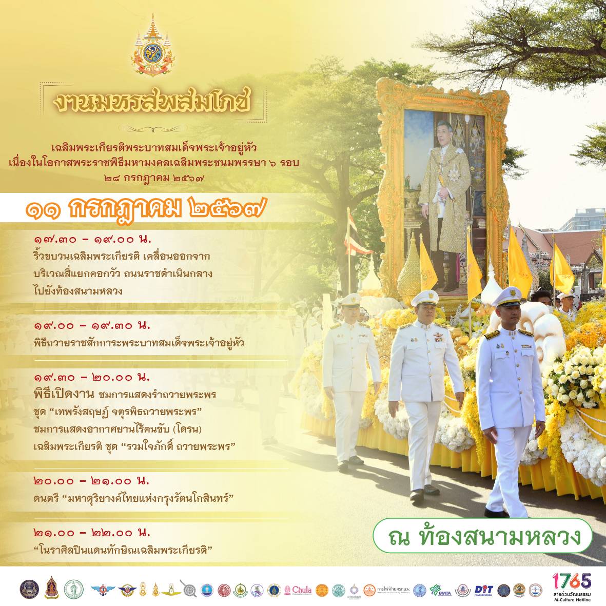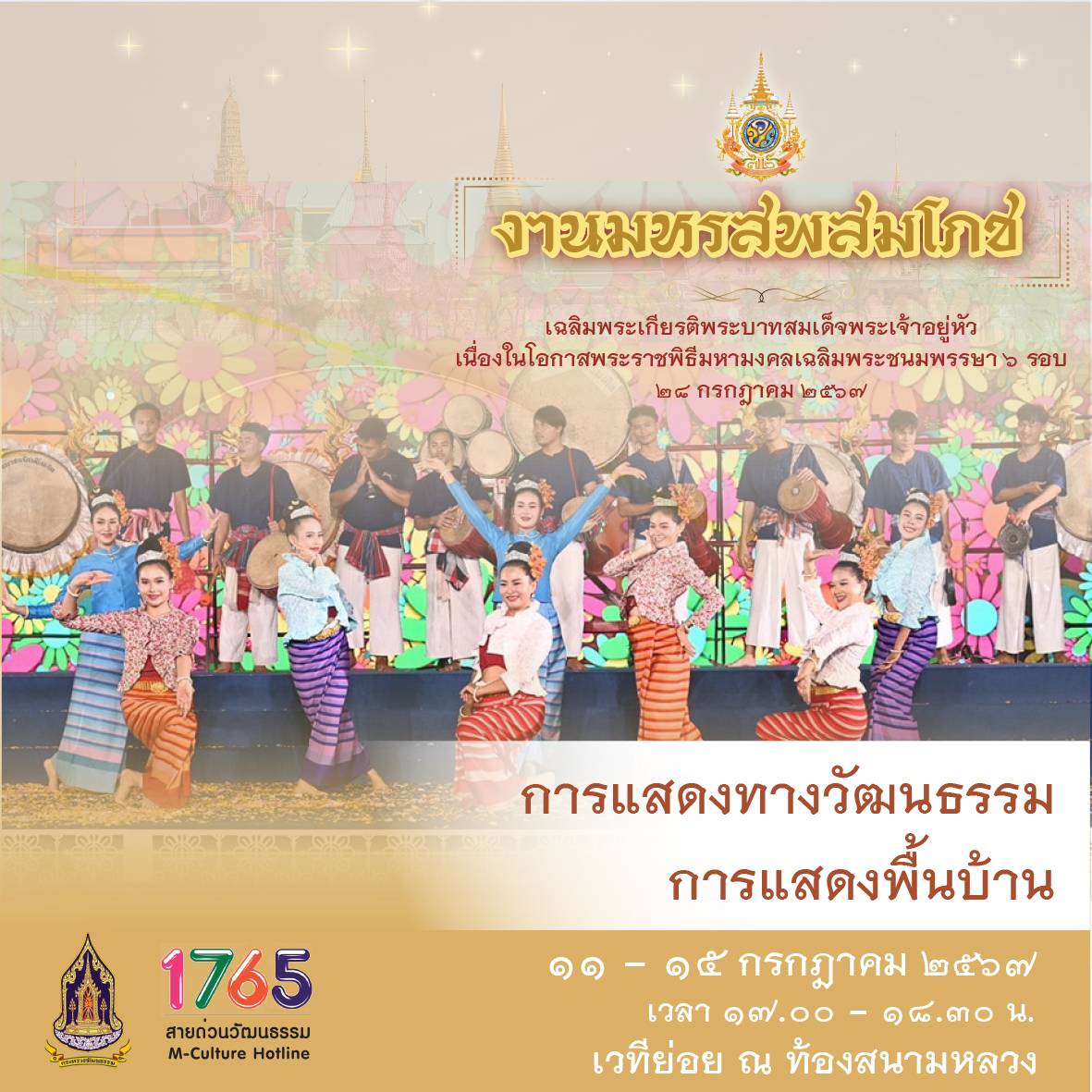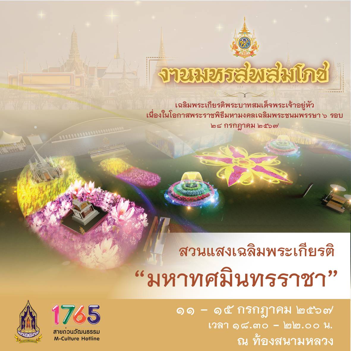 รัฐบาล โดยกระทรวงวัฒนธรรมร่วมกับหน่วยงานต่างๆ จัดงานมหรสพสมโภช เฉลิมพระเกียรติพระบาทสมเด็จพระเจ้าอยู่หัว เนื่องในโอกาสพระราชพิธีมหามงคลเฉลิมพระชนมพรรษา ๖ รอบ ๒๘ กรกฎาคม ๒๕๖๗ ระหว่างวันที่ ๑๑ - ๑๕ กรกฎาคม ๒๕๖๗ ณ ท้องสนามหลวง มีกิจกรรมประกอบด้วย พิธีบวงสรวงเทพยดา วันที่ ๙ กรกฎาคม ๒๕๖๗ ณ ท้องสนามหลวง พิธีเปิดงานวันที่ ๑๑ กรกฎาคม ๒๕๖๗ มีการเดินริ้วขบวนเฉลิมพระเกียรติฯ ประกอบด้วย ริ้วขบวนต่าง ๆ ๒๖ ขบวน เส้นทางริ้วขบวนเริ่มจากสี่แยกคอกวัว ถนนราชดำเนินกลางไปยังท้องสนามหลวง และแสดงอากาศยานไร้คนขับ (โดรน) เฉลิมพระเกียรติ ชุด “รวมใจภักดิ์ ถวายพระพร”