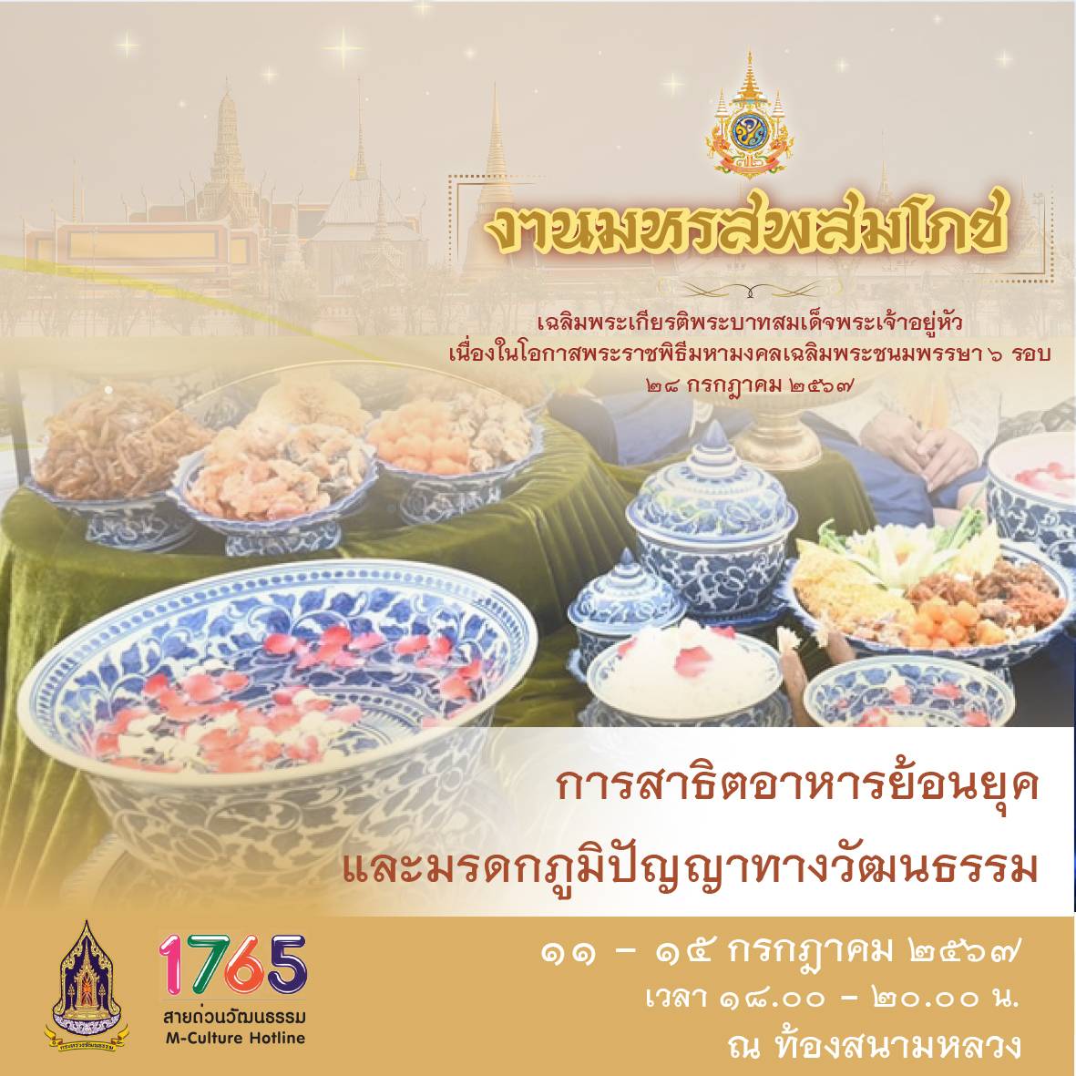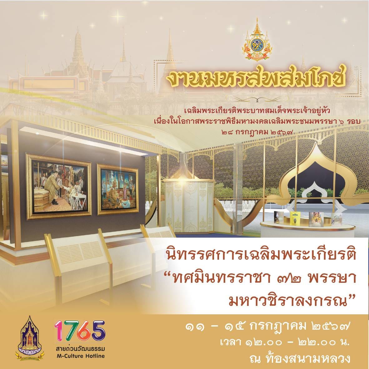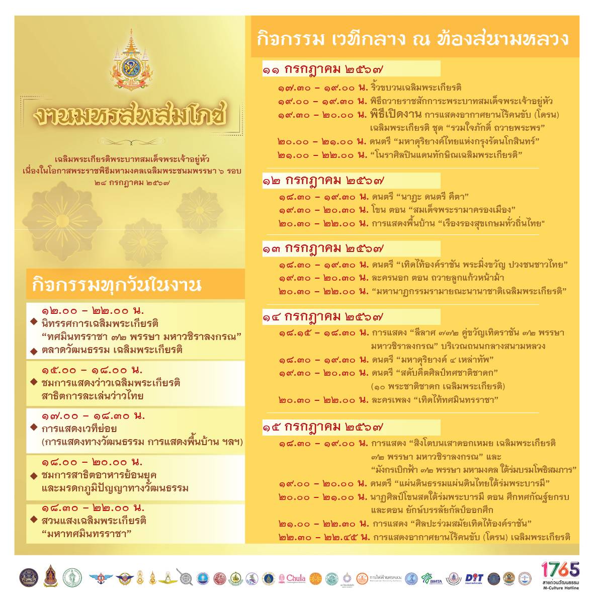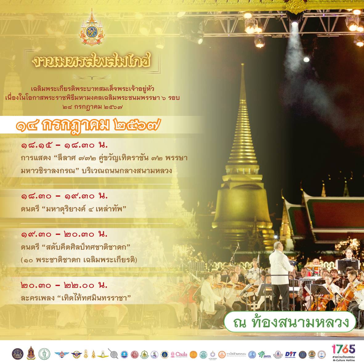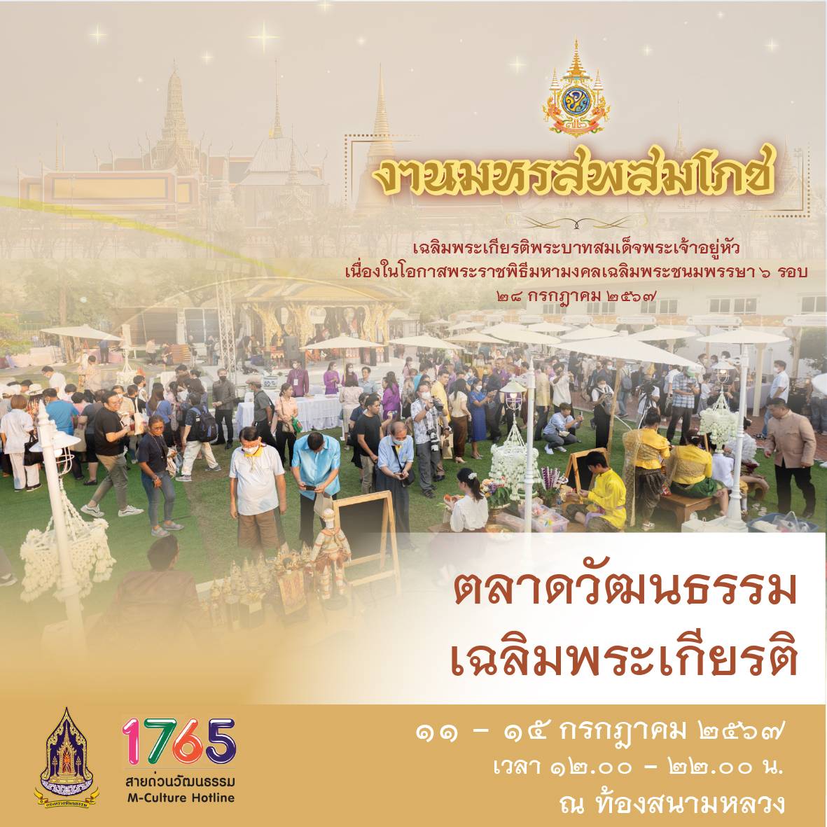รัฐบาล โดยกระทรวงวัฒนธรรมร่วมกับหน่วยงานต่างๆ จัดงานมหรสพสมโภช เฉลิมพระเกียรติพระบาทสมเด็จพระเจ้าอยู่หัว เนื่องในโอกาสพระราชพิธีมหามงคลเฉลิมพระชนมพรรษา ๖ รอบ ๒๘ กรกฎาคม ๒๕๖๗ ระหว่างวันที่ ๑๑ - ๑๕ กรกฎาคม ๒๕๖๗ ณ ท้องสนามหลวง มีกิจกรรมประกอบด้วย พิธีบวงสรวงเทพยดา วันที่ ๙ กรกฎาคม ๒๕๖๗ ณ ท้องสนามหลวง พิธีเปิดงานวันที่ ๑๑ กรกฎาคม ๒๕๖๗ มีการเดินริ้วขบวนเฉลิมพระเกียรติฯ ประกอบด้วย ริ้วขบวนต่าง ๆ ๒๖ ขบวน เส้นทางริ้วขบวนเริ่มจากสี่แยกคอกวัว ถนนราชดำเนินกลางไปยังท้องสนามหลวง และแสดงอากาศยานไร้คนขับ (โดรน) เฉลิมพระเกียรติ ชุด “รวมใจภักดิ์ ถวายพระพร”