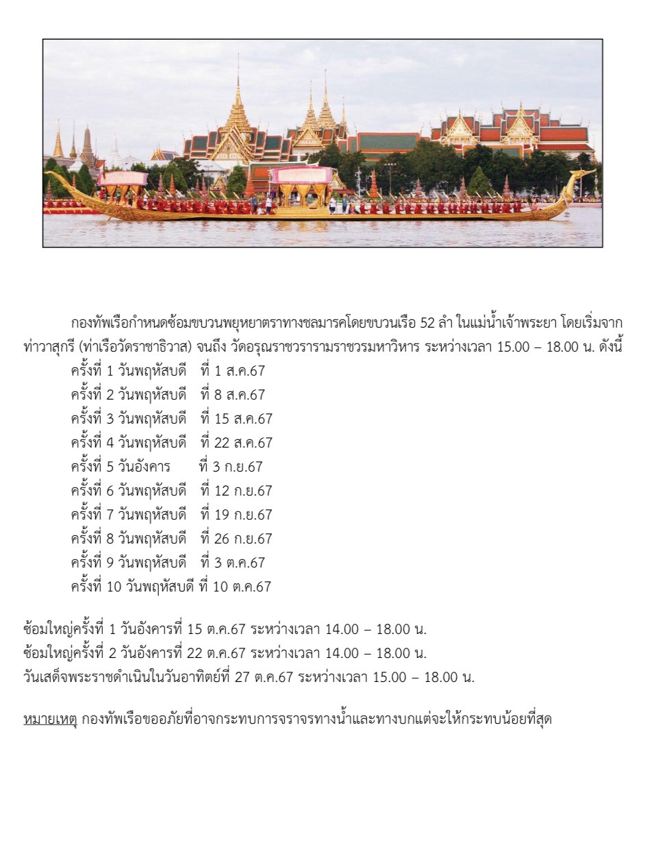 ขอเชิญชมการฝึกซ้อมของกำลังพลฝีพายเรือพระราชพิธี การซ้อมเห่เรือ และการซ้อมขบวนพยุหยาตราทางชลมารค
