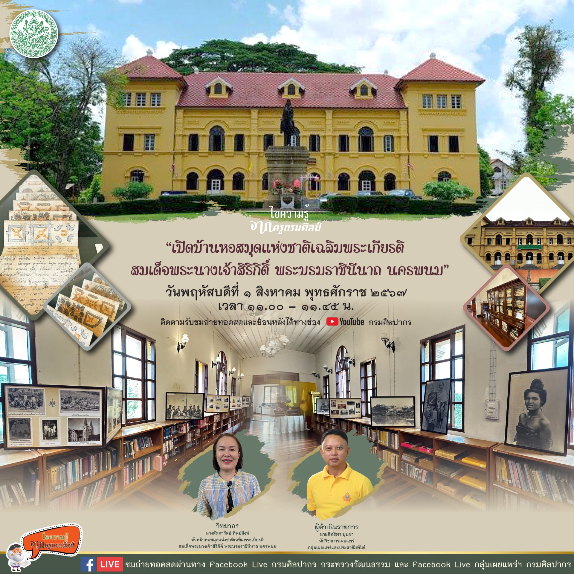 ขอเชิญชม Facebook Live รายการไขความรู้จากครูกรมศิลป์ “เปิดบ้านหอสมุดแห่งชาติเฉลิมพระเกียรติฯ นครพนม”