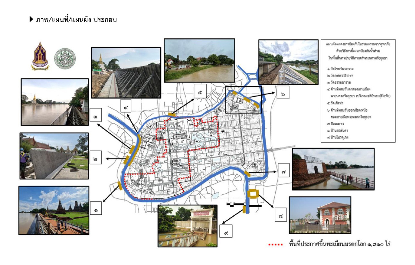 ทั้งนี้ พื้นที่นครประวัติศาสตร์พระนครศรีอยุธยา ยังคงปรากฏความเสี่ยงด้านต่างๆ รวมถึงอุทกภัยที่อาจมีผลกระทบต่อแหล่งมรดกโลก ในระดับแผนปฏิบัติการ กรมศิลปากรได้บรรจุแผนงานมาตรการลดผลกระทบจากภัยพิบัติไว้ในร่างแผนปฏิบัติการการอนุรักษ์และพัฒนานครประวัติศาสตร์พระนครศรีอยุธยา พุทธศักราช 2566 - 2575 ปัจจุบันอุทยานประวัติศาสตร์พระนครศรีอยุธยา ร่วมกับภาคส่วนที่เกี่ยวข้อง ยังคงดำเนินงานตามมาตรการป้องกันผลกระทบจากภัยที่อาจเกิดขึ้นในพื้นที่มรดกโลกนครประวัติศาสตร์พระนคร ศรีอยุธยา โดยมีการบริหารจัดการเป็นขั้นตอนในทุกปี มีการวิเคราะห์ปัญหาและจัดทำแผนการทำงาน ประชุมติดตามการดำเนินงานร่วมกับจังหวัดพระนครศรีอยุธยาและหน่วยงานที่เกี่ยวข้อง