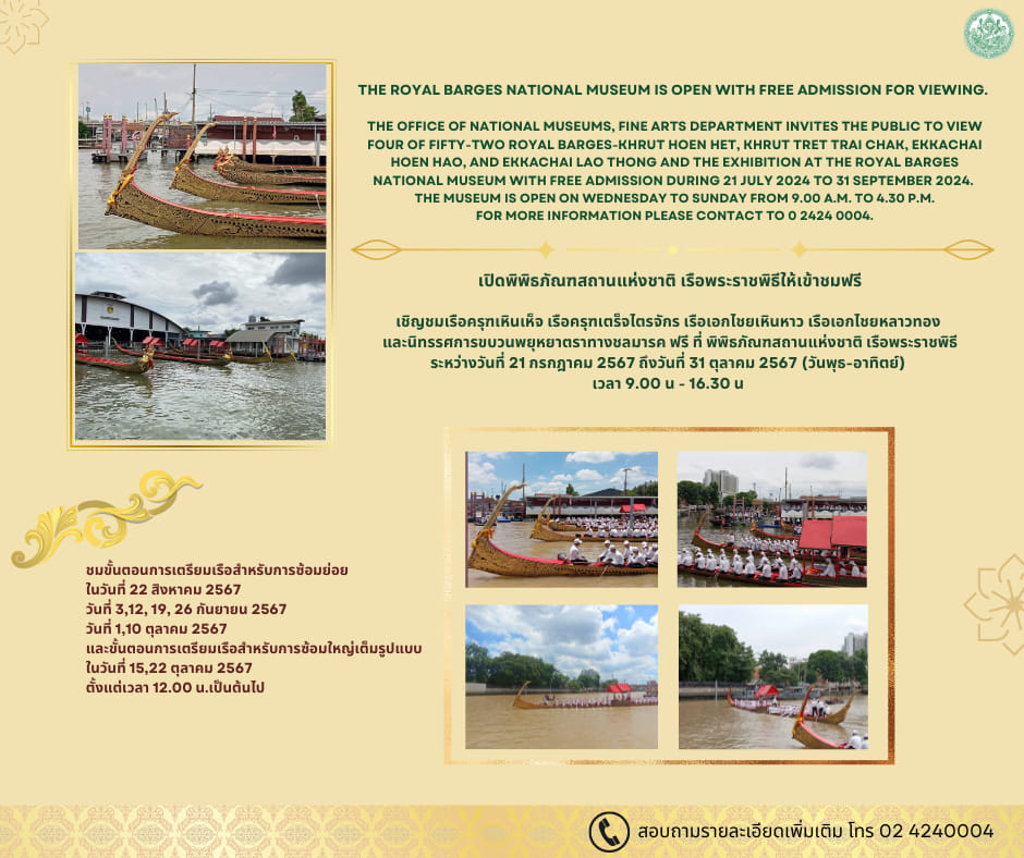 ผู้สนใจสามารถเข้าชมพิพิธภัณฑสถานแห่งชาติ เรือพระราชพิธี แหล่งเรียนรู้และเผยแพร่ความรู้เรื่องเรือพระราชพิธี ริมคลองบางกอกน้อย แขวงอรุณอมรินทร์ เขตบางกอกน้อย กรุงเทพมหานคร โดยไม่เสียค่าเข้าชม ตั้งแต่บัดนี้จนถึงวันที่ 31 ตุลาคม 2567 (วันพุธ - อาทิตย์) เวลา 09.00 - 16.30 น. สอบถามเพิ่มเติม โทร. 0 2424 0004