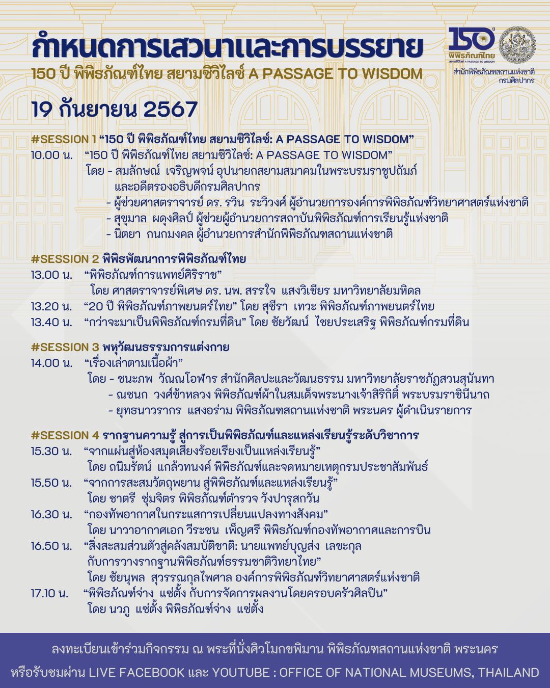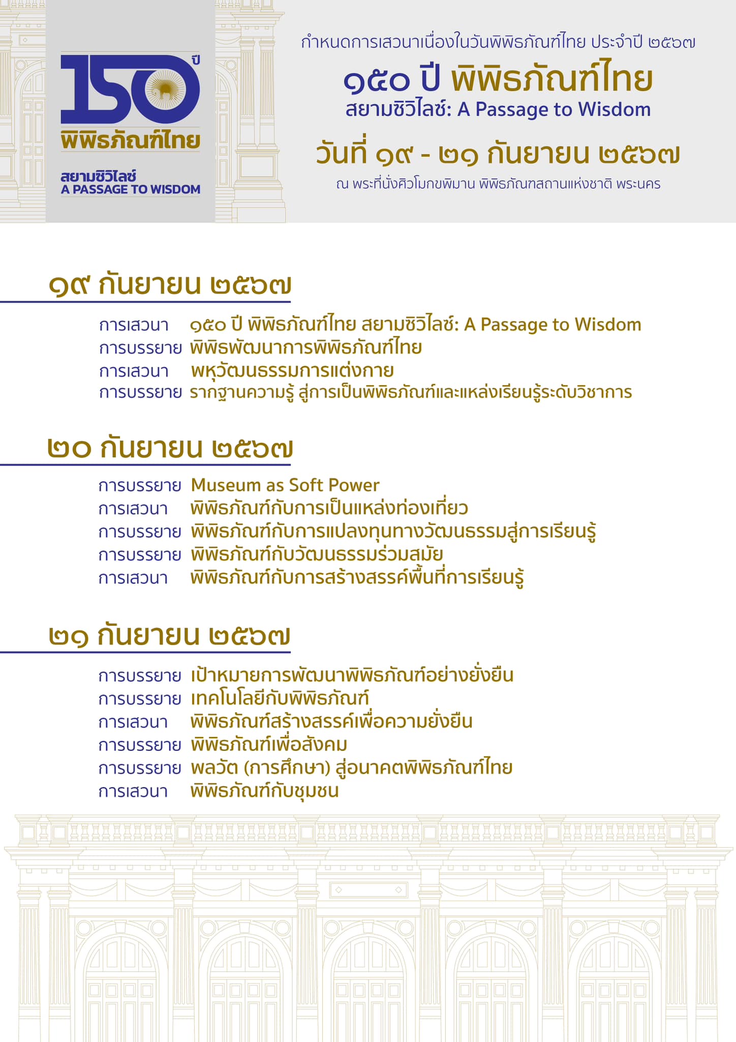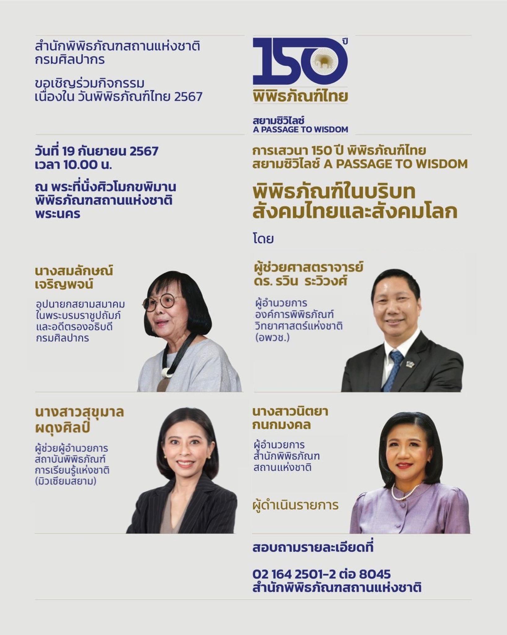 กรมศิลปากร โดยสำนักพิพิธภัณฑสถานแห่งชาติ ขอเชิญร่วมฟังการเสวนาและการบรรยายจากผู้บริหารองค์กรด้านพิพิธภัณฑ์ของไทย รวมถึงผู้ปฏิบัติงานพิพิธภัณฑ์มากกว่า 40 คน ที่จะมาร่วมกันบอกเล่าเรื่องราวความรู้ต่าง ๆ สู่สาธารณชน ในงาน “150 ปี พิพิธภัณฑ์ไทย สยามซิวิไลซ์ A Passage to Wisdom” ในวาระครบรอบ 150 ปี แห่งการเริ่มต้นพิพิธภัณฑสถานสำหรับประชาชนครั้งแรกในประเทศไทย ระหว่างวันที่ 19 – 21 กันยายน 2567 ณ พระที่นั่งศิวโมกขพิมาน พิพิธภัณฑสถานแห่งชาติ พระนคร