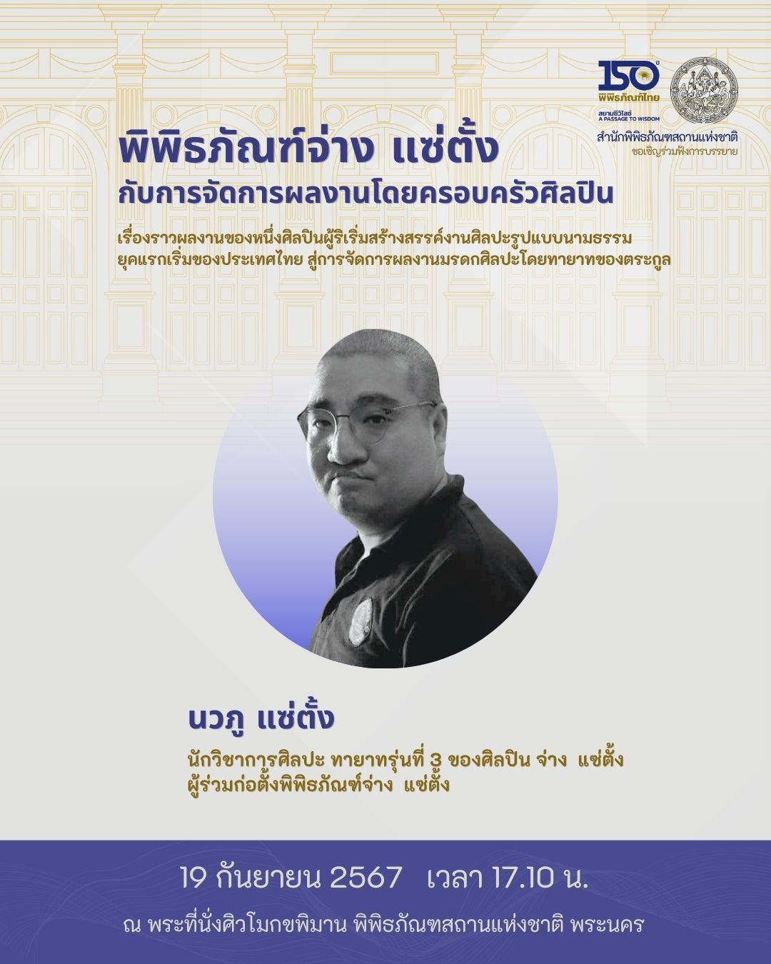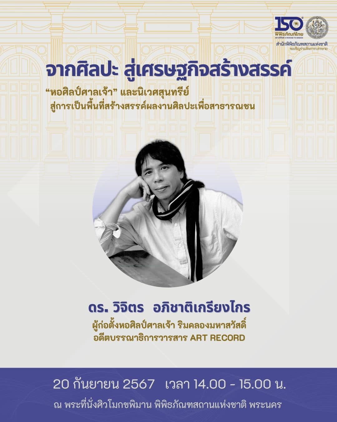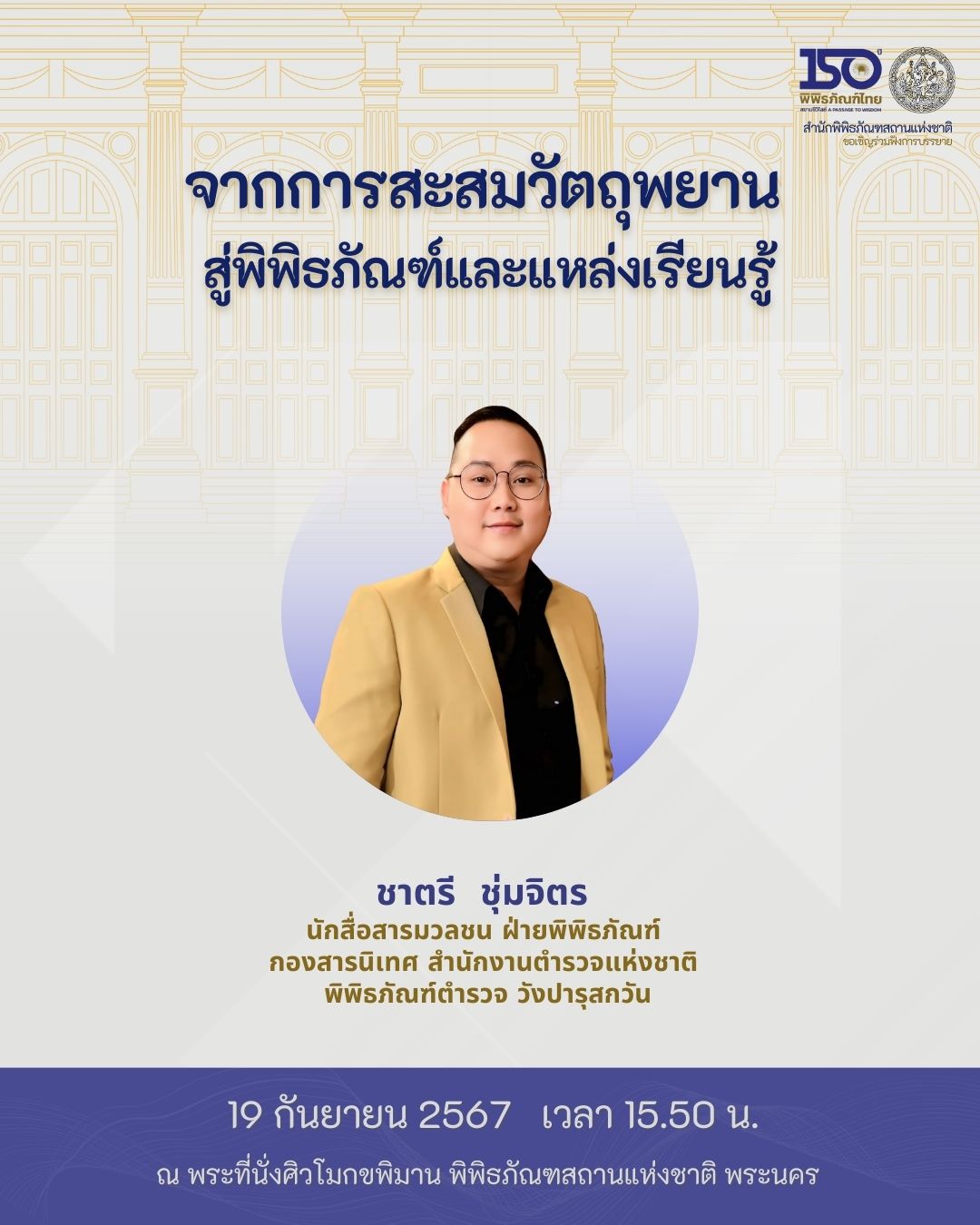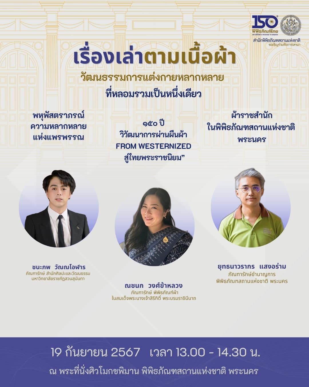 กรมศิลปากร โดยสำนักพิพิธภัณฑสถานแห่งชาติ ขอเชิญร่วมฟังการเสวนาและการบรรยายจากผู้บริหารองค์กรด้านพิพิธภัณฑ์ของไทย รวมถึงผู้ปฏิบัติงานพิพิธภัณฑ์มากกว่า 40 คน ที่จะมาร่วมกันบอกเล่าเรื่องราวความรู้ต่าง ๆ สู่สาธารณชน ในงาน “150 ปี พิพิธภัณฑ์ไทย สยามซิวิไลซ์ A Passage to Wisdom” ในวาระครบรอบ 150 ปี แห่งการเริ่มต้นพิพิธภัณฑสถานสำหรับประชาชนครั้งแรกในประเทศไทย ระหว่างวันที่ 19 – 21 กันยายน 2567 ณ พระที่นั่งศิวโมกขพิมาน พิพิธภัณฑสถานแห่งชาติ พระนคร