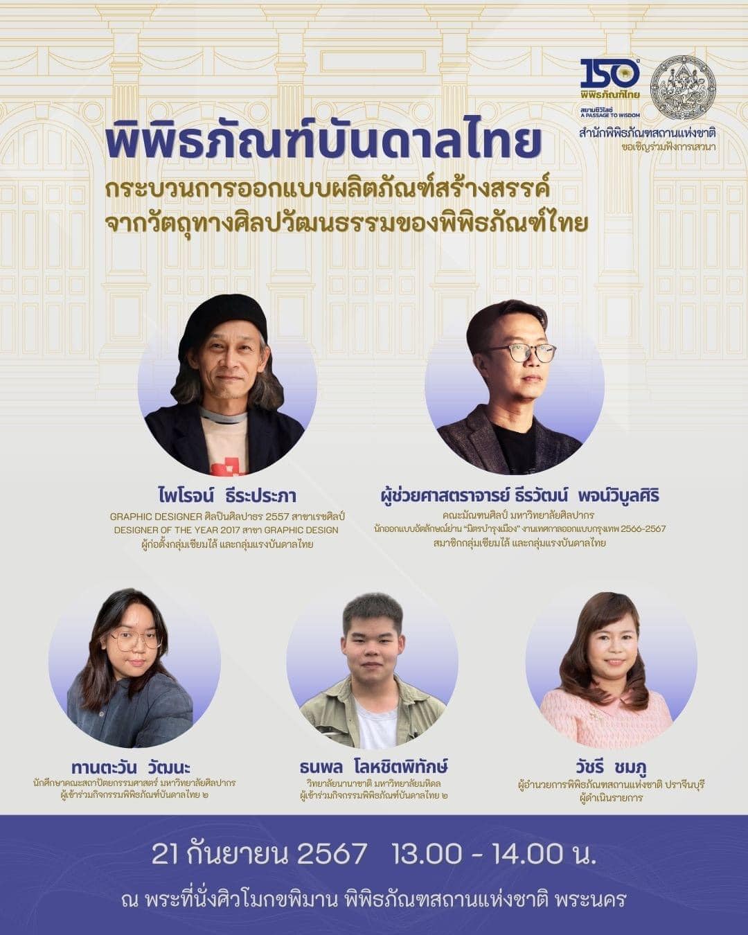 Session 11 : “พิพิธภัณฑ์สร้างสรรค์เพื่อความยั่งยืน“ การเสวนาเล่าเรื่องการสร้างสรรค์ผลิตภัณฑ์จากคุณค่าวัตถุทางวัฒนธรรมของพิพิธภัณฑ์: พิพิธภัณฑ์บันดาลไทย กับวิทยากรกลุ่มเซียมไล้และตัวแทนน้องๆ ผู้เข้าร่วมกิจกรรม อาจารย์ไพโรจน์ ธีระประภา ศิลปินศิลปาธร 2557 สาขาเรขศิลป์ และผู้ก่อตั้งกลุ่มเซียมไล้ ผู้ช่วยศาสตราจารย์ ธีรวัฒน์ พจน์วิบูลศิริ คณะมัณฑนศิลป์ มหาวิทยาลัยศิลปากร สมาชิกกลุ่มเซียมไล้ ทานตะวัน วัฒนะ ผู้เข้าร่วมกิจกรรมพิพิธภัณฑ์บันดาลไทย 2567 ทีมไทยเก๊ก ธนพล โลหชิตพิทักษ์ ผู้เข้าร่วมกิจกรรมพิพิธภัณฑ์บันดาลไทย 2567 ทีมประกายมรกต วัชรี ชมภู ผู้อำนวยการพิพิธภัณฑสถานแห่งชาติ ปราจีนบุรี (ผู้ดำเนินรายการ)