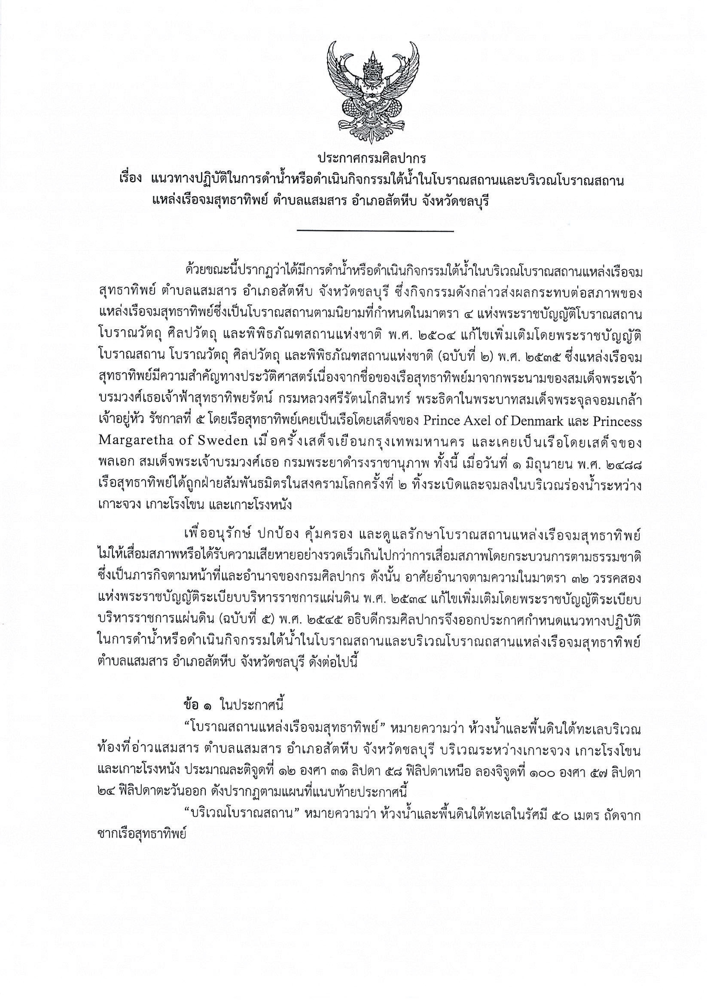 กองโบราณคดีใต้น้ำ แจ้งประกาศกรมศิลปากร เรื่อง แนวทางการดำน้ำในแหล่งโบราณสถานเรือสุทธาทิพย์ เนื่องด้วยตระหนักถึงคุณค่าและความสำคัญทางประวัติศาสตร์ของแหล่งเรือจมสุทธาทิพย์ ตำบลแสมสาร อำเภอสัตหีบ จังหวัดชลบุรี กรมศิลปากรจึงได้ออกประกาศว่าด้วยแนวทางปฏิบัติในการดำน้ำและการทำกิจกรรมในพื้นที่แหล่งเรือจมสุทธาทิพย์ อำเภอสัตหีบ จังหวัดชลบุรี โดยมีวัตถุประสงค์หลักเพื่อส่งเสริมการอนุรักษ์และคุ้มครองแหล่งโบราณสถานใต้น้ำที่ทรงคุณค่าแห่งนี้ ให้ยังคงความเป็นแหล่งเรียนรู้ทางประวัติศาสตร์ใต้น้ำที่สำคัญสืบไป ท่านสามารถดาวน์โหลดประกาศฯ เพื่อศึกษาเพิ่มเติมได้ที่ลิงค์นี้ https://shorturl.asia/pQSts