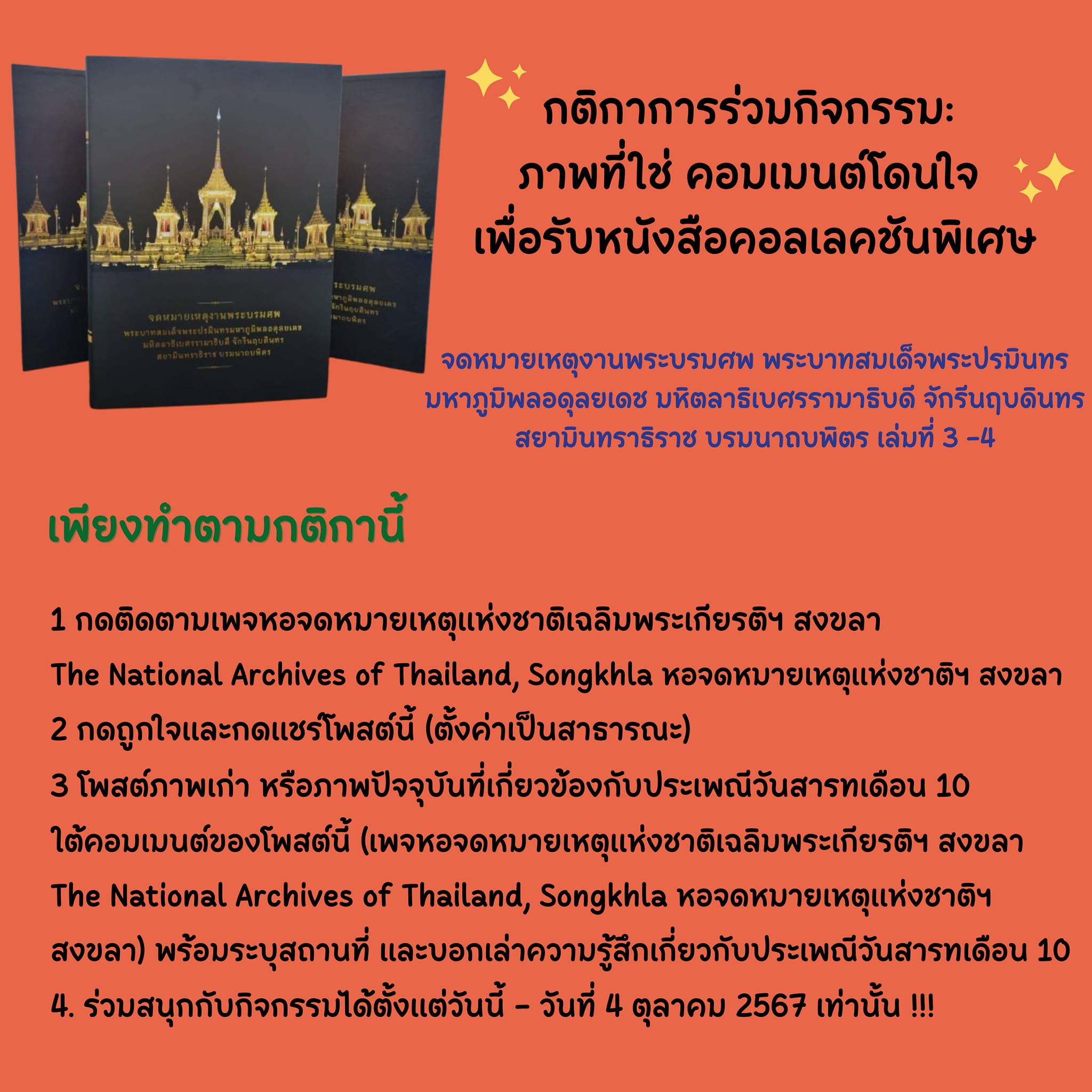 หอจดหมายเหตุแห่งชาติเฉลิมพระเกียรติฯ สงขลา ขอเชิญร่วมกิจกรรมพิเศษเนื่องในประเพณีวันสารทเดือน 10 “ภาพที่ใช่ คอมเมนต์โดนใจ” ชิงรางวัลเป็นหนังสือคอลเลคชันพิเศษ ผู้สนใจสามารถร่วมกิจกรรมได้ที่ เฟซบุ๊ก เพจ The National Archives of Thailand, Songkhla หอจดหมายเหตุเเห่งชาติฯ สงขลา โดยมีกติกา ดังนี้