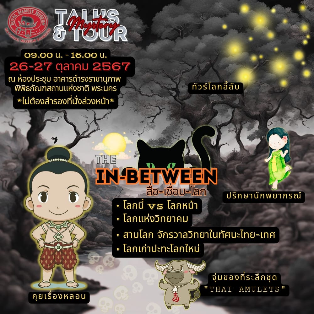 พิพิธภัณฑสถานแห่งชาติ พระนคร จัดกิจกรรมต้อนรับวันฮาโลวีนแบบไทย ๆ กิจกรรม Mystery Talks & Tour ในหัวข้อ "สื่อ - เชื่อม - โลก -- The In - between" วันเสาร์ - อาทิตย์ที่ ๒๖ - ๒๗ ตุลาคม ๒๕๖๗ เวลา ๐๙.๐๐ น.-๑๖.๐๐ น. ณ ห้องประชุม อาคารดำรงราชานุภาพ พิพิธภัณฑสถานแห่งชาติ พระนคร พบกับกิจกรรมหลากหลาย