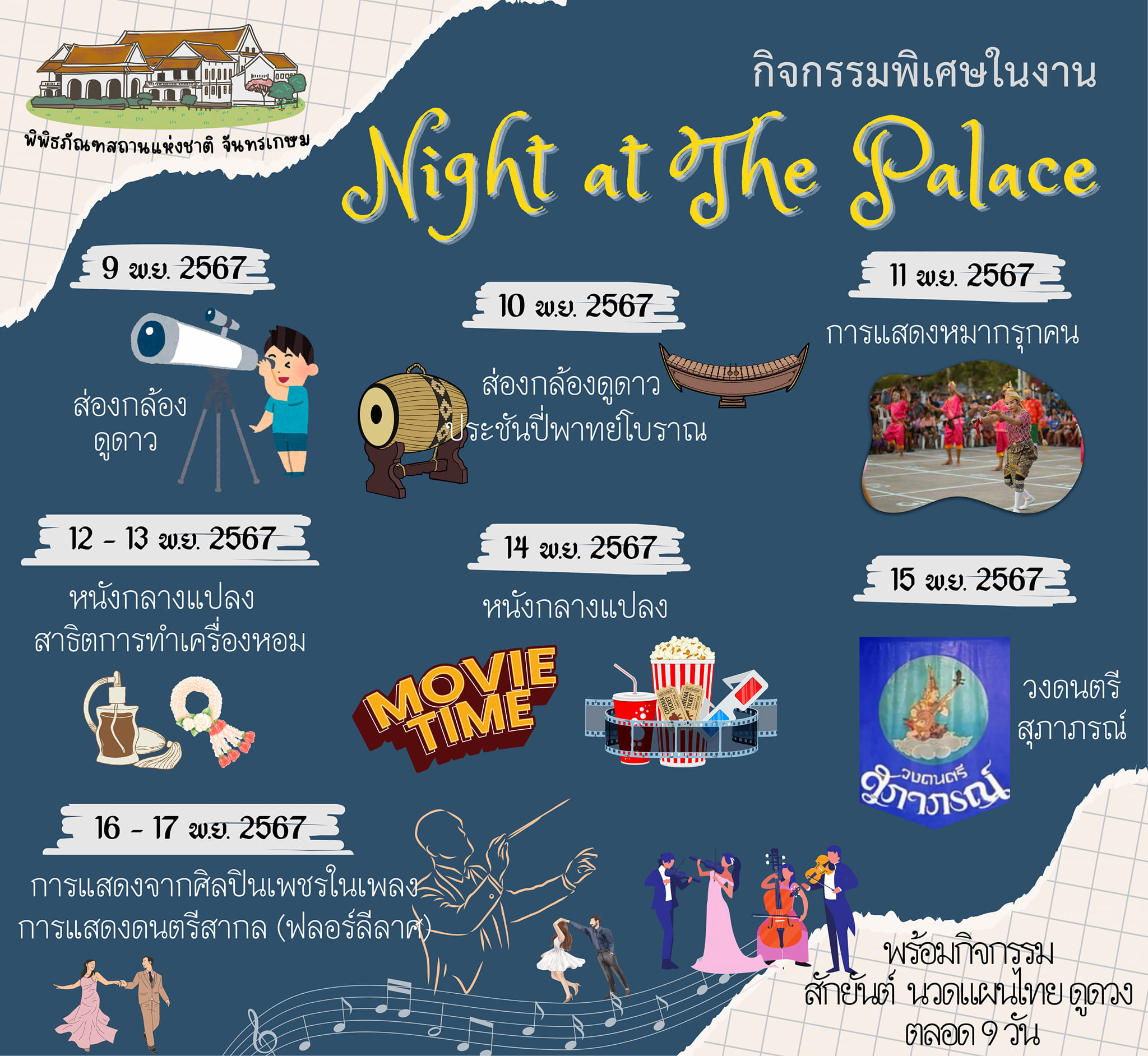 พิพิธภัณฑสถานแห่งชาติ จันทรเกษม ขอเชิญร่วมกิจกรรม Night at The Palace เริ่มเดินเล่นชมวังยามค่ำคืน ทุกศุกร์ เสาร์ อาทิตย์ ได้ตั้งแต่ 25 ตุลาคม 2567 เป็นต้นไป และเตรียมพบกับกิจกรรมอีกมากมายในงาน “4 วัด 1 วัง เมื่อครั้งต้นกรุงฯ” ณ วัดไชยวัฒนาราม วัดราชบูรณะ วัดมหาธาตุ วัดพระราม และพระราชวังจันทรเกษม ระหว่างวันที่ 9 - 17 พฤศจิกายน 2567