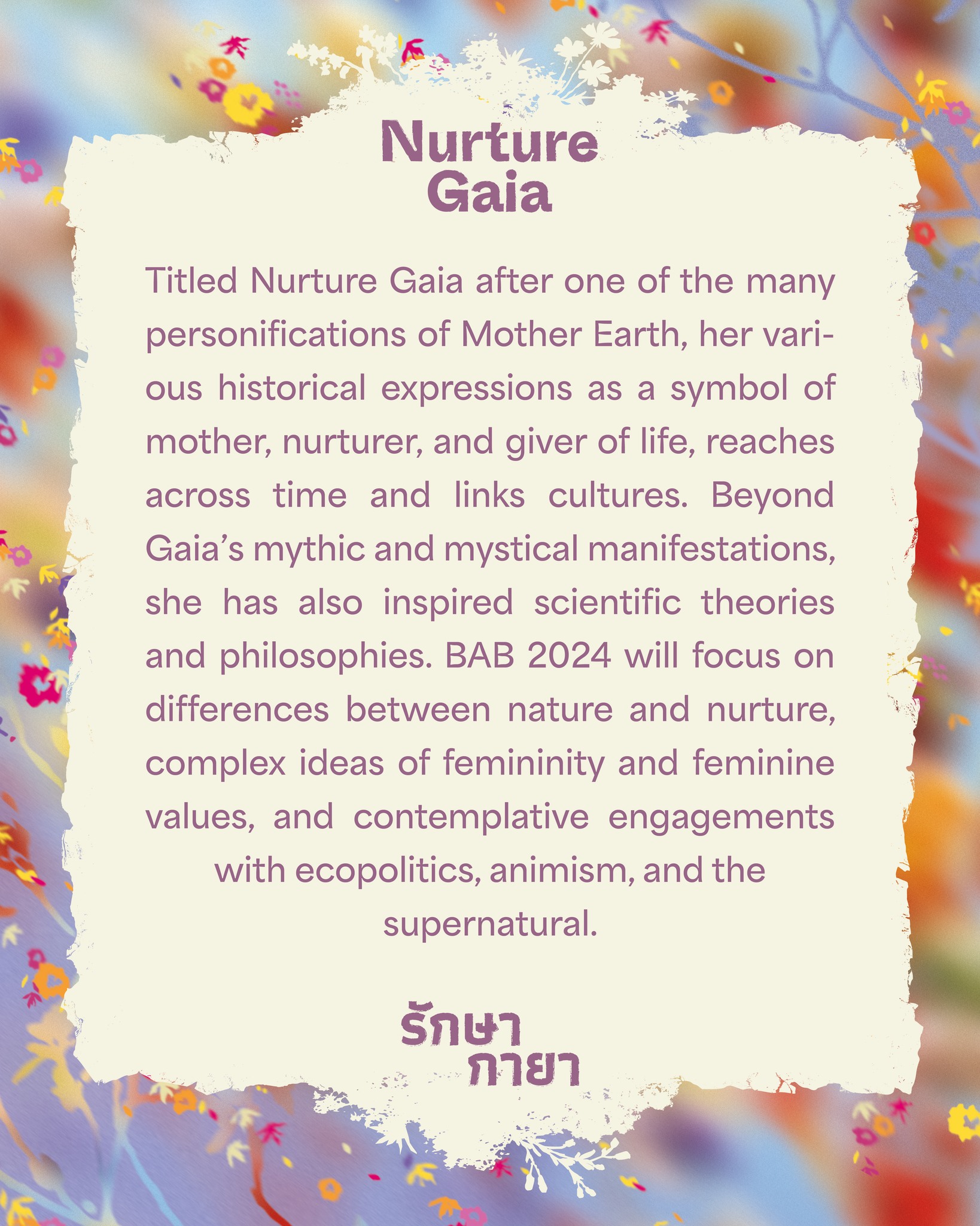 มาร่วมค้นหาความหมายที่แตกต่างของ “ไกอา” (Gaia) ภายใต้แนวคิด “รักษา กายา” (Nurture Gaia) ซึ่งได้รับแรงบันดาลใจมาจากชื่อของเทพี “ไกอา” หนึ่งในร่างของพระแม่ธรณี ซึ่งเป็นตัวแทนของแม่ผู้ให้กำเนิด และหล่อเลี้ยงสรรพชีวิต ที่ถูกกล่าวถึงมาเป็นเวลานานในหลากหลายช่วงเวลาและวัฒนธรรม ซึ่งแนวคิดดังกล่าวนี้จะทำให้ผู้ชมตระหนักถึงความสำคัญของไกอาในฐานะที่เป็นแม่ของแผ่นดิน ที่ถูกถ่ายทอดในรูปลักษณ์ที่หลากหลายตามบริบททางวัฒนธรรม ไปจนถึงตระหนักถึงการกระทำของมนุษย์ ซึ่งส่งผลต่อการเปลี่ยนแปลงสภาพภูมิอากาศในปัจจุบัน