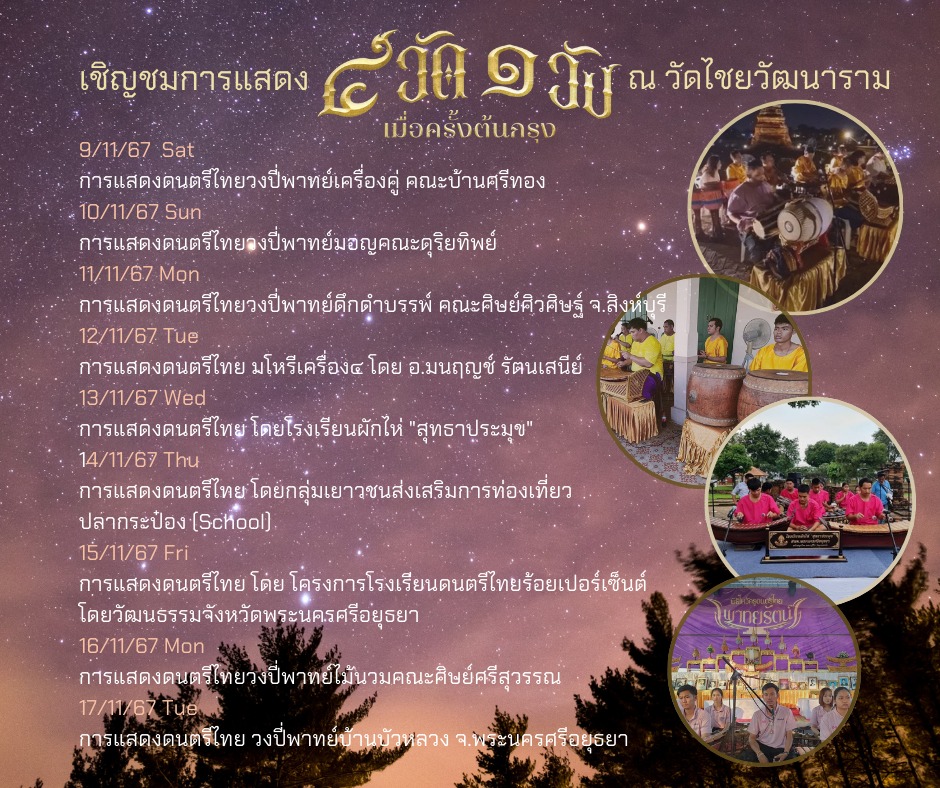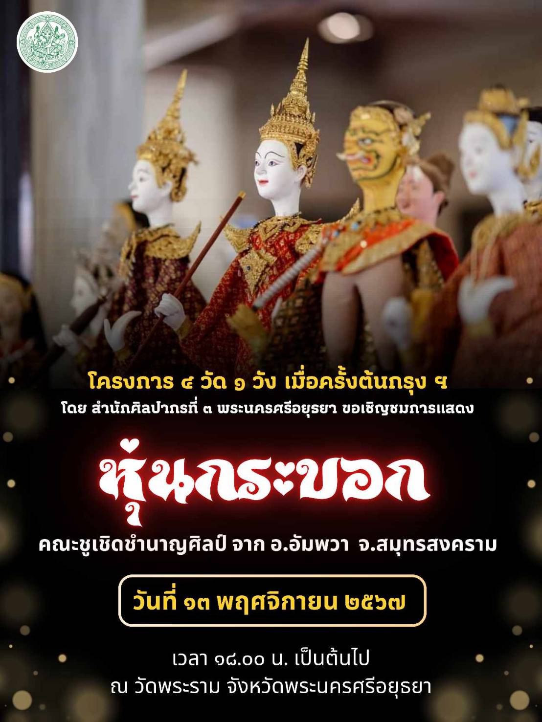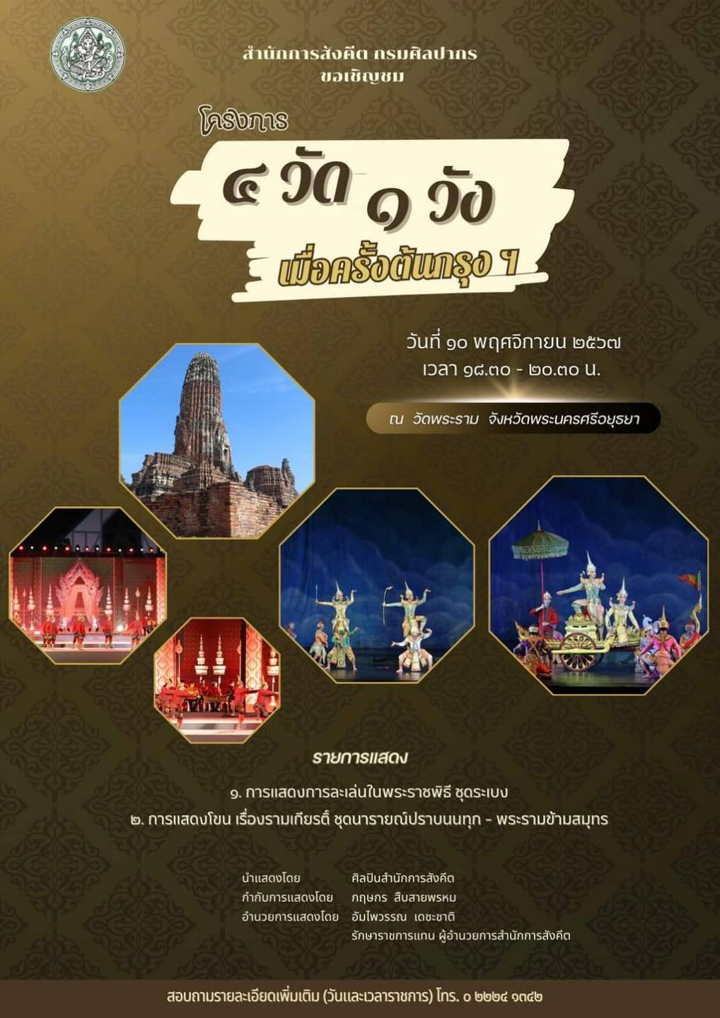 กรมศิลปากร ขอเชิญทุกท่านร่วมงาน “4 วัด 1 วัง เมื่อครั้งต้นกรุงฯ” เทศกาลท่องเที่ยวโบราณสถานยามค่ำคืน ระหว่างวันที่ 9 - 17 พฤศจิกายน 2567 ตั้งแต่ 18.00 น. เป็นต้นไป พบกับการแสดงมากมายตลอด 9 คืน ภายในโบราณสถานสำคัญของอยุธยา แต่ละที่มี Highlight ดังต่อไปนี้