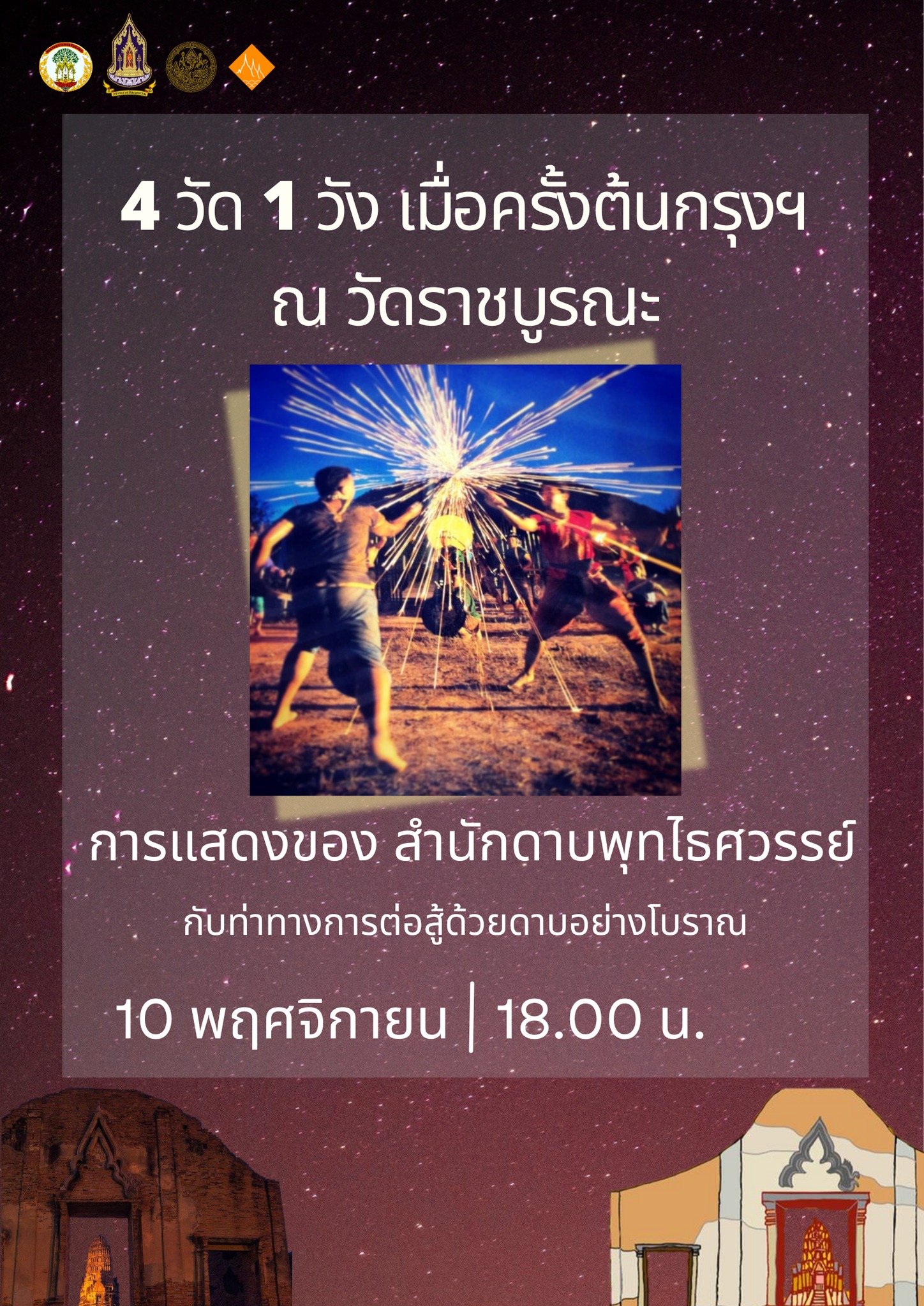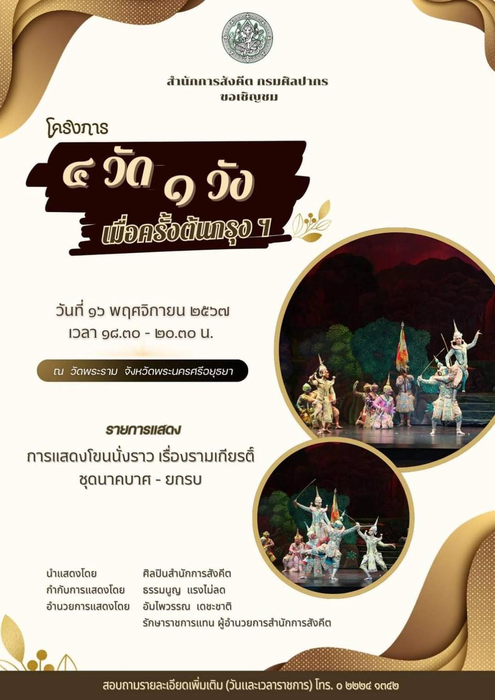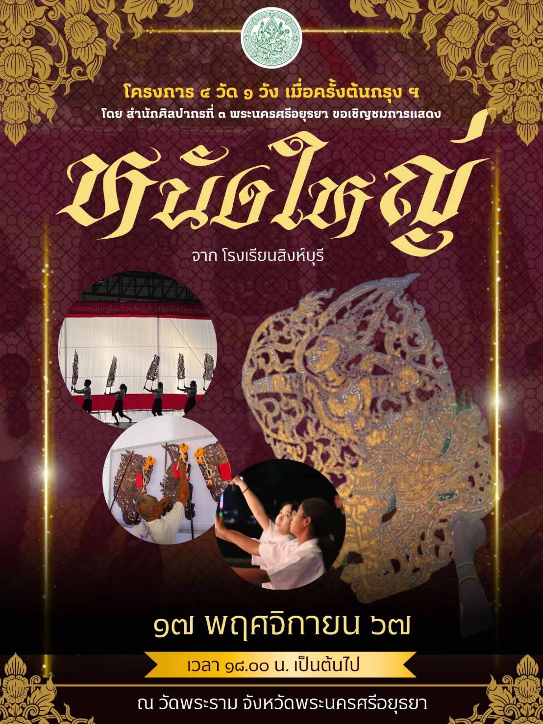 กรมศิลปากร ขอเชิญทุกท่านร่วมงาน “4 วัด 1 วัง เมื่อครั้งต้นกรุงฯ” เทศกาลท่องเที่ยวโบราณสถานยามค่ำคืน ระหว่างวันที่ 9 - 17 พฤศจิกายน 2567 ตั้งแต่ 18.00 น. เป็นต้นไป พบกับการแสดงมากมายตลอด 9 คืน ภายในโบราณสถานสำคัญของอยุธยา แต่ละที่มี Highlight ดังต่อไปนี้