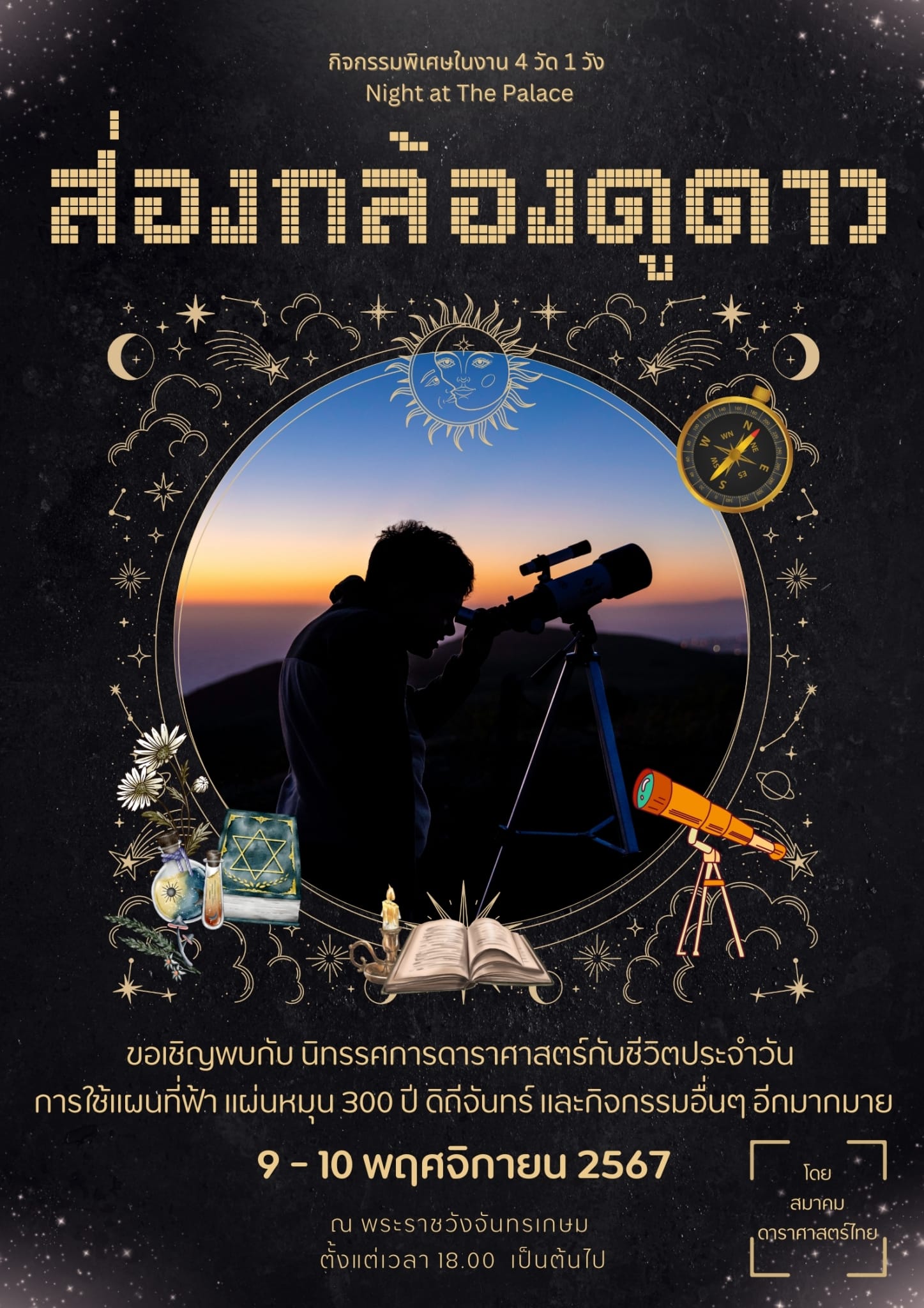 พิพิธภัณฑสถานแห่งชาติ จันทรเกษม ขอเชิญชวนร่วมกิจกรรมพิเศษในงาน 4 วัด 1 วัง เมื่อครั้งต้นกรุงฯ “Night at The Palace ย้อนเวลา ชมวัง 4 ศตวรรษ พระราชวังจันทรเกษม” พบการออกบูธนิทรรศการดาราศาสตร์กับชีวิตประจำวัน การใช้แผนที่ฟ้า แผ่นหมุน 300 ปี ดิถีจันทร์ และกิจกรรมอื่นๆ อีกมากมายในวันที่ 9 - 10 พฤศจิกายน 2567 ตั้งแต่เวลา 18.00 น. เป็นต้นไป
