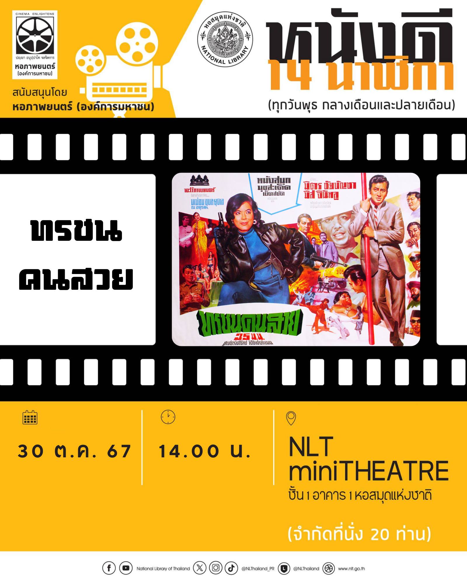 ในวันพุธที่ 30 ตุลาคม 2567 จัดฉายภาพยนตร์ เรื่อง “ทรชนคนสวย” (พ.ศ. 2510) ภาพยนตร์ไทยแนวสายลับผจญภัย ซึ่งเป็นหนังไทยเรื่องแรกที่มีการทำทริคภาพระยะไกลของเรือดำน้ำขนาดใหญ่ และฉากภายในที่มีรายละเอียดของอุปกรณ์ต่าง ๆ รวมทั้งฉากเรือดำน้ำระเบิดใต้ทะเล ตลอดจนเพลงฮิตรางวัลแผ่นเสียงทองคำพระราชทาน แมวเหมียว ของคณะสามศักดิ์ โดยเนื้อเรื่องเกี่ยวกับอดีตนายตำรวจหนุ่มตัดสินใจออกตามล่าแก๊งค้ายาเสพติดเพียงลำพัง แม้จะเป็นการฝ่าฝืนกฎหมายที่เขาเคยรับใช้ก็ตาม กระทั่งได้พบหลิน ลูกสาวอดีตหัวหน้าแก๊งคนก่อน ผู้เข้ามาร่วมมือกับนายตำรวจหนุ่มในการทลายแก๊ง เพื่อล้างแค้นคนที่สังหารพ่อเธอแล้วขึ้นครองอำนาจแทน ในขณะเดียวกันนักสืบไทยจากหน่วยต้านยาเสพติด ก็เข้ามาพัวพันกับการตามล่าล้างแค้นภายในแก๊งครั้งนี้ด้วย นำแสดงโดย มิตร ชัยบัญชา และ มิสจิ้นหลู ดาราสาวชาวไต้หวัน ร่วมด้วย แมน ธีระพล ,รุจน์ รณภพ ฯลฯ กำกับและอำนวยการสร้างโดย หม่อมอุบล ยุคล ณ อยุธยา ความยาว 130 นาที และอนุรักษ์ภาพยนตร์ โดยหอภาพยนตร์ (องค์การมหาชน) กำหนดการฉายภาพยนตร์ เวลา 14.00 น. ณ ห้อง NLT mini theatre อาคาร 1 ชั้น 1 (จำกัดที่นั่ง 20 ท่าน)
