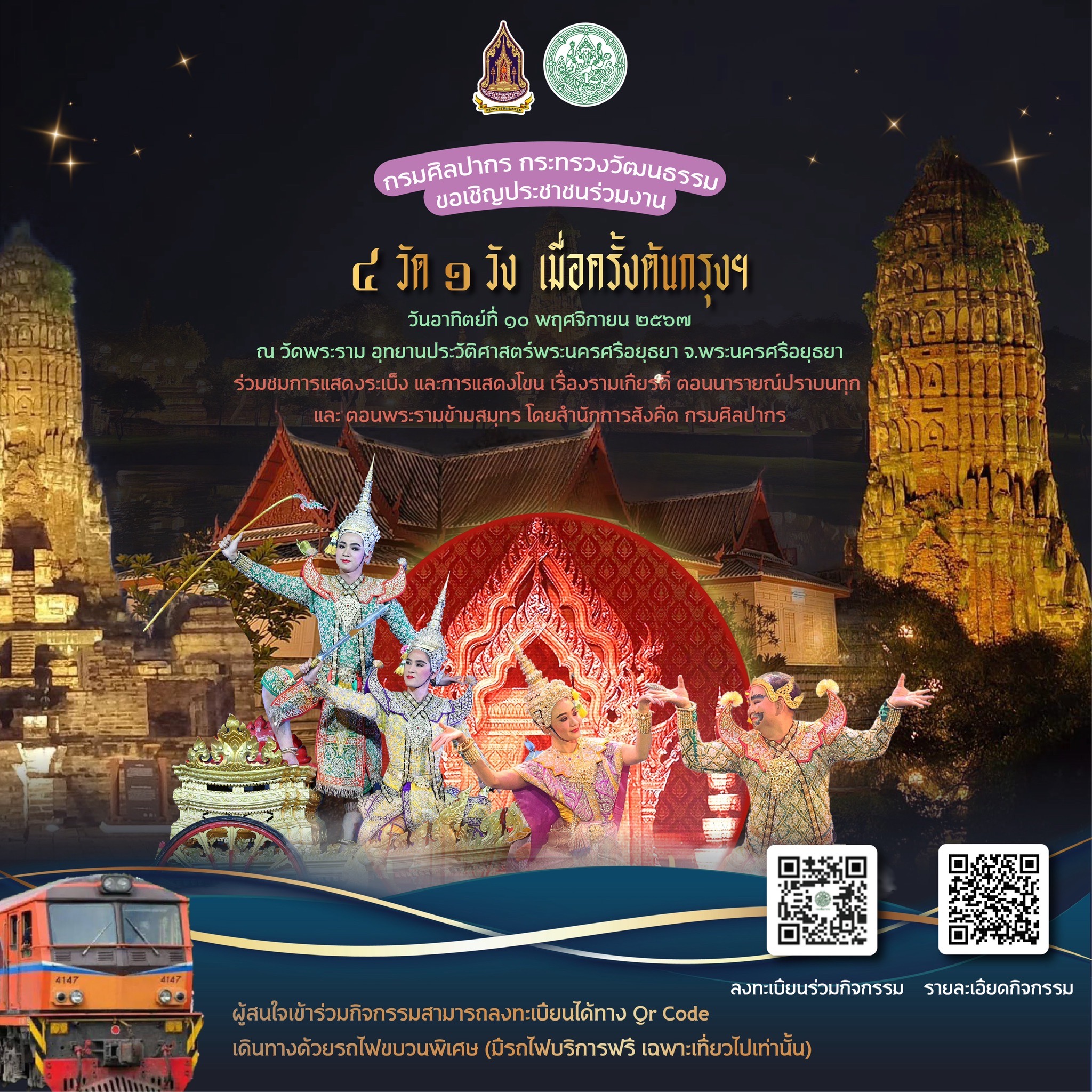 อย่าพลาดโอกาสสำคัญในครั้งนี้ มาร่วมเดินทางย้อนเวลากลับไปสู่ช่วงต้นกรุงศรีอยุธยา พร้อมทั้งดื่มด่ำกับบรรยากาศโบราณสถานยามค่ำคืน ได้ที่งาน “4 วัด 1 วัง เมื่อครั้งต้นกรุงฯ” ในวันที่ 9 - 17 พฤศจิกายน 2567 ที่จังหวัดพระนครศรีอยุธยา ตั้งแต่เวลา 18.00 น. เป็นต้นไป สอบถามรายละเอียดเพิ่มเติมได้ที่เพจเฟซบุ๊ก อุทยานประวัติศาสตร์พระนครศรีอยุธยา Ayutthaya Historical Park