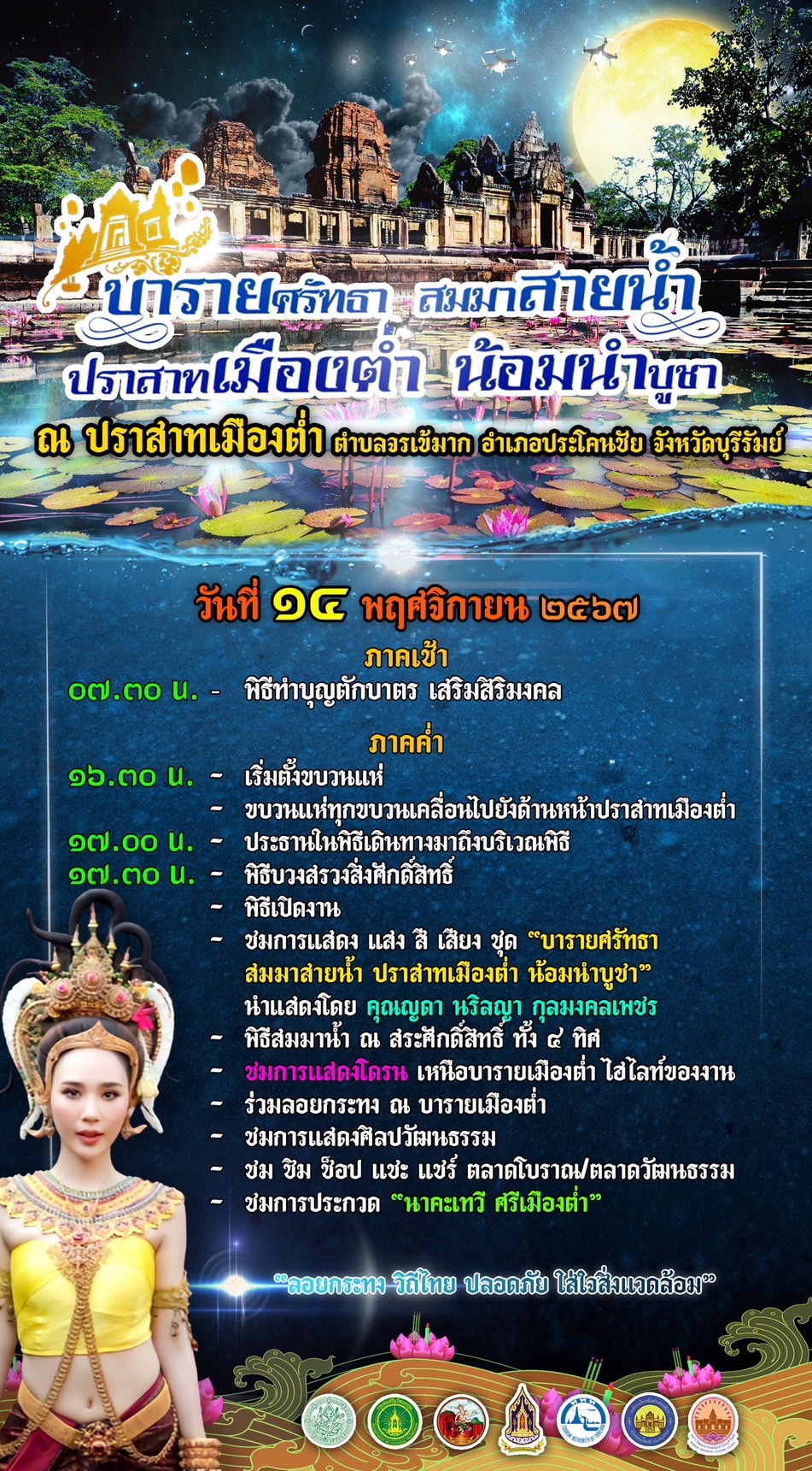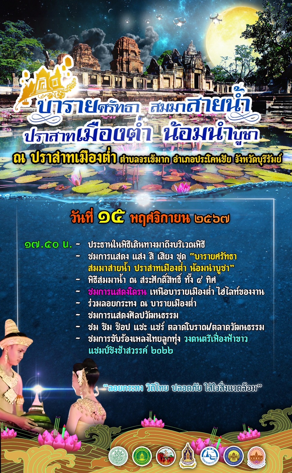จังหวัดบุรีรัมย์ ขอเชิญร่วมงานสืบสานประเพณีลอยกระทง "บารายศรัทธา สมมาสายน้ำ ปราสาทเมืองต่ำ น้อมนำบูชา” จังหวัดบุรีรัมย์ ระหว่างวันที่ 14 - 15 พฤศจิกายน 2567 ณ บริเวณปราสาทเมืองต่ำ ตำบลจรเข้มาก อำเภอประโคนชัย จังหวัดบุรีรัมย์ สอบถามข้อมูลเพิ่มเติมได้ที่ สำนักงานวัฒนธรรมจังหวัดบุรีรัมย์ โทร. 0 4466 6577