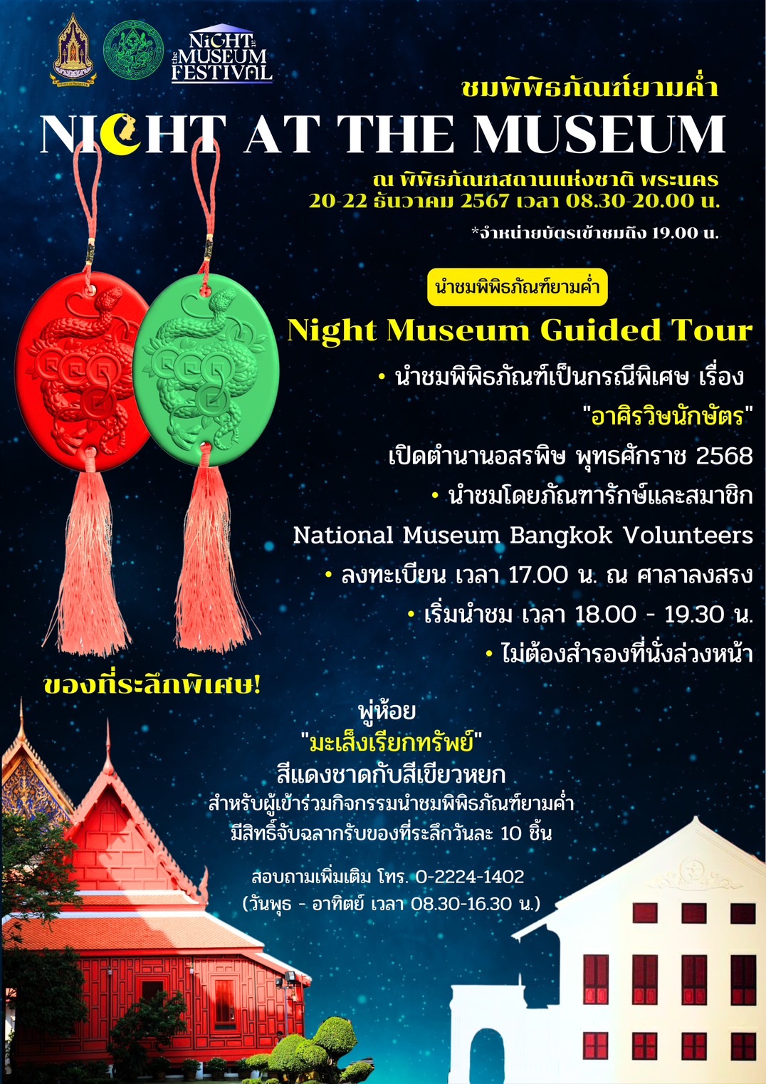 - นำชมพิพิธภัณฑ์ยามค่ำ (Night Museum Guided Tour) นำชมพิพิธภัณฑ์เป็นกรณีพิเศษ ในหัวข้อ "อาศิรวิษนักษัตร เปิดตำนานอสรพิษ พุทธศักราช ๒๕๖๘" โดยภัณฑารักษ์และ National Museum Volunteers ภาษาไทยและภาษาต่างประเทศ เปิดรับลงทะเบียน เวลา ๑๗.๐๐ น. เริ่มนำชม เวลา ๑๘.๐๐ - ๑๙.๓๐ น. (วันละ ๑ รอบเท่านั้น) โดยไม่ต้องสำรองที่นั่งล่วงหน้า